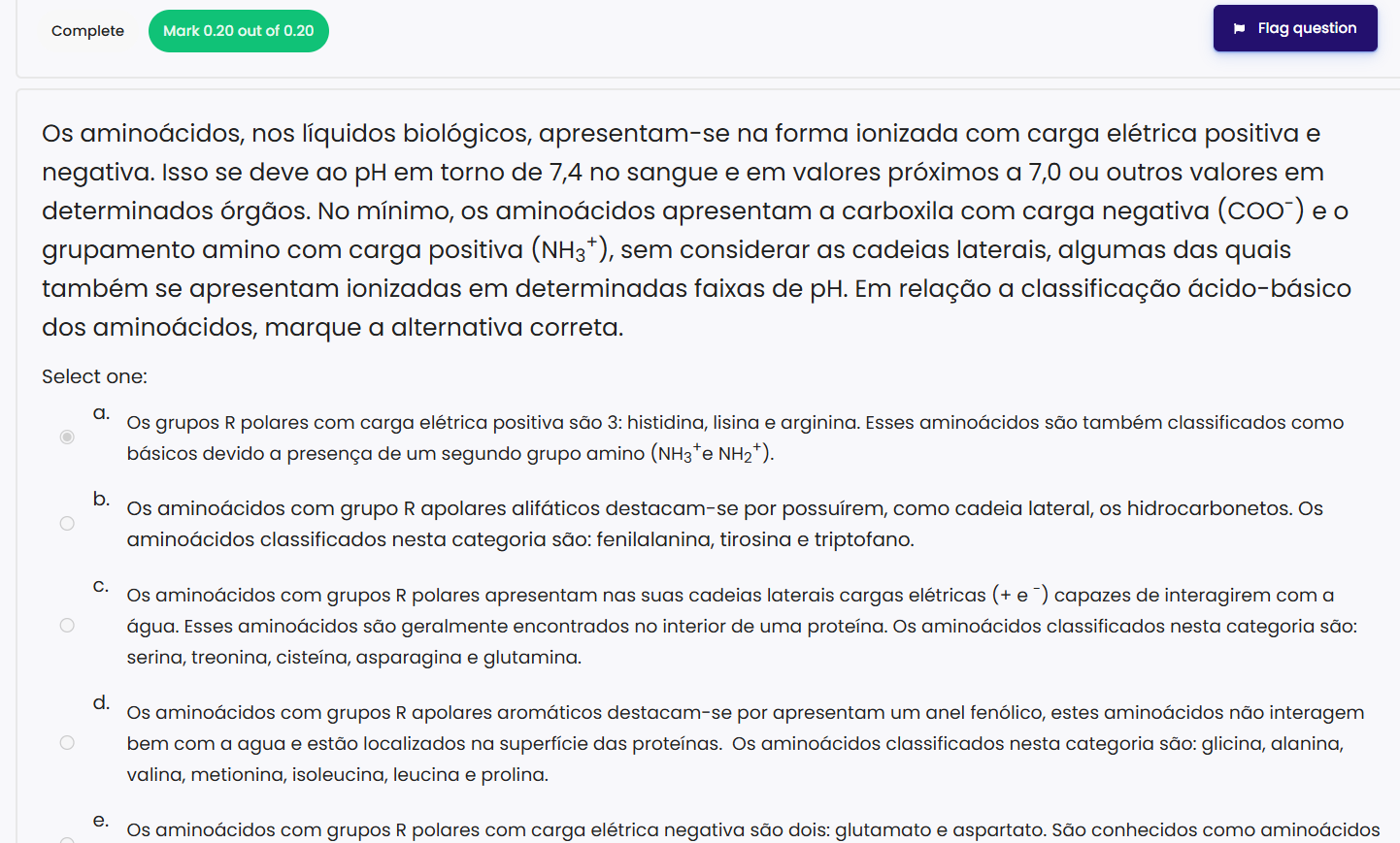 <p>Complete Mark 0.20 out of 0.20 Flag question Os aminoácidos, nos líquidos biológicos, apresentam-se na forma ionizada com carga elétrica positiva e negativa. Isso se deve ao pH em torno de 7,4 no sangue e em valores próximos a 7,0 ou outros valores em determinados órgãos. No mínimo, os aminoácidos apresentam a carboxila com carga negativa (coo-) e grupamento amino com carga positiva sem considerar as cadeias laterais, algumas das quais também se apresentam ionizadas em determinadas faixas de pH. Em relação a classificação ácido-básico dos aminoácidos, marque a alternativa correta. Select one: a. Os grupos R polares com carga elétrica positiva são 3: histidina, e arginina. Esses aminoácidos são também classificados como básicos devido a presença de um segundo grupo amino b. Os aminoácidos com grupo R apolares alifáticos destacam-se por como cadeia lateral, os hidrocarbonetos. Os aminoácidos classificados nesta categoria são: fenilalanina, tirosina e triptofano. C. Os aminoácidos com grupos R polares apresentam nas suas cadeias laterais cargas elétricas capazes de interagirem com a água. Esses aminoácidos são geralmente encontrados no interior de uma proteína. Os aminoácidos classificados nesta categoria são: serina, treonina, cisteína, asparagina e glutamina. d. Os aminoácidos com grupos R apolares destacam-se por apresentam um anel fenólico, estes aminoácidos não interagem bem com a agua e estão localizados na superfície das proteínas. Os aminoácidos classificados nesta categoria são: glicina, alanina, valina, metionina, isoleucina, e prolina. e. Os aminoácidos com grupos R polares com carga elétrica negativa são dois: glutamato e aspartato. São conhecidos como aminoácidos</p>