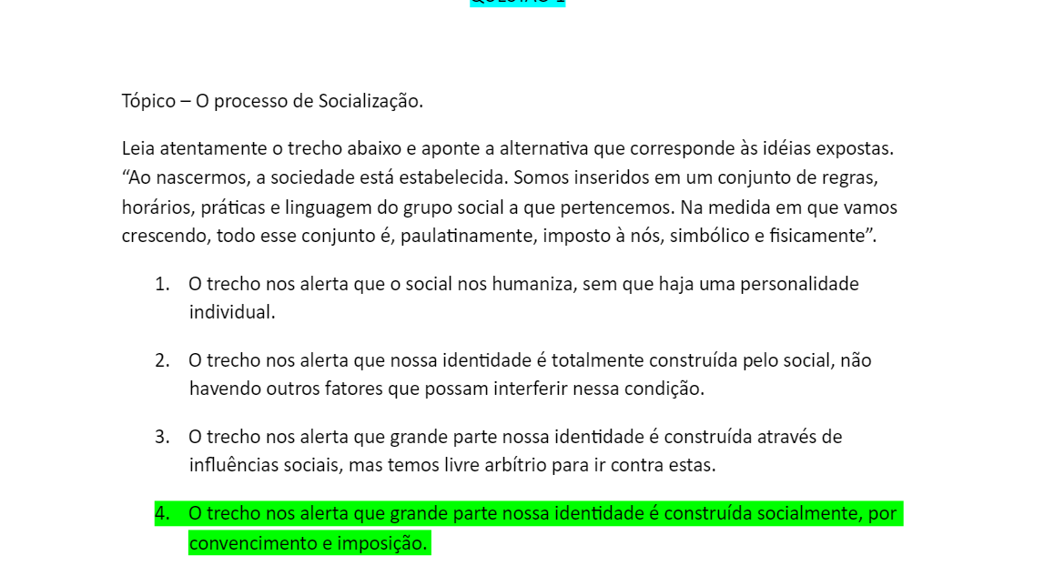 <p>Tópico - o processo de Socialização. Leia atentamente o trecho abaixo e aponte a alternativa que corresponde às idéias expostas. "Ao nascermos, a sociedade está estabelecida. Somos inseridos em um conjunto de regras, horários, práticas e linguagem do grupo social a que pertencemos. Na medida em que vamos crescendo, todo esse conjunto é, paulatinamente, imposto à nós, simbólico e fisicamente". 1. o trecho nos alerta que o social nos humaniza, sem que haja uma personalidade individual. 2. o trecho nos alerta que nossa identidade é totalmente construída pelo social, não havendo outros fatores que possam interferir nessa condição. 3. o trecho nos alerta que grande parte nossa identidade é construída através de influências sociais, mas temos livre arbítrio para ir contra estas. 4. o trecho nos alerta que grande parte nossa identidade é construída socialmente, por convencimento e imposição.</p>