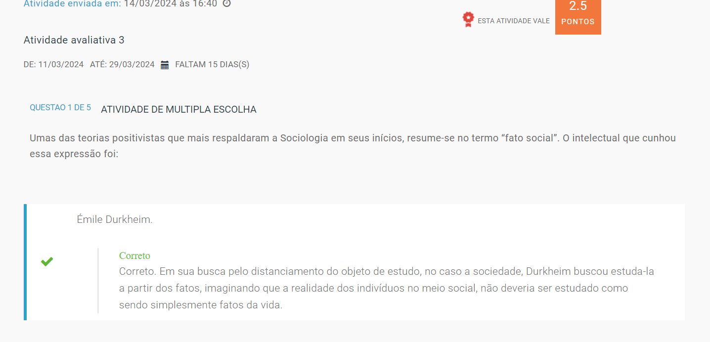 <p>Atividade enviada em: 14/03/2024 16:40 2.5 ESTA ATIVIDADE VALE PONTOS Atividade avaliativa 3 DE: 11/03/2024 29/03/2024 FALTAM 15 DIAS(S) QUESTAO 1 DE 5 ATIVIDADE DE MULTIPLA ESCOLHA Umas das teorias positivistas que mais respaldaram a Sociologia em seus inícios, resume-se no termo "fato social". o intelectual que cunhou essa expressão foi: Émile Correto Correto. Em sua busca pelo distanciamento do objeto de estudo, no caso a sociedade, Durkheim buscou estuda-la a partir dos fatos, imaginando que a realidade dos indivíduos no meio social, não deveria ser estudado como sendo simplesmente fatos da vida.</p>