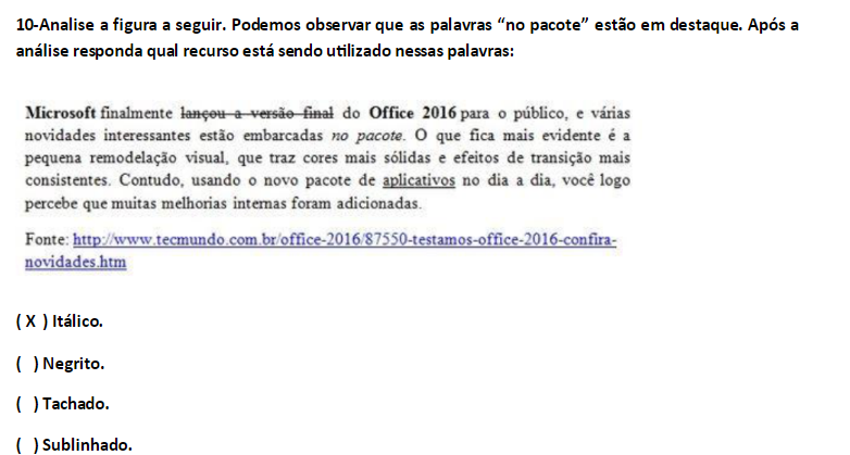 <p>10-Analise a figura a seguir. Podemos observar que as palavras "no pacote" estão em destaque. Após a análise responda qual recurso está sendo utilizado nessas palavras: Microsoft finalmente lançou a versão final do Office 2016 para e várias novidades interessantes estão embarcadas no pacote. que fica mais evidente é a pequena remodelação visual, que traz cores mais sólidas e efeitos de transição mais usando novo pacote de aplicativos no dia a dia, você logo percebe que muitas melhorias internas foram Fonte: novidades.htm (X) Itálico. ( ) Negrito. ( ) Tachado.</p>