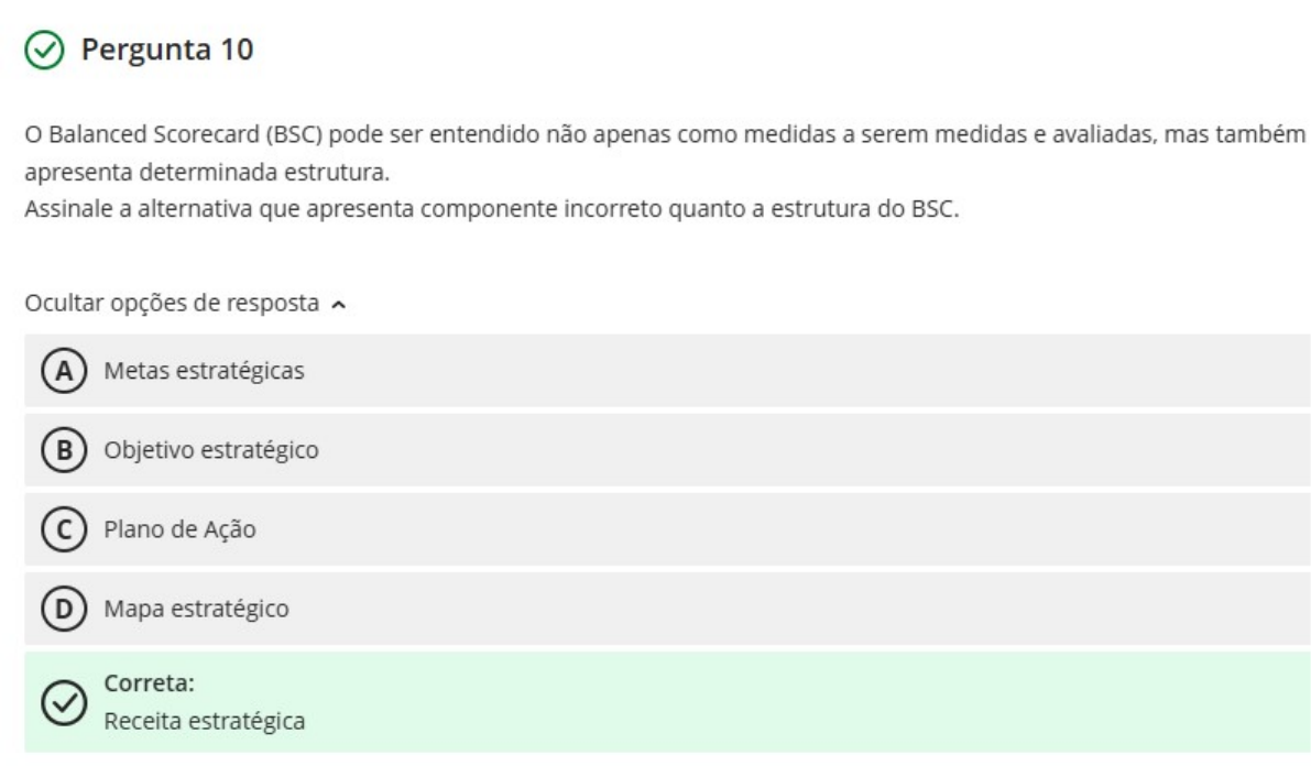 <p>Pergunta 10 Balanced Scorecard (BSC) pode ser entendido não apenas como medidas a serem medidas e avaliadas, mas também apresenta determinada estrutura. Assinale a alternativa que apresenta componente incorreto quanto a estrutura do BSC. Ocultar opções de resposta A Metas estratégicas B Objetivo estratégico C Plano de Ação D Mapa estratégico Correta: Receita estratégica</p><p>0,5/0,5 como uma ferramenta estratégica. Como toda ferramenta gerencial e estratégica o BSC Resposta correta</p>