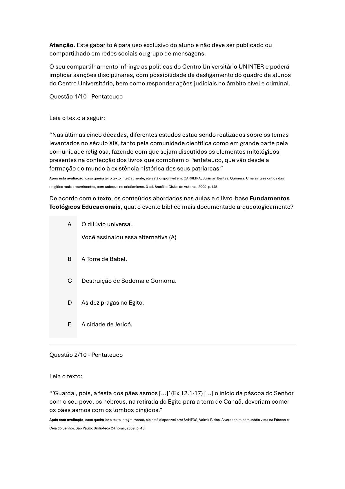 <p>Atenção. Este gabarito é para uso exclusivo do aluno e não deve ser publicado ou compartilhado em redes sociais ou grupo de mensagens. O seu compartilhamento infringe as políticas do Centro Universitário UNINTER e poderá implicar sanções disciplinares, com possibilidade de desligamento do quadro de alunos do Centro Universitário, bem como responder ações judiciais no âmbito cível e criminal. Questão 1/10 Pentateuco Leia o texto a seguir: "Nas últimas cinco décadas, diferentes estudos estão sendo realizados sobre os temas levantados no século XIX, tanto pela comunidade científica como em grande parte pela comunidade religiosa, fazendo com que sejam discutidos os elementos mitológicos presentes na confecção dos livros que compõem o Pentateuco, que vão desde a formação do mundo à existência histórica dos seus patriarcas." Após esta avaliação, caso queira ler o texto integralmente, ele está disponível em: CARREIRA, Suriman Bentes. Quimera. Uma síntese crítica das religiões mais proeminentes, com enfoque no cristianismo. 3 ed. Brasília: Clube de Autores, 2009. p.145. De acordo com o texto, os conteúdos abordados nas aulas e o livro-base Fundamentos Teológicos Educacionais, qual o evento bíblico mais documentado arqueologicamente? A dilúvio universal. Você assinalou essa alternativa (A) B A Torre de Babel. C Destruição de Sodoma e Gomorra. D As dez pragas no Egito. E A cidade de Questão 2/10 Pentateuco Leia o texto: "Guardai, pois, a festa dos pães asmos [...]' (Ex 12.1-17) [...] o início da páscoa do Senhor com o seu povo, os hebreus, na retirada do Egito para a terra de deveriam comer os pães asmos com os lombos cingidos." Após esta avaliação, caso queira ler o texto integralmente, ele está disponível em: SANTOS, Valmir P. A verdadeira comunhão vista na Páscoa e Ceia do Senhor. São Paulo: Biblioteca 24 horas, 2009. p. 45.</p><p>De acordo com o texto acima, os conteúdos abordados nas aulas de Pentateuco e o livro- base Fundamentos Teológicos Educacionais, na instituição da Páscoa, juntamente com o cordeiro, deveriam ser comidos pães asmos e as ervas amargas, os quais simbolizam, respectivamente: A Pães da sinceridade e do perdão. B Pães do amor e do perdão. C Pães do arrependimento e a fé. D Pães do amor e do arrependimento. E Pães da sinceridade e arrependimento. Você assinalou essa alternativa (E) Questão 3/10 Pentateuco Leia o excerto de texto a seguir: "A caixa não era grande [...]. Três objetos hebraicos mais preciosos ficavam na arca: uma jarra de ouro contendo o maná intacto, a vara de Arão que floresceu muito tempo depois de ter sido cortada e as preciosas tábuas de pedra tocadas pelo dedo de Deus ao serem gravas." Após esta avaliação, caso queira ler o texto integralmente, ele está disponível em: LUCADO, Max. o melhor de Max Lucado. 3 livros em 1. 2 ed. Rio de Janeiro: Thomas Nelson Brasil, 2011. Cap. 13. Conforme o texto acima, os conteúdos abordados nas aulas de Pentateuco e o livro-base Fundamentos Teológicos Educacionais, qual é o significado, para o Novo Testamento, da vara de Arão que floresceu (a qual foi guardada na arca da aliança)? Assinale a alternativa correta: A Deus guarda o seu povo nos momentos de aflição, de sequidão, de dor. B Fala da ressurreição do Senhor Jesus, o qual depois de ter sido visto por inúmeras testemunhas, incontestáveis, e depois subiu aos céus e assentou-se "à direita da majestade nas alturas." Você assinalou essa alternativa (B) C Da mesma forma que a vara de Arão floresceu, nós também florescemos quando cremos em</p><p>D Refere-se ao nascimento da Igreja de Cristo na terra, a qual ao longo dos anos têm florescido e E Somos chamados a florescer onde estamos plantados, isto é, a dar frutos de vida, de caráter, Questão 4/10 Pentateuco Leia o texto a seguir: "Sendo o livro de Levítico, como é, um manual para o bom desempenho das funções sacerdotais, apresenta certo destaque para as ofertas e sacrifícios. Compreender o que é, e o que significa cada uma destas ofertas, pode ser de grande ajuda para o entendimento do texto". Após esta avaliação, caso queira ler o texto integralmente, ele está disponível em: GUSSO, Antônio Renato. o Pentateuco. Introdução fundamental e auxílios para a interpretação. Curitiba: AD Santos, p. 61. De acordo com o texto, os conteúdos abordados nas aulas e o livro-base Fundamentos Teológicos Educacionais, há uma relação de ofertas que deveriam ser realizadas pelos israelitas no Dia da Expiação, as quais são descritas no livro de Levítico. Qual a única oferta dentre as mencionadas neste livro que não era realizada com sangue? Assinale a alternativa correta: A O holocausto. B A oferta de manjares. Você assinalou essa alternativa (B) C A oferta pacífica. D A oferta pelo pecado. E A oferta pela culpa. Questão 5/10 Pentateuco Leia o texto: "Na relação com os eventos do Novo Testamento, os acontecimentos e as pessoas do Antigo Testamento se tornam tipos para os antítipos do Novo Testamento, superiores</p><p>Após esta avaliação, caso queira ler o texto integralmente, ele está disponível em: Antonius H. J. Teologia Bíblica do Antigo Testamento: uma história da religião de Israel na perspectiva Série biblioteca de estudos do Antigo São Paulo: Ed. Loyola, 2005. p.50. De acordo com o texto, os conteúdos abordados nas aulas e no livro-base Fundamentos Teológicos Educacionais, o livro de apresenta muitas tipologias. Quanto aos diversos elementos presentes no relacione os tipos encontrados no Antigo Testamento aos seus respectivos significados no Novo Testamento: 1. altar do incenso 2. A mesa dos pães 3. castiçal de ouro ( ) Representa Cristo, o intercessor, e também ensina-nos que uma vida de oração é imprescindível para agradar a ( ) Representa a Cristo, a luz do mundo. Refere-se ainda ao fato de que Israel deveria ser a "luz dos gentios" dando testemunho por meio de uma vida san