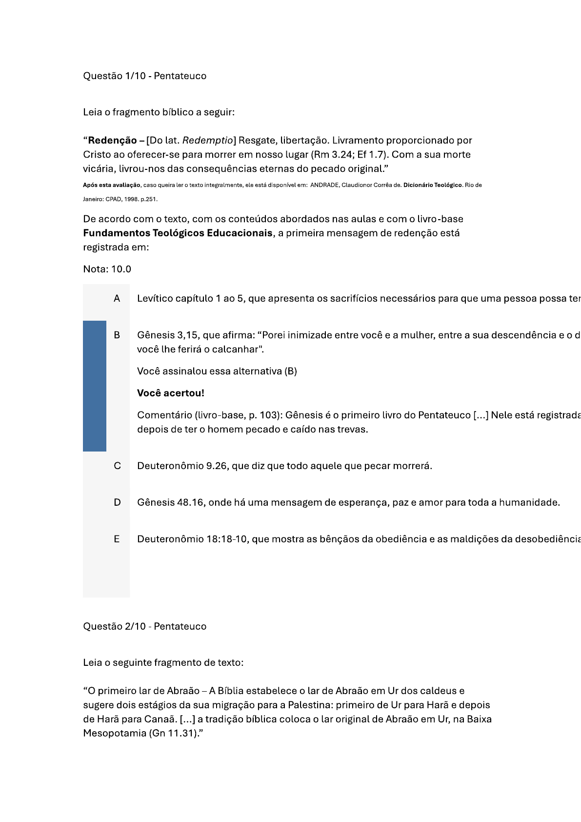 <p>Questão 1/10 - Pentateuco Leia o fragmento bíblico a seguir: "Redenção [Do lat. Redemptio] Resgate, libertação. Livramento proporcionado por Cristo ao oferecer-se para morrer em nosso lugar (Rm 3.24; Ef 1.7). Com a sua morte vicária, livrou-nos das consequências eternas do pecado original." Após esta avaliação, caso queira ler o texto integralmente, ele está disponível em: ANDRADE, Claudionor Corrêa de. Dicionário Teológico. Rio de Janeiro: CPAD, 1998. p.251. De acordo com o texto, com os conteúdos abordados nas aulas e com o livro-base Fundamentos Teológicos Educacionais, a primeira mensagem de redenção está registrada em: Nota: 10.0 A Levítico capítulo 1 ao 5, que apresenta os sacrifícios necessários para que uma pessoa possa ter B Gênesis 3,15, que afirma: "Porei inimizade entre você e a mulher, entre a sua descendência e o você lhe ferirá o calcanhar". Você assinalou essa alternativa (B) Você acertou! Comentário (livro-base, p. 103): Gênesis é o primeiro livro do Pentateuco [...] Nele está registrada depois de ter o homem pecado e caído nas trevas. C Deuteronômio 9.26, que diz que todo aquele que pecar morrerá. D Gênesis 48.16, onde há uma mensagem de esperança, paz e amor para toda a humanidade. E Deuteronômio 18:18-10, que mostra as bênçãos da obediência e as maldições da desobediência Questão 2/10 Pentateuco Leia o seguinte fragmento de texto: "O primeiro lar de - A Bíblia estabelece o lar de Abraão em dos caldeus e sugere dois estágios da sua migração para a Palestina: primeiro de Ur para Harã e depois de Harã para [...] a tradição bíblica coloca o lar original de Abraão em Ur, na Baixa Mesopotamia (Gn 11.31)."</p><p>Após esta avaliação, caso queira ler o texto integralmente, ele está disponível em: THOMPSON, John A. A Bíblia e a Arqueologia. São Paulo: Vida Cristã, 2002. p. 35-36. De acordo com o texto citado, com os conteúdos abordados nas aulas e com o livro-base Fundamentos Teológicos Educacionais, Mesopotâmia significa: Nota: 10.0 A Terra entre rios, pois está localizada entre os rios Tigre e Eufrates. Você assinalou essa alternativa (A) Você acertou! Comentário: Toda a região compreendida entre os rios Eufrates e Tigre chama-se Mesopotâmia 102). B Terra fértil, pois é a área mais fértil do Egito. C Território montanhoso, onde fica o Sinai. D Deserto e está localizada ao sul de Israel. E Terra sem vegetação, e refere-se a uma montanha a 940m acima do nível do mar. Questão 3/10 - Pentateuco Leia o fragmento bíblico a seguir: "E apascentava Moisés o rebanho de Jetro, seu sogro, sacerdote em Midiã; [...] E apareceu-lhe o anjo do Senhor em uma chama de fogo do meio duma sarça; [...] Moisés disse: Agora me virarei para lá, e verei esta grande visão, porque a sarça não se queima. [...] bradou Deus a ele do meio da sarça, e disse: Moisés, Moisés. Respondeu ele: Eis-me aqui." Após esta avaliação, caso queira ler o texto integralmente, ele está disponível em: BÍBLIA. Tradução: Almeida Revista e Atualizada. São Paulo: Sociedade Bíblica do Brasil, 2015. Velho Testamento. Capítulo 3.1-4. Conforme o texto citado acima, os conteúdos abordados nas aulas e o livro-base Fundamentos Teológicos Educacionais, a teofania apresentada no capítulo 3 de em que o próprio Deus se manifesta a Moisés em uma sarça ardente, é importante pois: Nota: 0.0Você não pontuou essa questão A Deus se revela a Moisés como o grande ser Supremo e Criador. Você assinalou essa alternativa (A)</p><p>B Tem-se a identificação de Deus como Emanuel. C Deus se identifica como "Eu sou o que sou". Comentário (livro-base, p. 118): Primeiramente, temos a identificação de Deus. Ao perguntar Seu Sou o que Sou" 3.14). Um conceito de divindade muito diferente do usual entre os povos. D Deus se revela a Moisés como o grande El Shadai. E Tem-se a identificação de Deus como Pai. Questão 4/10 - Pentateuco Leia o fragmento de texto a seguir: "Esta carta compara as revelações do Antigo e do Novo Testamento ponto a ponto. O Antigo Testamento é a revelação divina, que ofereceu grandes benefícios para Israel como o povo especial de Deus. Mas o Novo Testamento é uma revelação superior, e seus benefícios não são apenas superiores [...]." Após esta avaliação, caso queira ler o texto integralmente, ele está disponível em: RICHARDS, Larry. Fácil para entender a Bíblia. Rio de Janeiro: Thomas Nelson do Brasil, 2013. Capítulo 22. De acordo com o texto, com os conteúdos abordados nas aulas e com o livro-base Fundamentos Teológicos Educacionais, os tipos e sombras do Antigo Testamento foram cumpridos no Novo Testamento. Qual o livro do Novo Testamento que consiste quase que inteiramente em referências ao Antigo Testamento, mostrando a superioridade de Cristo em relação a Moisés, ao tabernáculo, sacrifícios levíticos: Nota: 10.0 A I e epístola aos Coríntios. B Evangelho de Mateus. C Epístola aos Hebreus. Você assinalou essa alternativa (C) Você acertou! Comentário (livro-base, p.154): Os tipos e sombras do Antigo Testamento foram cumpridos no N inteiramente em referências ao Antigo Testamento: Cristo como a realidade revela ser melhor do que Josué, do que Abraão, do que Arão, do que o primeiro tabernáculo, do que os sacrifícios levít testemunhas na galeria dos quadros da fé e, finalmente, seu sangue revela ser melhor que o sang</p><p>D Evangelho de Lucas. E Atos dos Apóstolos. Questão 5/10 - Pentateuco Atente para o seguinte excerto de texto: "A designação dada à Arca tem a ver com o vocábulo hebraico arown beriyth, que significa 'cofre', de madeira', 'baú', Era o objeto mais valioso de todos os demais do porque ocupava o primeiro lugar na vida religiosa de Israel." Após esta avaliação, caso queira ler o texto integralmente, ele está disponível em: CABRAL, o Símbolos da obra redentora de Cristo. Rio de Janeiro: CPAD, 2019. p. 110. Conforme o fragmento de texto, os