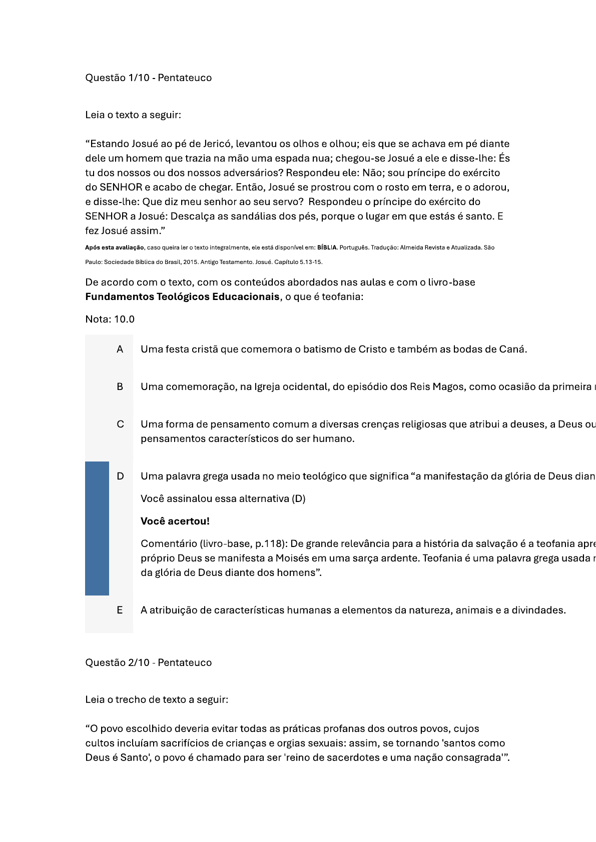 <p>Questão 1/10 Pentateuco Leia o texto a seguir: "Estando Josué ao pé de Jericó, levantou os olhos e olhou; eis que se achava em pé diante dele um homem que trazia na mão uma espada nua; chegou-se Josué a ele e disse-lhe: És tu dos nossos ou dos nossos adversários? Respondeu ele: Não; sou príncipe do exército do SENHOR e acabo de chegar. Então, Josué se prostrou com o rosto em terra, e o adorou, e disse-lhe: Que diz meu senhor ao seu servo? Respondeu o príncipe do exército do SENHOR a Josué: as sandálias dos pés, porque o lugar em que estás é santo. E fez Josué assim." Após esta avaliação, caso queira ler o texto integralmente, ele está disponível em: BÍBLIA. Português. Tradução: Almeida Revista e Atualizada. São Paulo: Sociedade Bíblica do Brasil, 2015. Antigo Testamento. Josué. Capítulo 5.13-15. De acordo com o texto, com os conteúdos abordados nas aulas e com o livro-base Fundamentos Teológicos Educacionais, o que é teofania: Nota: 10.0 A Uma festa cristã que comemora o batismo de Cristo e também as bodas de Caná. B Uma comemoração, na Igreja ocidental, do episódio dos Reis Magos, como ocasião da primeira C Uma forma de pensamento comum a diversas crenças religiosas que atribui a deuses, a Deus ou pensamentos característicos do ser humano. D Uma palavra grega usada no meio teológico que significa "a manifestação da glória de Deus dian Você assinalou essa alternativa (D) Você acertou! Comentário (livro-base, p.118): De grande relevância para a história da salvação é a teofania próprio Deus se manifesta a Moisés em uma sarça ardente. Teofania é uma palavra grega usada da glória de Deus diante dos homens". E A atribuição de características humanas a elementos da natureza, animais e a divindades. Questão 2/10 Pentateuco Leia o trecho de texto a seguir: "O povo escolhido deveria evitar todas as práticas profanas dos outros povos, cujos cultos incluíam sacrifícios de crianças e orgias sexuais: assim, se tornando 'santos como Deus é Santo', o povo é chamado para ser de sacerdotes e uma nação</p><p>Após esta avaliação, caso queira ler o texto integralmente, ele está disponível em: BÍBLIA. Bíblia de Estudo Conselheira. Nova Tradução na Linguagem de Hoje. São Paulo: Sociedade Bíblica do Brasil, 2014. Comentário Levítico. Considerando o excerto citado, os conteúdos abordados nas aulas e o livro-base de Fundamentos Teológicos Educacionais, sobre o Pentateuco, as ofertas de sangue descritas em Levítico, têm duas classes, que são: Nota: 10.0 A Restituição e consagração. B Cheiro suave e restituição. Você assinalou essa alternativa (B) Você acertou! Comentário (livro-base, p.136): As ofertas de sangue têm duas classes: cheiro suave e restituição C Santidade e consagração. D Cheiro suave e perdão. E Restituição e manjares. Questão 3/10 - Pentateuco Leia o fragmento bíblico a seguir: "E apascentava Moisés o rebanho de Jetro, seu sogro, sacerdote em [...] apareceu-lhe o anjo do Senhor em uma chama de fogo do meio duma sarça; Moisés disse: Agora me virarei para lá, e verei esta grande visão, porque a sarça não se queima. [...] bradou Deus a ele do meio da sarça, e disse: Moisés, Moisés. Respondeu ele: Eis-me aqui." Após esta avaliação, caso queira ler o texto integralmente, ele está disponível em: BÍBLIA. Tradução: Almeida Revista e Atualizada. São Paulo: Sociedade Bíblica do Brasil, 2015. Velho Testamento. Capítulo 3.1-4. Conforme o texto citado acima, os conteúdos abordados nas aulas e o livro-base Fundamentos Teológicos Educacionais, a teofania apresentada no capítulo 3 de em que o próprio Deus se manifesta a Moisés em uma sarça ardente, é importante pois: Nota: 10.0 A Deus se revela a Moisés como o grande ser Supremo e Criador.</p><p>B Tem-se a identificação de Deus como Emanuel. C Deus se identifica como "Eu sou o que sou". Você assinalou essa alternativa (C) Você acertou! Comentário (livro-base, p. 118): Primeiramente, temos a identificação de Ao perguntar Seu Sou o que Sou" 3.14). Um conceito de divindade muito diferente do usual entre os povos. D Deus se revela a Moisés como o grande El Shadai. E Tem-se a identificação de Deus como Pai. Questão 4/10 Pentateuco Leia o seguinte fragmento de texto: "O primeiro lar de Abraão - A Bíblia estabelece o lar de Abraão em Un dos caldeus e sugere dois estágios da sua migração para a Palestina: primeiro de Ur para Harã e depois de Harã para [...] a tradição bíblica coloca o lar original de Abraão em Ur, na Baixa Mesopotamia (Gn 11.31)." Após esta avaliação, caso queira ler o texto integralmente, ele está disponível em: THOMPSON, John A. A Bíblia e a Arqueologia. São Paulo: Vida Cristã, 2002. p. 35-36. De acordo com o texto citado, com os conteúdos abordados nas aulas e com o livro-base Fundamentos Teológicos Educacionais, Mesopotâmia significa: Nota: 10.0 A Terra entre rios, pois está localizada entre os rios Tigre e Eufrates. Você assinalou essa alternativa (A) Você acertou! Comentário: Toda a região compreendida entre os rios Eufrates e Tigre chama-se Mesopotâmia ( 102). B Terra fértil, pois é a área mais fértil do Egito. C Território montanhoso, onde fica o Sinai.</p><p>D Deserto e está localizada ao sul de Israel. E Terra sem vegetação, e refere-se a uma montanha a 940m acima do nível do mar. Questão 5/10 - Pentateuco Leia o trecho de texto a seguir: "Deuteronômio foi a palavra grega escolhida como título do livro pelos sábios de Alexandria, no Egito, que fizeram sua tradução do grego, no século três antes de Cristo". Após esta avaliação, caso queira ler o texto integralmente, ele está disponível em: BÍBLIA. Bíblia de Estudo Conselheira. Nova Tradução na Linguagem de Hoje. São Paulo: Sociedade Bíblica do Brasil, 2015. Comentário Observando o texto citado, os conteúdos abordados nas aulas e o livro-base Fundamentos Teológicos Educacionais, o tí