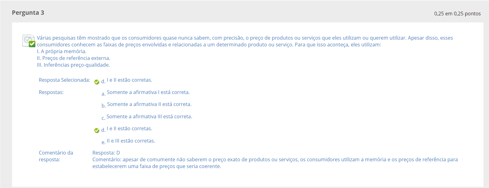 <p>Pergunta 3 0,25 em 0,25 pontos Várias pesquisas têm mostrado que os consumidores quase nunca sabem, com precisão, preço de produtos ou serviços que eles utilizam ou querem utilizar. Apesar disso, esses consumidores conhecem as faixas de preços envolvidas e relacionadas a um determinado produto ou Para que isso aconteça, eles utilizam: I. A própria II. Preços de referência externa. III. Inferências Resposta Selecionada: d. e estão Respostas: a. Somente a afirmativa está correta. b. Somente a afirmativa está correta. C. Somente a afirmativa III está correta. d. e estão corretas. e. e III estão corretas. Comentário da Resposta: D resposta: Comentário: apesar de comumente não saberem preço exato de produtos ou serviços, os consumidores utilizam a memória e os preços de referência para estabelecerem uma faixa de preços que seria coerente.</p>