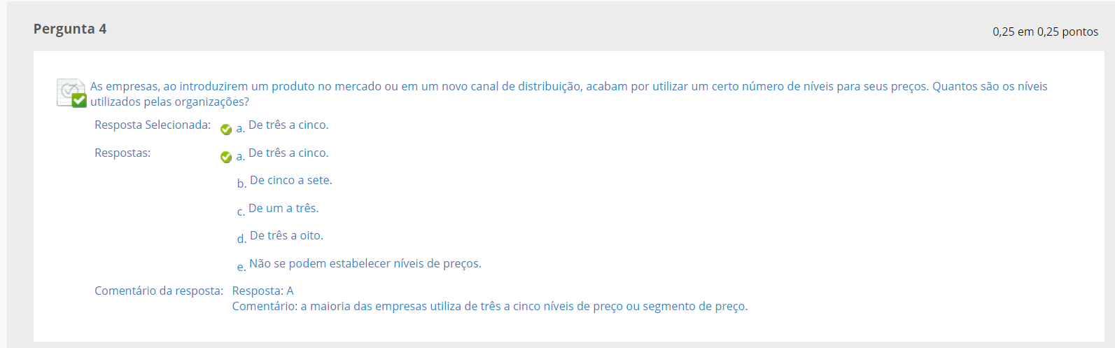 <p>Pergunta 4 0,25 em 0,25 pontos As empresas, ao introduzirem um produto no mercado ou em um novo canal de distribuição, acabam por utilizar um certo número de níveis para seus preços. Quantos são os níveis utilizados pelas organizações? Resposta Selecionada: De três a cinco. a. Respostas: a. De três a cinco. b. De cinco a sete. C. De um a d. De três a oito. e. Não se podem estabelecer níveis de preços. Comentário da resposta: Resposta A Comentário: a maioria das empresas utiliza de três a cinco níveis de preço ou segmento de preço.</p>