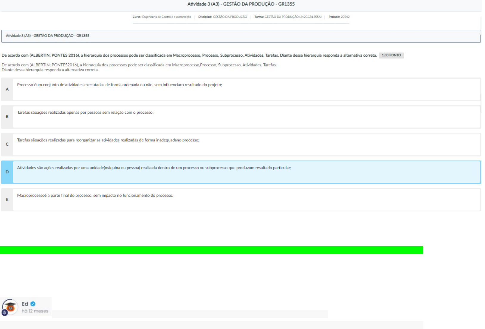 <p>• Pergunta 1</p><p>De acordo com (ALBERTIN; PONTES 2016), a hierarquia dos processos pode ser classificada em Macroprocesso, Processo, Subprocesso, Atividades, Tarefas. Diante dessa hierarquia responda a alternativa correta.</p><p>a. Atividades são ações realizadas por uma unidade (máquina ou pessoa) realizada dentro de um processo ou subprocesso que produz um resultado particular;</p><p>b. Macroprocesso é a parte final do processo, sem impacto no funcionamento do processo.</p><p>c. Tarefas são ações realizadas para reorganizar as atividades realizadas de forma inadequada no processo;</p><p>d. Tarefas são ações realizadas apenas por pessoas sem relação com o processo;</p><p>e. Processo é um conjunto de atividades executadas de forma ordenada ou não, sem influenciar o resultado do projeto;</p><p>De acordo com a hierarquia dos processos descrita por Albertin e Pontes (2016), a alternativa correta é:</p><p>a. Atividades são ações realizadas por uma unidade (máquina ou pessoa) realizada dentro de um processo ou subprocesso que produz um resultado particular.</p><p>• Pergunta 2</p><p>• Pergunta 2</p><p>Mostre que você sabe o que são desperdícios da produção enxuta! Relacione os desperdícios listados abaixo com os exemplos que correspondentes.</p><p>1. Superprodução.</p><p>2. Espera.</p><p>3. Movimentação.</p><p>4. Transporte.</p><p>5. Defeito.</p><p>( ) Mecânico procurando a ferramenta que não encontra.</p><p>( ) Empilhadeira que utiliza um percurso mais longo, pois a porta de acesso mais próxima é estreita demais.</p><p>( ) Produzir além do necessário, para o caso de surgir um novo pedido de compra.</p><p>( ) Fazer um ajuste na conexão para garantir que ficou bem encaixada.</p><p>( ) Trabalhador parado enquanto a máquina produz.</p><p>Agora, assinale a alternativa que apresenta a sequência correta.</p><p>A. 4 3 1 5 2</p><p>B. 2 3 5 4 1</p><p>C. 3 1 5 4 2</p><p>D. 3 4 1 5 2</p><p>E. 2 5 4 1 3</p><p>• Pergunta 3</p><p>• Pergunta 3</p><p>“O mapeamento do fluxo de valor (MFV) é uma ferramenta qualitativa de produção enxuta amplamente usada com o objetivo de eliminar desperdícios ou, ...</p><p>“O mapeamento do fluxo de valor (MFV) é uma ferramenta qualitativa de produção enxuta amplamente usada com o objetivo de eliminar desperdícios ou, em japonês, muda. Em muitos processos, o desperdício pode chegar a 60%”. (KRAJEWSKI, L; MALHORTA, M.; RITZMAN, E. L. Administração de Produção e Operações. São Paulo: Pearson Education, 2017, p. 243).</p><p>Com base nos seus conhecimentos sobre o Mapeamento do Fluxo de Valor (MFV), avalie quais afirmativas estão corretas.</p><p>I. O Mapa do Estado Atual deve ser feito observando o processo produtivo desde sua origem, na chegada da matéria-prima, seguindo o fluxo dos materiais.</p><p>II. Deve-se registrar as informações sobre cada processo que está sendo mapeado, como o tempo de ciclo, o tempo de troca de ferramentas, o tempo disponível por turno e a quantidade de trabalhadores na operação.</p><p>III. Para criar um fluxo enxuto no mapa de estado futuro é importante determinar o ritmo de produção adequado com base no Tempo Takt.</p><p>IV. O Mapeamento dos Valores Atuais e o Mapeamento dos Desperdícios são etapas do MVF.</p><p>Assinale a alternativa que apresenta as afirmativas corretas.</p><p>A. I, II, IV.</p><p>B. I, II, IV.</p><p>C. I, III, IV.</p><p>D. I, II, III.</p><p>E. II, III.</p><p>• Pergunta 4</p><p>2,5,1,3,4</p><p>• Pergunta 4</p><p>“Conta-se que Frank Gilbreth (fundador do estudo do método) participou de uma conferência científica com um artigo intitulado “A melhor maneira de vestir-se de manhã”. Em sua apresentação, ele deixou a audiência científica perplexa ao analisar a “melhor” maneira de abotoar o colete de manhã. Entre suas conclusões, o colete devia ser abotoado de baixo para cima (para tornar mais fácil arrumar a gravata no mesmo movimento; abotoar de cima para baixo requer que as mãos sejam novamente levantadas)”. Frank Gilbreth, contemporâneo de Taylor, é um dos expoentes da Administração Científica, seu trabalho, juntamente com o trabalho de sua mulher, ainda é referência no estudo dos métodos e dos movimentos. Ele foi um dos primeiros a utilizar símbolos para o estudo dos movimentos. (SLACK, N.; BRANDON-JONES, A.; JOHNSTON, R. Administração da produção. São Paulo: Atlas, 2018, p. 215).</p><p>Considerando a importância dos símbolos, e do que você aprendeu sobre o uso dos símbolos em um</p><p>fluxograma, relacione os símbolos com a descrição correspondente.</p><p>Fonte: Elaborado pelo autor, 2019.</p><p>( ) Operação.</p><p>( ) Espera.</p><p>( ) Armazenagem.</p><p>( ) Inspeção.</p><p>( ) Transporte.</p><p>Agora, assinale a alternativa que apresenta a sequência correta.</p><p>A. 1 4 5 2 3</p><p>B. 2 5 1 3 4</p><p>C. 3 1 5 4 2</p><p>D. 3 2 4 5 1</p><p>E. 2 5 3 1 4</p><p>• Pergunta 5</p><p>• Pergunta 5</p><p>De acordo com (LELIS, 2014), o Mapeamento de Fluxo de Valor (MFV) é uma ferramenta muito importante na produção enxuta e é utilizada para identificação das atividades que agregam valor no fluxo de produção. Ele consiste em um mapa visual que retrata cada processo no fluxo dos materiais e informações e é um instrumento utilizado para evitar desperdícios, sendo que o MFV consiste em quatro etapas básicas para o seu desenvolvimento, tais como:</p><p>I. Identificar os Desperdícios</p><p>II. Elaborar Plano de Implantação;</p><p>III. Desenhar Mapa do Estado Futuro;</p><p>IV. Desenhar Mapa do Estado Atual.</p><p>Assim, podemos afirmar que para definir um MFV, a sequência obrigatória é:</p><p>A. IV; I; III e II</p><p>B. II; III, IV e I</p><p>C. I; III; IV e II</p><p>D. I; II; III e IV</p><p>E. III; II; IV e I</p><p>• Pergunta 6</p><p>Como podemos definir claramente um mapa de processos? a. Uma ferramenta que descreve de forma textual todas as ocorrências durante um processo or...</p><p>