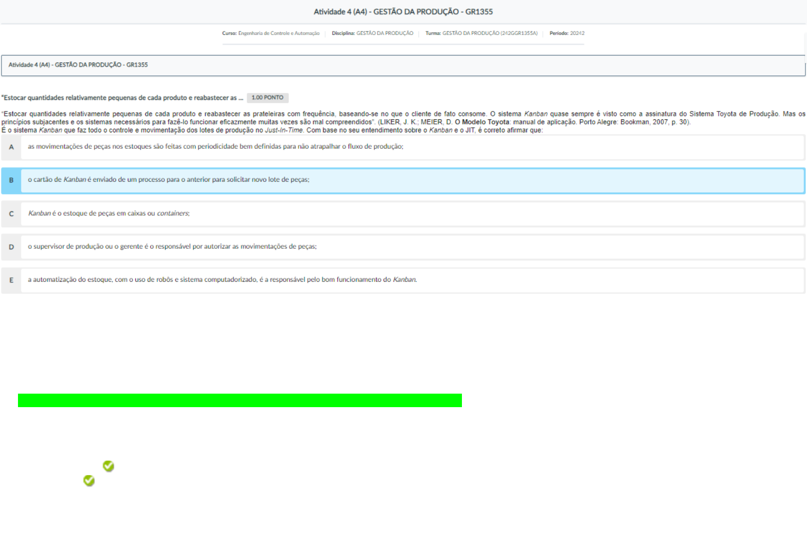 <p>• Pergunta 1</p><p>“Estocar quantidades relativamente pequenas de cada produto e reabastecer as prateleiras com frequência, baseando-se no que o cliente de fato consome. O sistema Kanban quase sempre é visto como a assinatura do Sistema Toyota de Produção. Mas os princípios subjacentes e os sistemas necessários para fazê-lo funcionar eficazmente muitas vezes são mal compreendidos”. (LIKER, J. K.; MEIER, D. O Modelo Toyota: manual de aplicação. Porto Alegre: Bookman, 2007, p. 30).</p><p>É o sistema Kanban que faz todo o controle e movimentação dos lotes de produção no Just-In-Time. Com base no seu entendimento sobre o Kanban e o JIT, é correto afirmar que:</p><p>A. As movimentações de peças nos estoques são feitas com periodicidade bem definidas para não atrapalhar o fluxo de manutenção:</p><p>B. O cartão de Kanban é enviado de um processo para o anterior para solicitar novo lote de peças:</p><p>C. Kanban é o estoque de peças em caixas ou containers do kanban.</p><p>D. O supervisor de produção ou o gerente é o responsável por autorizar as movimentações de peças:</p><p>E. A automatização do estoque, com o uso de robôs e sistema computadorizado é a responsável pelo bom funcionamento do kanban.</p><p>Resposta Selecionada: o cartão de Kanban é enviado de um processo para o anterior para solicitar novo lote de peças;</p><p>Resposta Correta: o cartão de Kanban é enviado de um processo para o anterior para solicitar novo lote de peças;</p><p>Feedback da resposta: Perfeito! Normalmente o sistema kanban é operacionalizado com o uso de cartões que são utilizados para a solicitação e movimentação da caixa ou container com as peças a serem processadas.</p><p>• Pergunta 2</p><p>“Os supermercados, geralmente, abastecem o estoque na loja apenas quando os clientes retiram produtos suficientes das prateleiras. O movimento de bens do depósito para a prateleira é acionado apenas pelo sinal de demanda da “prateleira vazia”. Construtoras cada vez mais criam uma regra de pedir materiais para seus canteiros apenas no dia anterior à quando o material for necessário. Isso reduz o acúmulo e as chances de roubo”. (SLACK, N.; BRANDON-JONES, A.; JOHNSTON, R. A administração da produção. São Paulo: Atlas, 2018, p. 559).</p><p>O texto acima cita exemplos da aplicação da produção puxada em um supermercado e em uma construtora.</p><p>Sobre a produção puxada, avalie as alternativas abaixo e marque a correta.</p><p>A. Na produção puxada os processos buscam produzir da forma mais eficiente possível para gerar um estoque intermediário.</p><p>B. Cada processo produz conforme o planejado e passa o lote produzido para o próximo processo na produção puxada.</p><p>C. O estoque funciona como um pulmão na produção puxada, evitando problemas no processo.</p><p>D. Quanto maiores os lotes, maiores são as chances de a produção puxada funcionar sem interrupções.</p><p>E. Na produção puxada os processos se tornam dependentes uns dos outros, pois não há estoque.</p><p>Resposta Selecionada: Na produção puxada os processos se tornam dependentes uns dos outros, pois não há estoque.</p><p>Resposta Correta: Na produção puxada os processos se tornam dependentes uns dos outros, pois não há estoque.</p><p>Comentário da resposta: Resposta correta. Na produção puxada o estoque é visto como algo que encobre e mascara os problemas, gerando desperdícios em cascata. Por isso, deve ser eliminado.</p><p>• Pergunta 3</p><p>“Ser ‘enxuto’ virou um jargão empresarial. Um executivo de uma corporação, ao ouvir falar do sucesso de seus concorrentes com um programa enxuto, poderia dizer para um subordinado: ‘temos que ser enxutos para sobreviver neste mercado competitivo. Faça um curso, consiga um certificado nesse tal de negócio enxuto e volte para pôr em prática’. Se fosse tão fácil assim... O subordinado, quase sempre um administrador de nível médio ou engenheiro, faz o curso, começa a usar uma série de termos intrigantes, como kanban, andon, jidoka, heijunka, takt-time, etc. e volta saturado e sobrecarregado. ‘Por onde começo? `, ele pergunta”. (LIKER, J.; MEIER, D. O Modelo Toyota: manual de aplicação. Porto Alegre: Bookman, 2007, p. 44).</p><p>Os termos intrigantes da produção enxuta representam as diferentes técnicas e ferramentas desse sistema de produção. Demonstre que você conhece esses termos relacionando cada termo à sua aplicação. Selecione a alternativa que indica a sequência correta:</p><p>(1) Kanban.</p><p>(2) Andon.</p><p>(3) Jidoka.</p><p>(4) 5 Porquês.</p><p>(5) SMED.</p><p>( ) Redução do tempo de troca de ferramentas.</p><p>( ) Sinalização luminosa ou sonora.</p><p>( ) Controle de produção e movimentação de materiais.</p><p>( ) Interromper a produção em caso de anormalidades.</p><p>( ) Encontrar a causa raiz de um problema.</p><p>Resposta Selecionada: 5, 2, 1, 3, 4.</p><p>• Pergunta 4</p><p>“A maioria das pessoas não têm tempo para dedicar muito tempo cozinhando – possivelmente, o motivo pelo qual o chef celebridade Jamie Oliver escreveu o livro Refeições de 30 minutos do Jamie, cuja filosofia é que cozinhar um delicioso jantar deve ser tão rápido e mais barato do que comprar e aquecer uma comida pronta. O livro apresenta 50 menus prontos, com três a quatro pratos por menu, projetados para não demorar mais de 30 minutos no preparo. Para alcançar esse desempenho Jamie, talvez inadvertidamente, aplicou os princípios e métodos de produção enxuta à atividade cotidiana de cozinhar”. (SLACK, N.; BRANDON-JONES, A.; JOHNSTON, R. Administrao da produção. São Paulo: Atlas, 2018, p. 560). Não é exagero afirmar que os princípios da produção enxuta podem ser aplicados para se cozinhar pratos em 30 minutos. É uma filosofia que pode contribuir para qualquer tipo de processo. A produção enxuta é baseada em dois pilares: Just-In-Time (JIT) e Autonomaçã