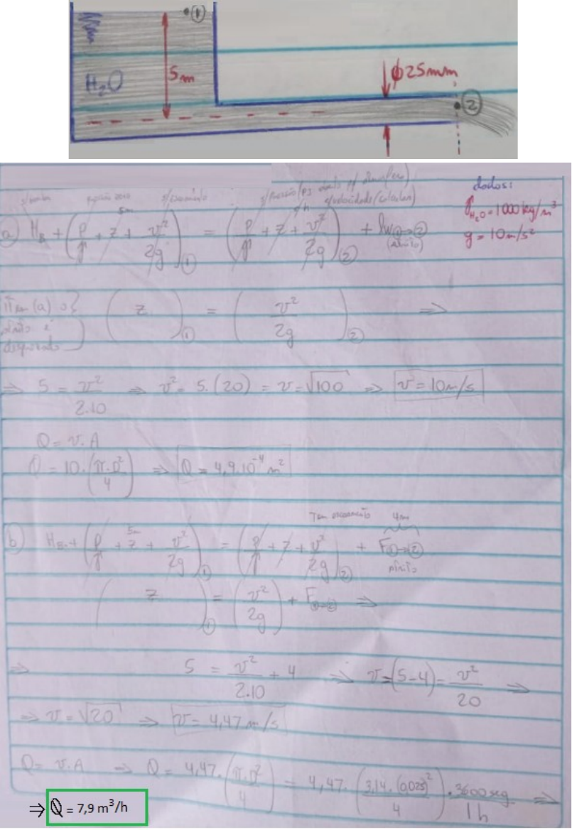 <p>Qual a vazão de saída de [agua de uma tubulação de 25mm de diâmetro, alimentada por uma caixa d’água localizada a 5m de altura.</p><p>a - considere a perda de carga desprezível;</p><p>b- Considere a perda de cargade 4m.</p><p>image1.png</p><p>image10.png</p><p>image2.png</p>