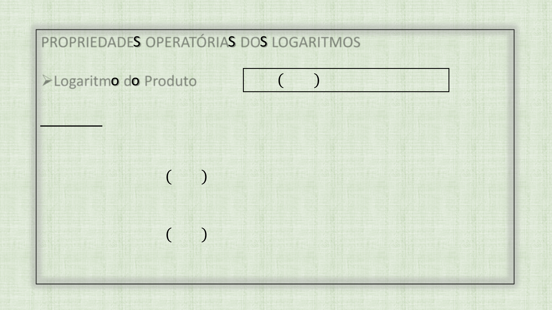 <p>PROPRIEDADES OPERATÓRIAS DOS LOGARITMOS</p><p>➢Logaritmo do Produto: log𝑎 𝑥 ∙ 𝑦 = log𝑎 𝑥 + log𝑎 𝑦</p><p>Exemplos:</p><p>a) log2 6 = 1 + log2 3</p><p>Pois, log2 6 = log2 2 ∙ 3 = log2 2 + log2 3 = 1 + log2 3.</p><p>b) log6 9 = 2 ∙ log6 3</p><p>Pois, log6 9 = log6 3 ∙ 3 = log6 3 + log6 3 = 2 ∙ log6 3.</p><p>PROPRIEDADES OPERATÓRIAS DOS LOGARITMOS</p><p>➢Logaritmo do Quociente: log𝑎</p><p>𝑥</p><p>𝑦</p><p>= log𝑎 𝑥 − log𝑎 𝑦</p><p>Exemplos:</p><p>a) log 5 = 1 − log 2</p><p>Pois, log 5 = log</p><p>10</p><p>2</p><p>= log 10 − log 2 = 1 − log 2</p><p>b) log3</p><p>5</p><p>9</p><p>= −2 + log3 5</p><p>Pois, log3</p><p>5</p><p>9</p><p>= log3 5 − log3 9 = log3 5 − 2 = −2 + log3 5.</p><p>PROPRIEDADES OPERATÓRIAS DOS LOGARITMOS</p><p>➢Logaritmo da Potência: log𝑎 𝑥</p><p>𝑛 =𝑛 ∙ log𝑎 𝑥</p><p>Exemplos:</p><p>a) log5 49 = 2 ∙ log5 7</p><p>Pois, log5 49 = log5 7</p><p>2 = 2 ∙ log5 7.</p><p>b) log</p><p>4</p><p>9 =</p><p>1</p><p>2</p><p>∙ log 3</p><p>Pois, log</p><p>4</p><p>9 = log</p><p>4</p><p>32 = log 3</p><p>2</p><p>4 = log 3</p><p>1</p><p>2 =</p><p>1</p><p>2</p><p>∙ log 3</p><p>MUDANÇA DE BASE</p><p>▪ Veja como podemos transformar 𝐥𝐨𝐠𝒂 𝒃 em logaritmos de base 𝒄.</p><p>𝐥𝐨𝐠𝒂 𝒃 =</p><p>𝐥𝐨𝐠𝒄 𝒃</p><p>𝐥𝐨𝐠𝒄 𝒂</p><p>Exemplos:</p><p>a) Mudando para 3, a base de log7 25, temos: log7 25 =</p><p>log3 25</p><p>log3 7</p><p>.</p><p>b) Mudando para 10, a base de log9 13, temos: log9 13 =</p><p>log 13</p><p>log 9</p><p>.</p><p>EXERCÍCIOS</p><p>Questão 4: Escreva na forma de um único logaritmo.</p><p>a) log4 5 + log4 9 b) 3 ∙ log8 4 − log8 16</p><p>Questão 5: Considerando log 2 = 0,3 , log 3 = 0,5 e log 5 = 0,7 ,</p><p>determine o valor de:</p><p>a) log 15 b) log 30 c) log 45 d) log 1,2</p><p>Questão 6: Calcule o valor da expressão 𝑥 + 𝑦 − 𝑧, sabendo que 𝑥 =</p><p>log 0,0016, 𝑦 = log3 243 e 𝑧 = log3 27.</p><p>Questão 7: Reduza as expressões a logaritmos decimais.</p><p>a) log12 2 + log12 4 b) log9 24 − log9 6 c) log2 3 + log2 1 −</p><p>log2 7</p><p>Questão 8: Determine o valor de cada expressão, considerando log 2 =</p><p>0,3 , log 5 = 0,7 e log 7 = 0,8.</p><p>a) log2 35 b) log5 28 c) log7 14 d) log14 70</p><p>Slide 1</p><p>Slide 2</p><p>Slide 3</p><p>Slide 4</p><p>Slide 5</p><p>Slide 6</p>