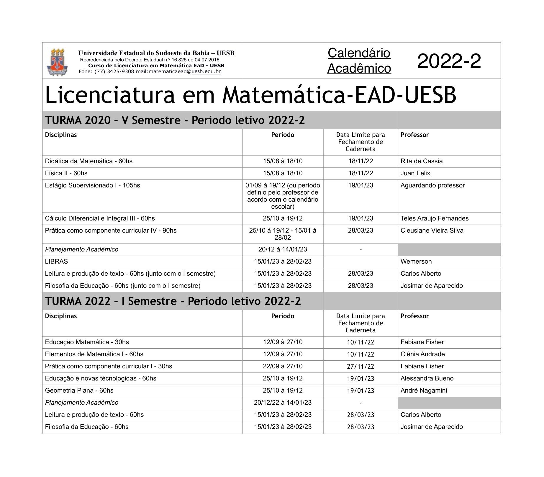 <p>Vitória da Conquista, 04 de Março de 2022</p><p>Universidade Estadual do Sudoeste da Bahia – UESB</p><p>Recredenciada pelo Decreto Estadual n.º 16.825 de 04.07.2016</p><p>Curso de Licenciatura em Matemática EaD - UESB</p><p>Fone: (77) 3425-9308 mail:matematicaead@uesb.edu.br</p><p>Calendário</p><p>Acadêmico 2022-2</p><p>Licenciatura em Matemática-EAD-UESB</p><p>TURMA 2020 – V Semestre - Período letivo 2022-2</p><p>Disciplinas Período Data Limite para</p><p>Fechamento de</p><p>Caderneta</p><p>Professor</p><p>Didática da Matemática - 60hs 15/08 à 18/10 18/11/22 Rita de Cassia</p><p>Física II - 60hs 15/08 à 18/10 18/11/22 Juan Felix</p><p>Estágio Supervisionado I - 105hs 01/09 à 19/12 (ou período</p><p>definio pelo professor de</p><p>acordo com o calendário</p><p>escolar)</p><p>19/01/23 Aguardando professor</p><p>Cálculo Diferencial e Integral III - 60hs 25/10 à 19/12 19/01/23 Teles Araujo Fernandes</p><p>Prática como componente curricular IV - 90hs 25/10 à 19/12 - 15/01 à</p><p>28/02</p><p>28/03/23 Cleusiane Vieira Silva</p><p>Planejamento Acadêmico 20/12 à 14/01/23 -</p><p>LIBRAS 15/01/23 à 28/02/23 Wemerson</p><p>Leitura e produção de texto - 60hs (junto com o I semestre) 15/01/23 à 28/02/23 28/03/23 Carlos Alberto</p><p>Filosofia da Educação - 60hs (junto com o I semestre) 15/01/23 à 28/02/23 28/03/23 Josimar de Aparecido</p><p>TURMA 2022 – I Semestre - Período letivo 2022-2</p><p>Disciplinas Período Data Limite para</p><p>Fechamento de</p><p>Caderneta</p><p>Professor</p><p>Educação Matemática - 30hs 12/09 à 27/10 10/11/22 Fabiane Fisher</p><p>Elementos de Matemática I - 60hs 12/09 à 27/10 10/11/22 Clênia Andrade</p><p>Prática como componente curricular I - 30hs 22/09 à 27/10 27/11/22 Fabiane Fisher</p><p>Educação e novas técnologidas - 60hs 25/10 à 19/12 19/01/23 Alessandra Bueno</p><p>Geometria Plana - 60hs 25/10 à 19/12 19/01/23 André Nagamini</p><p>Planejamento Acadêmico 20/12/22 à 14/01/23 -</p><p>Leitura e produção de texto - 60hs 15/01/23 à 28/02/23 28/03/23 Carlos Alberto</p><p>Filosofia da Educação - 60hs 15/01/23 à 28/02/23 28/03/23 Josimar de Aparecido</p>