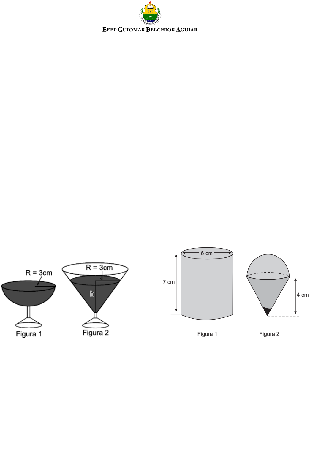 <p>Um novo jeito de ver, sentir e cuidar da juventude!</p><p>ATIVIDADE DE MATEMÁTICA – 3º ANO</p><p>Nome: _________________________________________________________________________ Prof. Fagner Aguiar Data: 02 / 08 / 2024</p><p>01. (ENEM 2009) Uma empresa que fabrica esferas de aço, de</p><p>6 cm de raio, utiliza caixas de madeira, na forma de um cubo,</p><p>para transportá-las.</p><p>Sabendo que a capacidade da caixa é de 13.824 cm3, então o</p><p>número máximo de esferas que podem ser transportadas em</p><p>uma caixa é igual a</p><p>a) 4. b) 8. c) 16. d) 24. e) 32.</p><p>02. (ENEM 2009 – ANULADO) Um artista plástico construiu,</p><p>com certa quantidade de massa modeladora, um cilindro</p><p>circular reto cujo diâmetro da base mede 24 cm e cuja altura</p><p>mede 15 cm. Antes que a massa secasse, ele resolveu</p><p>transformar aquele cilindro em uma esfera.</p><p>Volume da esfera: 𝑉𝑒𝑠𝑓𝑒𝑟𝑎 =</p><p>4𝜋𝑅3</p><p>3</p><p>Analisando as características das figuras geométricas</p><p>envolvidas, conclui-se que o raio R da esfera assim construída</p><p>é igual a</p><p>a) 15 b) 12 c) 24 d) 3√60</p><p>3</p><p>e) 6√60</p><p>3</p><p>03. (ENEM 2010) Em um casamento, os donos da festa serviam</p><p>champanhe aos seus convidados em taças com formato de um</p><p>hemisfério (Figura 1), porém um acidente na cozinha culminou</p><p>na quebra de grande parte desses recipientes. Para substituir</p><p>as taças quebradas, utilizou-se um outro tipo com formato de</p><p>cone (Figura 2). No entanto, os noivos solicitaram que o</p><p>volume de champanhe nos dois tipos de taças fosse igual.</p><p>Considere: 𝑉𝐸𝑆𝐹𝐸𝑅𝐴 =</p><p>4</p><p>3</p><p>𝜋𝑅3 e 𝑉𝐶𝑂𝑁𝐸 =</p><p>1</p><p>3</p><p>𝜋𝑅2ℎ.</p><p>Sabendo que a taça com o formato de hemisfério é servida</p><p>completamente cheia, a altura do volume de champanhe que</p><p>deve ser colocado na outra taça, em centímetros, é de</p><p>a) 1,33. b) 6,00. c) 12,00. d) 56,52. e) 113,04.</p><p>04. (ENEM 2014) Uma empresa farmacêutica produz</p><p>medicamentos em pílulas, cada uma na forma de um cilindro</p><p>com uma semiesfera com o mesmo raio do cilindro em cada</p><p>uma de suas extremidades. Essas pílulas são moldadas por</p><p>uma máquina programada para que os cilindros tenham</p><p>sempre 10 mm de comprimento, adequando o raio de acordo</p><p>com o volume desejado. Um medicamento é produzido em</p><p>pílulas com 5 mm de raio. Para facilitar a deglutição, deseja-se</p><p>produzir esse medicamento diminuindo o raio para 4 mm, e,</p><p>por consequência, seu volume. Isso exige a reprogramação da</p><p>máquina que produz essas pílulas. Use 3 como valor</p><p>aproximado para π. A redução do volume da pílula, em</p><p>milímetros cúbicos, após a reprogramação da máquina, será</p><p>igual a</p><p>a) 168. b) 304. c) 306. d) 378. e) 514.</p><p>05. (ENEM 2014 – 2ª APLICAÇÃO) Para fazer um pião,</p><p>brinquedo muito apreciado pelas crianças, um artesão</p><p>utilizará o torno mecânico para trabalhar num pedaço de</p><p>madeira em formato de cilindro reto, cujas medidas do</p><p>diâmetro e da altura estão ilustradas na Figura 1. A parte de</p><p>cima desse pião será uma semiesfera, e a parte de baixo, um</p><p>cone com altura 4 cm, conforme Figura 2. O vértice do cone</p><p>deverá coincidir com o centro da base do cilindro.</p><p>O artesão deseja fazer um pião com a maior altura que esse</p><p>pedaço de madeira possa proporcionar e de modo a minimizar</p><p>a quantidade de madeira a ser descartada.</p><p>Dados:</p><p>O volume de uma esfera de raio 𝑟 é</p><p>4</p><p>3</p><p>∙ 𝜋 ∙ 𝑟3;</p><p>O volume do cilindro de altura ℎ e área da base 𝑆 é 𝑆 ∙ ℎ;</p><p>O volume do cone de altura ℎ e área da base 𝑆 é</p><p>1</p><p>3</p><p>∙ 𝑆 ∙ ℎ;</p><p>Por simplicidade, aproxime 𝜋 para 3.</p><p>A quantidade de madeira descartada, em centímetros cúbicos,</p><p>é</p><p>a) 45. b) 48. c) 72. d) 90. e) 99.</p><p>Bons estudos!!!</p>