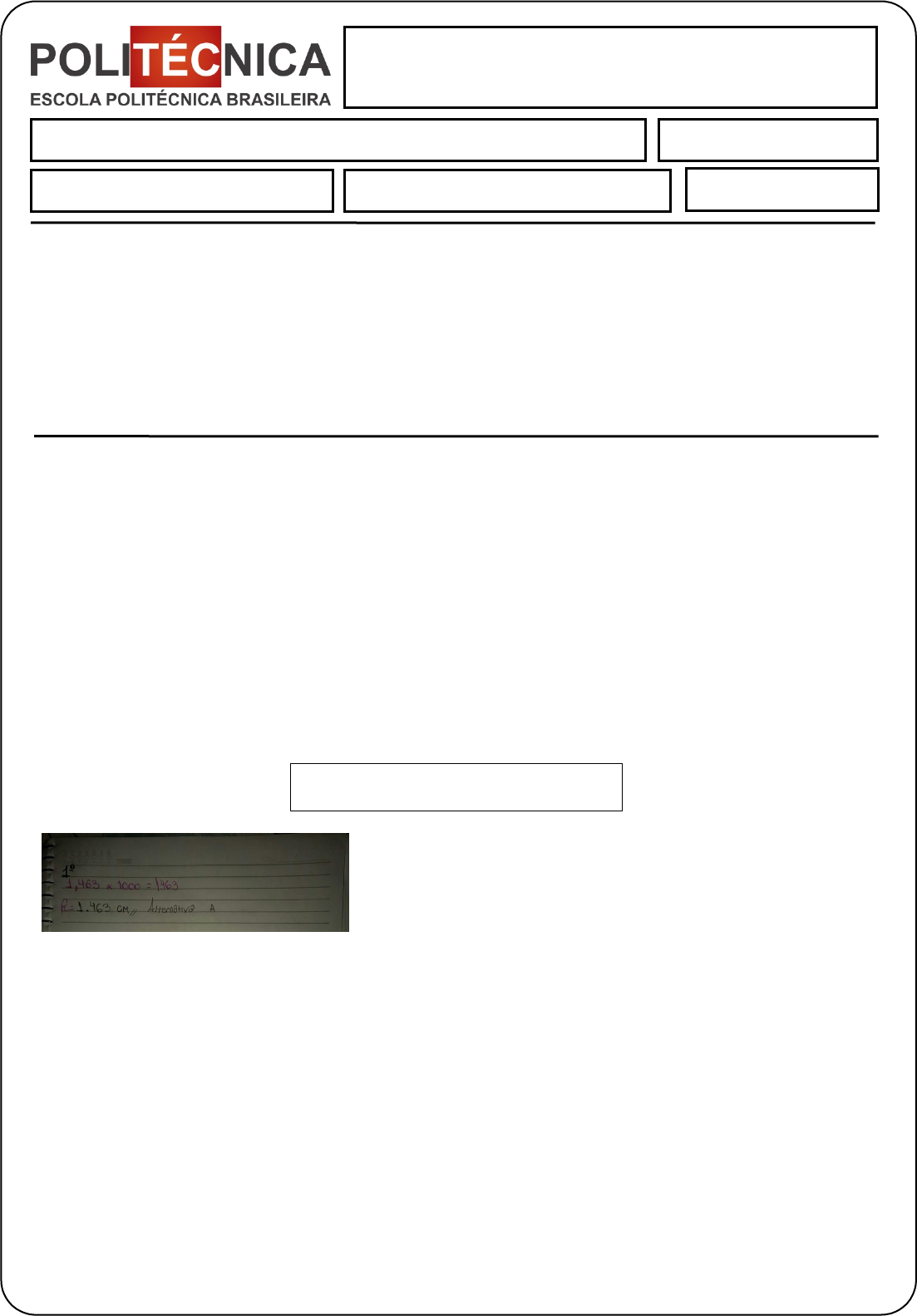 <p>Matemática Aplicada</p><p>Aluno (a):</p><p>Data: / /</p><p>Avaliação Final</p><p>NOTA:</p><p>INSTRUÇÕES:</p><p>a) Esta Avaliação Final contém 10 questões, totalizando 10 (dez) pontos.</p><p>b) Você deve preencher dos dados no Cabeçalho para sua identificação</p><p>c) Nome / Data de entrega</p><p>d) Utilize o espaço delimitado abaixo de cada questão para desenvolver seus cálculos.</p><p>e) Só será avaliada a questão que apresentar o seu respectivo desenvolvimento.</p><p>f) Ao terminar grave o arquivo com o nome Avaliação Final (nome do aluno).</p><p>g) Salve o arquivo no formato .pdf e envie pelo sistema.</p><p>1 – Marque a alternativa que equivale a conversão de 1,463 dam em cm:</p><p>h) 1.463cm</p><p>i) 146,3cm</p><p>j) 14,63cm</p><p>k) 14.630cm</p><p>R:a</p><p>2 - O piso de uma sala retangular, medindo 3,52 m × 4,16 m, será revestido com ladrilhos quadrados, de mesma dimensão, inteiros, de forma que não fique espaço vazio entre ladrilhos vizinhos. Os ladrilhos serão escolhidos de modo que tenham a maior dimensão possível. Na situação apresentada, o lado do ladrilho deverá medir?</p><p>a) 28 cm</p><p>b) 30 cm</p><p>c) 32 cm</p><p>d) 34 cm</p><p>R:c</p><p>3 - Calcule e marque a resposta correta para o cálculo de :</p><p>a) 9-9</p><p>b) 99</p><p>c) 1-9</p><p>d) 933</p><p>R:a</p><p>4 – Calcule e marque a resposta correta para o cálculo de :</p><p>a)</p><p>b) 1.000</p><p>c) 101/2</p><p>d) 100</p><p>R:a</p><p>5 – Calcule as raízes da seguinte equação:</p><p>a) -3 e 1</p><p>b) 1 e 3</p><p>c) -3</p><p>d) 2</p><p>R::a</p><p>6 – Calcule e dê resultado em Notação Científica da seguinte operação: :</p><p>a)</p><p>b) 0</p><p>c)</p><p>d)</p><p>R:a</p><p>7 – Marque a alternativa que equivale a conversão de 54321 cm² em km²</p><p>a) 0,00054321 km²</p><p>b) 0,0000054321 km²</p><p>c) 0,000054321 km²</p><p>d) 0,00000054321 km²</p><p>R: b</p><p>8 – Qual o valor da área de uma circunferência com diâmetro de 9 cm?</p><p>a) 28,3 cm²</p><p>b) 254,5 cm²</p><p>c) 63,6 cm²</p><p>d) 127,2 cm²</p><p>R:a</p><p>9 – Calcule e marque a resposta corrdR: aa para :</p><p>a) 7</p><p>b) 79/2</p><p>c) 7²</p><p>d) 72/9</p><p>R: d</p><p>10 – Em uma disputa de tiro, uma catapulta, operando durante 6 baterias de 15 minutos cada, lança 300 pedras. Quantas pedras lançará em 10 baterias de 12 minutos cada?</p><p>a) 625 pedras</p><p>b) 600 pedras</p><p>c) 400 pedras</p><p>d) 500 pedras</p><p>R: c</p><p>Boa Prova!</p><p>Avaliação Final: Matemática Aplicada</p><p>image4.jpeg</p><p>image5.jpeg</p><p>image6.jpeg</p><p>image7.jpeg</p><p>image8.jpeg</p><p>image9.jpeg</p><p>image10.jpeg</p><p>image11.jpeg</p><p>image12.png</p><p>image13.png</p><p>image14.jpeg</p><p>image1.png</p><p>image2.png</p><p>image3.jpeg</p><p>image10.png</p>