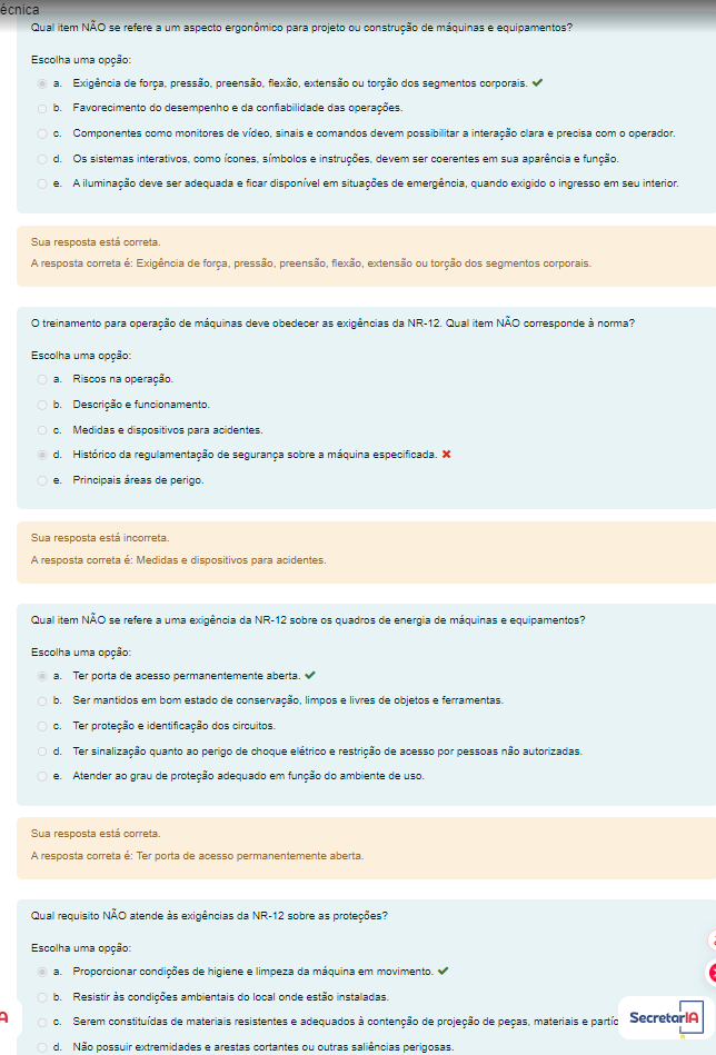 <p>écnica Qual item NÃO se refere 3 um aspecto ergonômico para projeto ou construção de máquinas e equipamentos? Escolha uma opção: a. Exigência de extensão ou torção dos segmentos corporais b. Favorecimento do desempenho e da confiabilidade das operações. Componentes como monitores de sinais e comandos devem possibilitar a interação clara e precisa com o d. Os sistemas interativos, como simbolos e devem ser coerentes em sua aparência e função. A iluminação deve ser adequada e ficar disponível em situações de quando exigido ingresso em seu Sua resposta está A resposta correta é Exigência de extensão ou torção dos segmentos treinamento para operação de máquinas deve obedecer as exigências da Qual item NÃO corresponde à norma? Escolha uma opção: a Riscos na operação. b. Descrição e Medidas e dispositivos para d. Histórico da regulamentação de segurança sobre a máquina especificada x Principais de Sua resposta A resposta correta Medidas e dispositivos para Qual item NÃO se refere uma exigência da NR-12 sobre os quadros de energia de máquinas e equipamentos? Escolha uma opção: a. Ter de acesso permanentemente b. Ser mantidos em bom estado de limpos e livres de objetos e ferramentas. Ter proteção e identificação dos d. Ter sinalização quanto ao perigo de choque elétrico e restrição de acesso por pessoas não e. Atender ao grau de proteção adequado em função do ambiente de Sua resposta está correta. A resposta correta Ter porta de acesso permanentemente Qual requisito NÃO atende às exigências da NR-12 sobre as proteções? Escolha uma opção: a. Proporcionar condições de higiene e limpeza da máquina em b. Resistir às condições ambientais do local onde estão Serem constituídas de materiais resistentes e adequados à contenção de projeção de materiais e partic d. Não possuir extremidades e arestas cortantes ou outras saliências</p>