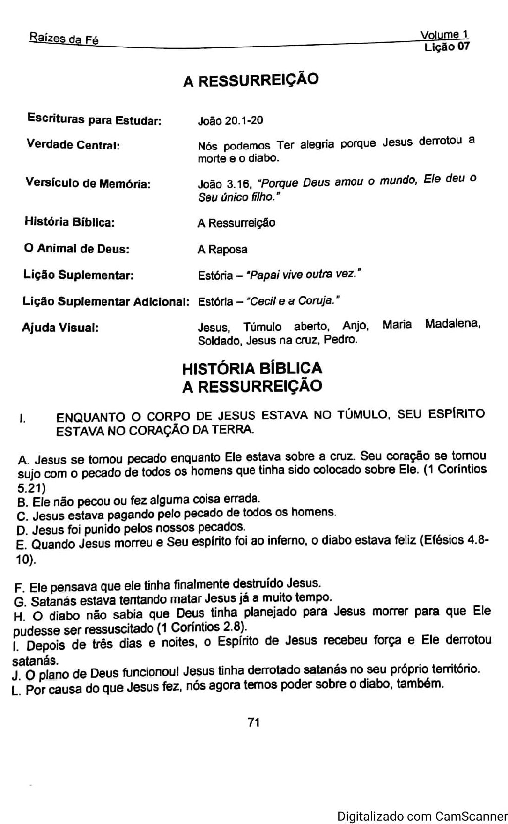 <p>da Fé Volume 1 Lição 07 A RESSURREIÇÃO Escrituras para Estudar: João 20.1-20 Verdade Central: Nós podemos Ter alegria porque Jesus derrotou a morte e o diabo. Versículo de Memória: João 3.16, "Porque Deus amou o mundo, Ele deu o Seu único filho." História Bíblica: A Ressurreição o Animal de Deus: A Raposa Lição Suplementar: Estória - "Papai vive outra vez." Lição Suplementar Adicional: Estória "Cecil e a Coruja." Ajuda Visual: Jesus, Túmulo aberto, Anjo, Maria Madalena, Soldado, Jesus na cruz, Pedro. HISTÓRIA BÍBLICA A RESSURREIÇÃO I. ENQUANTO o CORPO DE JESUS ESTAVA NO TÚMULO, SEU ESPÍRITO ESTAVA NO CORAÇÃO DA TERRA. A. Jesus se tomou pecado enquanto Ele estava sobre a cruz. Seu coração se tornou sujo com o pecado de todos os homens que tinha sido colocado sobre Ele. (1 Coríntios 5.21) B. Ele não pecou ou fez alguma coisa errada. C. Jesus estava pagando pelo pecado de todos os homens. D. Jesus foi punido pelos nossos pecados. E. Quando Jesus morreu e Seu espírito foi ao inferno, o diabo estava feliz 4.8- 10). F. Ele pensava que ele tinha finalmente destruído Jesus. G. Satanás estava tentando matar Jesus já a muito tempo. H. o diabo não sabia que Deus tinha planejado para Jesus morrer para que Ele pudesse ser ressuscitado (1 Coríntios 2.8). I. Depois de três dias e noites, o Espírito de Jesus recebeu força e Ele derrotou satanás. J. o plano de Deus funcionou! Jesus tinha derrotado satanás no seu próprio território. L. Por causa do que Jesus fez, nós agora temos poder sobre o diabo, também. 71 Digitalizado com CamScanner</p><p>Raizes da Fé Volume 1 II ESPÍRITO DE JESUS VEIO OUTRA VEZ A TERRA E ENTROU EM SEU CORPO E A corpo de Jesus estava no túmulo guardado por soldados romanos. B. túmulo era como uma pequena sala ao lado de uma C. Havia uma pedra muito grande fechando a porta do túmulo. D. Quando Espirito de Jesus retornou ao Seu corpo houve um grande terremoto. E. Anjos apareceram e rolaram a pedra da boca do túmulo. F. Quando os soldados viram eles III. os AMIGOS DE JESUS VIERAM VISITAR o TÚMULO ONDE JESUS A Quando eles chegaram eles encontraram a pedra removida e corpo de Jesus ausente. Eles pensaram que corpo de Jesus havia sido C. Os esqueceram que Jesus tinha dito a eles anteriormente. Ele tinha dito que Ele morreria mas que em trés dias Ele ina viver outra vez. D. Mais tarde, Jesus se apresentou aos seus amigos então eles conheceram que Ele estava realmente Agora que Jesus tinha ressuscitado da morte, todos aqueles que Nele podem ter um coração puro e limpo porque Ele removeu os nossos (1 Corintios 5 72 Digitalizado com CamScanner</p><p>Raízes da Fé Volume 1 Lição 07 o ANIMAL DE DEUS: A RAPOSA As raposas são animais muito espertos. Algumas vezes elas podem ser muito ágeis. Poucas pessoas vêem as raposas porque elas se escondem muito bem. Elas gostam de ficar fora de vista. É difícil ver uma raposa. Com que as raposas parecem? Há muitos tipos de raposas, mas todas elas tem alguma coisa em comum. As raposas são animais pequenos, não maiores do que um gato. Todas elas tem orelhas pontudas, focinhos pontudos, e cauda peluda. Algumas raposas são vermelhas. Algumas são cinzas. Algumas são marrons. As raposas tem sido caçadas por centenas de anos porque ela é um indivíduo muito difícil de ser caçado e por ter um pêlo muito bonito. Em alguns lugares, os homens montam em cavalos e usam grandes cachorros para persegui-las. A raposa geralmente proporciona longa caçada para os seus caçadores. Ela é um indivíduo muito esperto. A raposa correrá velozmente, correrá em círculos e se esforçará o máximo para confundir os cachorros. Ela é muito difícil de caçar. Jesus foi uma raposa espiritual. Ele era muito esperto. Quando Jesus foi pregado na cruz, o diabo ficou Ele pensava que finalmente tinha vencido Jesus. Pode Jesus ser derrotado? Mas Jesus morreu e Ele foi para o inferno por três dias e noites. o diabo ficou muito feliz. Ele pensou que Jesus estava derrotado. Jesus estava sofrendo por nossos pecados. Ele não estava planejando ficar morto ou ficar no inferno como o diabo queria. Depois de três dias e noites, o Espírito Santo desceu ao inferno para levantar Jesus. Jesus levantou e derrotou o diabo e tomou suas chaves. Então, Jesus voltou para a terra, entrou em seu corpo, e ressuscitou da morte. o diabo caiu na armadilha de Jesus. o diabo sabia que quando Jesus morresse na cruz, isto faria com que os homens ficassem livres do pecado, e ele não teria mais as pessoas para matar Jesus. Jesus foi mais esperto que o diabo. Ele pode ser uma raposa e mais esperto que o diabo obedecendo a Palavra de Deus. 73 Digitalizado com CamScanner</p><p>Raizes da Fé Volume 1 Lição 07 REVISÃO ATIVIDADE DIVERTIDA: Sente com as crianças no chão e leia para eles a estória da ressurreição de um personagem Responda algumas questões que eles possam ter e discuta que ter Jesus em seus corações realmente significa. PERGUNTAS PARA REVISÃO: Jesus alguma vez pecou? (Não) Pelos pecados de quem Jesus foi punido lá na cruz? (Nossos) 03. o diabo queria matar Jesus? (Sim) diabo sabia que Deus iria ressuscitar Jesus dos mortos? (Não) 05. Depois de três dias e noites, o que aconteceu com Jesus? (Ele ressuscitou) 06. Quem guardou o lado de fora do túmulo de Jesus? (Os soldados) 07. que aconteceu com os soldados quando Jesus ressuscitou dos mortos, e quando a pedra foi removida para longe do túmulo? (Eles desmaiaram) 08. que os amigos de Jesus pensaram quando eles viram que o túmulo estava vazio? ( que alguém havia roubado o seu corpo) 09. Os discípulos se lembraram que Jesus disse que Ele ressuscitaria dos mortos? (Não) 10. Quem levou os nossos pecados e nos deu corações limpos? (Jesus) 78 Digitalizado com CamScanner</p>