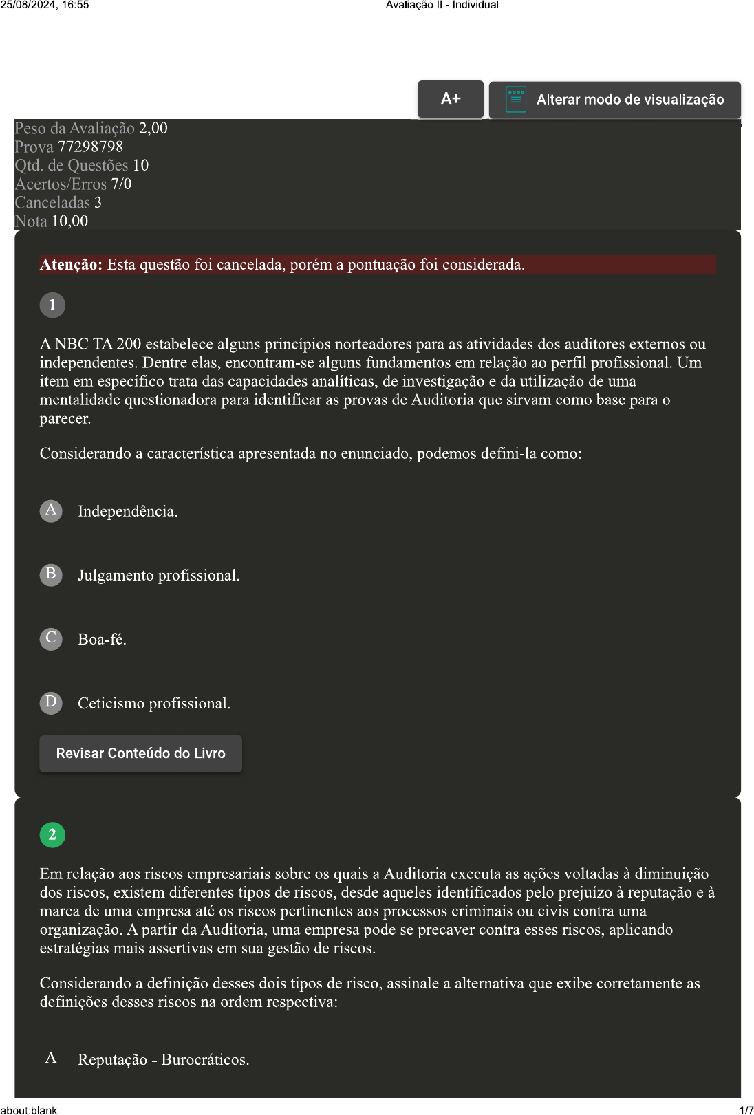 <p>25/08/2024, 16:55 Avaliação Individual A+ Alterar modo de visualização Peso da Avaliação 2,00 Prova 77298798 Qtd. de Questões 10 Acertos/Erros 7/0 Canceladas 3 Nota 10,00 Atenção: Esta questão foi cancelada, porém a pontuação foi considerada. 1 A NBC TA 200 estabelece alguns princípios norteadores para as atividades dos auditores externos ou independentes. Dentre elas, encontram-se alguns fundamentos em relação ao perfil profissional. Um item em específico trata das capacidades analíticas, de investigação e da utilização de uma mentalidade questionadora para identificar as provas de Auditoria que sirvam como base para parecer. Considerando a característica apresentada no enunciado, podemos defini-la como: A Independência. B Julgamento profissional. Boa-fé. D Ceticismo profissional. Revisar Conteúdo do Livro 2 Em relação aos riscos empresariais sobre os quais a Auditoria executa as ações voltadas à diminuição dos riscos, existem diferentes tipos de riscos, desde aqueles identificados pelo prejuízo à reputação e à marca de uma empresa até os riscos pertinentes aos processos criminais ou civis contra uma organização. A partir da Auditoria, uma empresa pode se precaver contra esses riscos, aplicando estratégias mais assertivas em sua gestão de riscos. Considerando a definição desses dois tipos de risco, assinale a alternativa que exibe corretamente as definições desses riscos na ordem respectiva: A Reputação Burocráticos. about:blank 1/7</p><p>25/08/2024, 16:55 Avaliação Individual B Liquidez Endividamento. C Financeiros - Imagem. D Imagem - Legais. 3 A NBC TA 300 (R1) estabelece alguns fundamentos em relação ao planejamento de Auditoria. Dentre eles, está a necessidade de elaboração de estratégias globais para a aplicação da Auditoria pelo auditor contábil. Essas estratégias compreendem a etapa inicial de qualquer Auditoria, sendo uma parte importante do planejamento e, por isso, devem ser consideradas um aspecto crucial para sucesso do plano de Auditoria. Considerando as estratégias globais estabelecidas pela NBC TA 300 (R1), analise as afirmativas a seguir e assinale (V) para a(s) Verdadeira(s) e (F) para a(s) Falsa(s): ( ) O auditor deve definir a natureza, a época e a extensão dos trabalhos a serem realizados. ( ) As características da Auditoria devem ser definidas em conjunto com os objetivos gerais. ( ) A comunicação deve ser um ponto opcional na definição das estratégias globais em Auditoria. ( ) Os dados de auditorias anteriores, quando disponíveis, devem ser incluídos nas estratégias globais de auditoria. Assinale a afirmativa que contempla corretamente a sequência: A B C about:blank 2/7</p><p>25/08/2024, 16:55 Avaliação Individual D F. V, V, 4 Além de regular mercado de Auditoria de forma geral, as Normas Brasileiras de Contabilidade (NBCs) estabelecem importantes aspectos sobre as rotinas do auditor contábil, auxiliando na execução das tarefas dele. Essas normas se dividem em diferentes categorias e possuem abordagens específicas sobre diferentes rotinas do auditor contábil. Por exemplo, a NBC PG 01, que trata dos aspectos profissionais gerais à figura do contador, que é um requisito obrigatório para cargo de auditor, estabelece diversas regras e normas sobre a execução dos trabalhos na área da Auditoria, inclusive, sobre os processos inaptidão, que ocorrem quando profissional não se julga apto a executar determinada ação. Essas regras são fundamentais para um mercado de Auditoria mais eficiente e confiável. Considerando as regras da PG 01 em relação à inaptidão de um auditor, assinale a alternativa que exibe procedimento correto no caso de inaptidão profissional: A Em caso de inaptidão, auditor deve aceitar e afirmar que sabe fazer que é necessário. B Em caso de inaptidão, auditor deve prosseguir normalmente com a auditoria. Em caso de inaptidão, auditor deve recusar a execução da auditoria. D Em caso de inaptidão, auditor deve aceitar e aprender enquanto executa a auditoria. Atenção: Esta questão foi cancelada, porém a pontuação foi considerada. 5 As NBCs TI 01 e TA 200, além de outras importantes NBCs, estabelecem as diretrizes gerais da Auditoria, definindo um conjunto de regras, orientações, vedações e procedimentos a serem realizados pelos auditores. Essas normas também estabelecem normas sobre profissional auditor, ditando algumas regras e fundamentos a serem seguidos por esse profissional para evitar problemas e trazer mais transparência para processo de auditoria. Considerando as características das NBCs em relação às condutas necessárias ao auditor contábil, analise as afirmativas a seguir e assinale (V) para a(s) Verdadeira(s) e (F) para a(s) Falsa(s): ) O auditor contábil deve ser competente e capaz de aplicar conhecimentos técnicos e práticos nas próprias atividades. about:blank 3/7</p><p>25/08/2024 16:55 Avaliação Individual A objetividade deve ser aplicada nas práticas de auditoria, mantendo os trabalhos voltados à aplicação de testes objetivos. ( O auditor deve prezar pela própria independência, trabalhando sempre sozinho em todos os procedimentos a serem realizados. ( ) As informações coletadas pelo auditor devem ser mantidas com total confidencialidade. não sendo compartilhadas com partes não autorizadas. Assinale a afirmativa que contempla corretamente a sequência: A B F. V, F D F, V. F. 6 A partir das NBCs e PGs. que tratam de aspectos profissionais gerais aos contadores (que inclui os auditores e peritos contábeis), são definidas diversas regras sobre os direitos e os deveres dos profissionais que trabalham com Auditoria Contábil. Essas normas são muito importantes para mercado contábil, pois padronizam características dos profissionais e as regras pelas quais poderão agir, melhorando, assim, as relações com as empresas assistidas por esses profissionais. Em relação a essas normativas, em específico, em