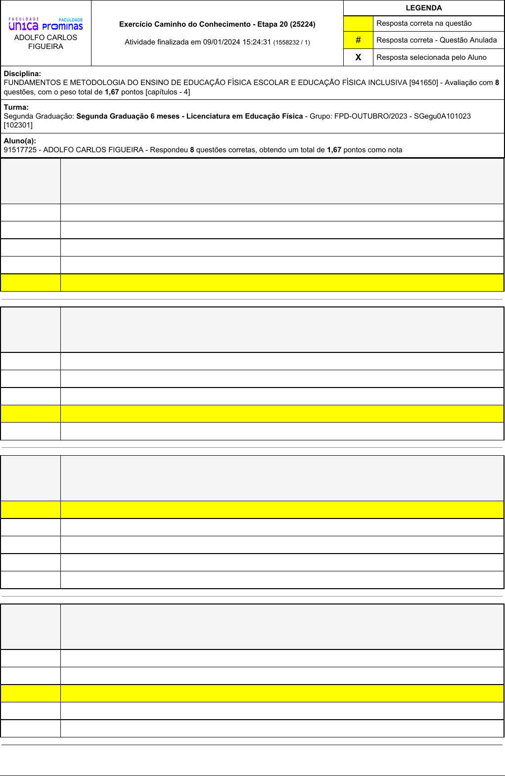 <p>Pincel Atômico - 25/08/2024 17:02:43 1/3</p><p>ADOLFO CARLOS</p><p>FIGUEIRA</p><p>Exercício Caminho do Conhecimento - Etapa 20 (25224)</p><p>Atividade finalizada em 09/01/2024 15:24:31 (1558232 / 1)</p><p>LEGENDA</p><p>Resposta correta na questão</p><p># Resposta correta - Questão Anulada</p><p>X Resposta selecionada pelo Aluno</p><p>Disciplina:</p><p>FUNDAMENTOS E METODOLOGIA DO ENSINO DE EDUCAÇÃO FÍSICA ESCOLAR E EDUCAÇÃO FÍSICA INCLUSIVA [941650] - Avaliação com 8</p><p>questões, com o peso total de 1,67 pontos [capítulos - 4]</p><p>Turma:</p><p>Segunda Graduação: Segunda Graduação 6 meses - Licenciatura em Educação Física - Grupo: FPD-OUTUBRO/2023 - SGegu0A101023</p><p>[102301]</p><p>Aluno(a):</p><p>91517725 - ADOLFO CARLOS FIGUEIRA - Respondeu 8 questões corretas, obtendo um total de 1,67 pontos como nota</p><p>[361122_175046]</p><p>Questão</p><p>001</p><p>“Aquelas que conseguem utilizar resíduos visuais de forma satisfatória podendo</p><p>usufruir de recursos ópticos” são pessoas que possuem:</p><p>cegueira.</p><p>visão periférica.</p><p>visão total.</p><p>visão parcial.</p><p>X baixa visão.</p><p>[361122_175048]</p><p>Questão</p><p>002</p><p>Para tornar as aulas de educação física acessíveis a alunos cegos, temos algumas</p><p>adaptações estruturais, metodológicas e instrumentais.</p><p>Qual opção abaixo destaca adaptações para alunos cegos?</p><p>Braile, Libras e pistas sonoras.</p><p>Rampa de acesso, bola com guizo, pistas sonoras.</p><p>Bengalas, cadeira de rodas e guizo nas bolas.</p><p>X Bolas com guizo, pistas sonoras, objetos táteis.</p><p>Rampa de acesso, bengalas, pistas sonoras.</p><p>[361121_175601]</p><p>Questão</p><p>003</p><p>Um profissional de educação física planejou uma aula de sensibilidade para os</p><p>alunos de uma turma regular que possuem um colega cego. Na sua aula, a fim de</p><p>demonstrar o mundo do esporte como o cego o percebe, ele deverá utilizar:</p><p>X apito e vendas.</p><p>bandeiras coloridas e apito.</p><p>lanternas e coletes.</p><p>papéis coloridos e obstáculos.</p><p>bolas e cones.</p><p>[361121_175050]</p><p>Questão</p><p>004</p><p>O _________ é um esporte paralímpico para atletas cegos. Hoje o Brasil é</p><p>tetracampeão tendo vencido também nas Paralimpíadas de Pequim, Londres e do</p><p>Rio.</p><p>Goalball</p><p>Futebol de 7</p><p>X Futebol de 5</p><p>Futsal</p><p>Futebol</p><p>Adolfo</p><p>Retângulo</p><p>Pincel Atômico - 25/08/2024 17:02:43 2/3</p><p>[361121_175047]</p><p>Questão</p><p>005</p><p>Sistema de comunicação que permite as pessoas cegas a leitura através do tato:</p><p>Podotátil.</p><p>Português.</p><p>Libras.</p><p>X Braile.</p><p>TIC’s.</p><p>[361123_175052]</p><p>Questão</p><p>006</p><p>Alguns aspectos fazem parte do cotidiano da pessoa com deficiência visual e muitos</p><p>deles podem ser utilizados nas aulas de educação física. São eles:</p><p>utilização de bengalas e de recursos visuais.</p><p>X utilização de sons e aspectos táteis.</p><p>utilização do braile e das mãos.</p><p>utilização de recursos visuais e do braile.</p><p>utilização da visão e do braile</p><p>[361122_175044]</p><p>Questão</p><p>007</p><p>Para conceituar cegueira é utilizado como parâmetro aquilo que se enxerga a uma</p><p>certa distância e a discriminação das formas. Estamos nos referindo a:</p><p>campo visual.</p><p># acuidade visual.</p><p>profundidade.</p><p>percepção visual.</p><p>figura e fundo.</p><p>[361121_175602]</p><p>Questão</p><p>008</p><p>(SEE/SP – 2010) A deficiência visual envolve:</p><p>cegueira ou alta miopia.</p><p>baixa visão ou erros refracionais.</p><p>ambliopia ou alta miopia.</p><p>problemas visuais de refração.</p><p>X cegueira ou baixa visão.</p><p>Pincel Atômico - 25/08/2024 17:02:43 3/3</p>