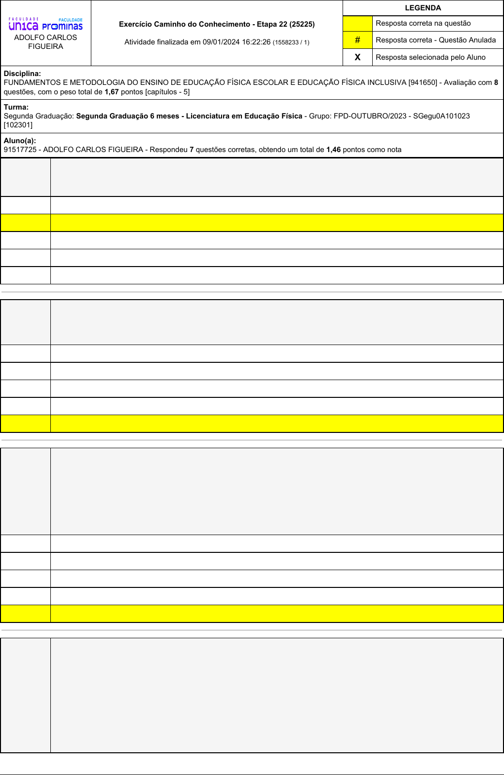 <p>Pincel Atômico - 25/08/2024 17:02:46 1/3</p><p>ADOLFO CARLOS</p><p>FIGUEIRA</p><p>Exercício Caminho do Conhecimento - Etapa 22 (25225)</p><p>Atividade finalizada em 09/01/2024 16:22:26 (1558233 / 1)</p><p>LEGENDA</p><p>Resposta correta na questão</p><p># Resposta correta - Questão Anulada</p><p>X Resposta selecionada pelo Aluno</p><p>Disciplina:</p><p>FUNDAMENTOS E METODOLOGIA DO ENSINO DE EDUCAÇÃO FÍSICA ESCOLAR E EDUCAÇÃO FÍSICA INCLUSIVA [941650] - Avaliação com 8</p><p>questões, com o peso total de 1,67 pontos [capítulos - 5]</p><p>Turma:</p><p>Segunda Graduação: Segunda Graduação 6 meses - Licenciatura em Educação Física - Grupo: FPD-OUTUBRO/2023 - SGegu0A101023</p><p>[102301]</p><p>Aluno(a):</p><p>91517725 - ADOLFO CARLOS FIGUEIRA - Respondeu 7 questões corretas, obtendo um total de 1,46 pontos como nota</p><p>[361123_1750</p><p>60]</p><p>Questão</p><p>001</p><p>São exemplos de esportes paralímpicos para pessoas com deficiência física:</p><p>X Basquete em CR, esgrima em CR, futebol de 7.</p><p>Basquete em CR, canoagem e atletismo.</p><p>Vôlei sentado, esgrima em CR e futebol de 7.</p><p>Vôlei sentado, basquete em CR e futebol de 5.</p><p>Esgrima em CR, Basquete e atletismo.</p><p>[361122_1750</p><p>58]</p><p>Questão</p><p>002</p><p>As pessoas com deficiência física podem utilizar tecnologias assistivas para facilitar o</p><p>seu cotidiano, na sua locomoção e autonomia. Algumas são conhecidas como OPM.</p><p>Um exemplo de OPM seria:</p><p>esteira.</p><p>cão – guia.</p><p>escada rolante.</p><p>aplicativo de tradução.</p><p>X prótese de membro inferior.</p><p>[361121_1756</p><p>04]</p><p>Questão</p><p>003</p><p>(SEE/SP – 2010) O aluno com deficiência física que tem limites de mobilidade fica</p><p>prejudicado pela falta de possibilidade de exploração e atividades em diferentes</p><p>espaços. Além disso, é interessante que ele possa ficar em altura semelhante à dos</p><p>colegas nos espaços variados da escola como sala de aula, laboratório de informática,</p><p>laboratório de ciências, sala ambiente da aula de artes e biblioteca, entre outras. Qual</p><p>item contempla melhor este ideal?</p><p>Cadeira com apoio de espaldar e apoios laterais para o tronco.</p><p>Tampo de mesa com inclinação regulável.</p><p>Tampo de mesa com bordas para evitar que os materiais fiquem caindo.</p><p>Apoio de pés para manter pés em ângulo reto e ligeiramente separados.</p><p>X Pés reguláveis na mesa e cadeira do aluno com deficiência para alterar a altura (C) .</p><p>[361122_1750</p><p>53]</p><p>Questão</p><p>004</p><p>Entende – se por deficiência física: “alteração _______ ou parcial de um ou mais</p><p>segmentos do corpo humano, acarretando o __________ da função__________,</p><p>apresentando-se sob a forma de paraplegia, paraparesia, monoplegia, monoparesia,</p><p>tetraplegia, tetraparesia, triplegia, triparesia, hemiplegia, hemiparesia, ostomia,</p><p>amputação ou ausência de membro, paralisia cerebral, nanismo, membros com</p><p>deformidade congênita ou adquirida, exceto as deformidades estéticas e as que não</p><p>produzam dificuldades para o desempenho de funções;(BRASIL,2004).”</p><p>Complete as lacunas com as palavras corretas.</p><p>Adolfo</p><p>Retângulo</p><p>Pincel Atômico - 25/08/2024 17:02:46 2/3</p><p>parcial – disfunção - física</p><p>X completa – comprometimento - física</p><p>parcial – comprometimento - física</p><p>total – comprometimento - motora</p><p>completa – disfunção - física</p><p>[361121_1756</p><p>05]</p><p>Questão</p><p>005</p><p>(FCC – 2010) Considerando os cuidados necessários na organização dos espaços</p><p>dentro da sala de aula, qual item desconsidera os princípios de acessibilidade na sala</p><p>de aula?</p><p>Assegurar espaço de circulação dentro da sala de aula para que o aluno consiga</p><p>chegar com autonomia na sala de aula.</p><p>Verificar se as estantes, os cabides e as maçanetas estão na altura certa para ele</p><p>manejar com autonomia.</p><p>Garantir boa iluminação na sua área de trabalho.</p><p>X</p><p>Colocar a mesa do aluno com deficiência física no fundo para não atrapalhar a</p><p>passagem dos demais.</p><p>Garantir que a lousa esteja em altura apropriada para ele e que consiga chegar até lá.</p><p>[361121_1750</p><p>59]</p><p>Questão</p><p>006</p><p>Uma aula de educação física inclusiva que permite a participação de alunos com e</p><p>deficiência seria:</p><p>calestenia.</p><p>jogos coletivos.</p><p>ginástica natural.</p><p>artes marciais tradicionais.</p><p>X dança em cadeira de rodas.</p><p>[361121_1756</p><p>08]</p><p>Questão</p><p>007</p><p>(ENADE – 2019) Durante a reunião técnica de um centro esportivo, o coordenador</p><p>expôs a sua preocupação com o atendimento adequado às crianças com deficiência</p><p>integrantes de um projeto. Solicitou, então, aos professores das diferentes</p><p>modalidades a proposição de estratégias pedagógicas voltadas a esses alunos, para</p><p>serem implantadas em suas aulas. Nessa situação, considerando os princípios da</p><p>inclusão e o desenvolvimento integral de crianças com deficiência, avalie as</p><p>afirmações a seguir.</p><p>I. A formação de turmas especiais para as crianças com deficiência é uma estratégia</p><p>adequada para aprimorar suas capacidades até que seja possível sua integração total</p><p>ao grupo.</p><p>II. A estrutura e as regras dos jogos devem ser adaptadas para garantir as condições</p><p>de segurança, a aceitação das diferenças e a ampla participação das crianças com</p><p>deficiência.</p><p>III. A criação de jogos e de atividades esportivas deve considerar a promoção da</p><p>aprendizagem por meio da cooperação e da convivência com a diversidade.</p><p>IV. A vivência de tarefas com restrições motoras ou funcionais pelas crianças sem</p><p>deficiência contribui para o desenvolvimento da empatia, f
