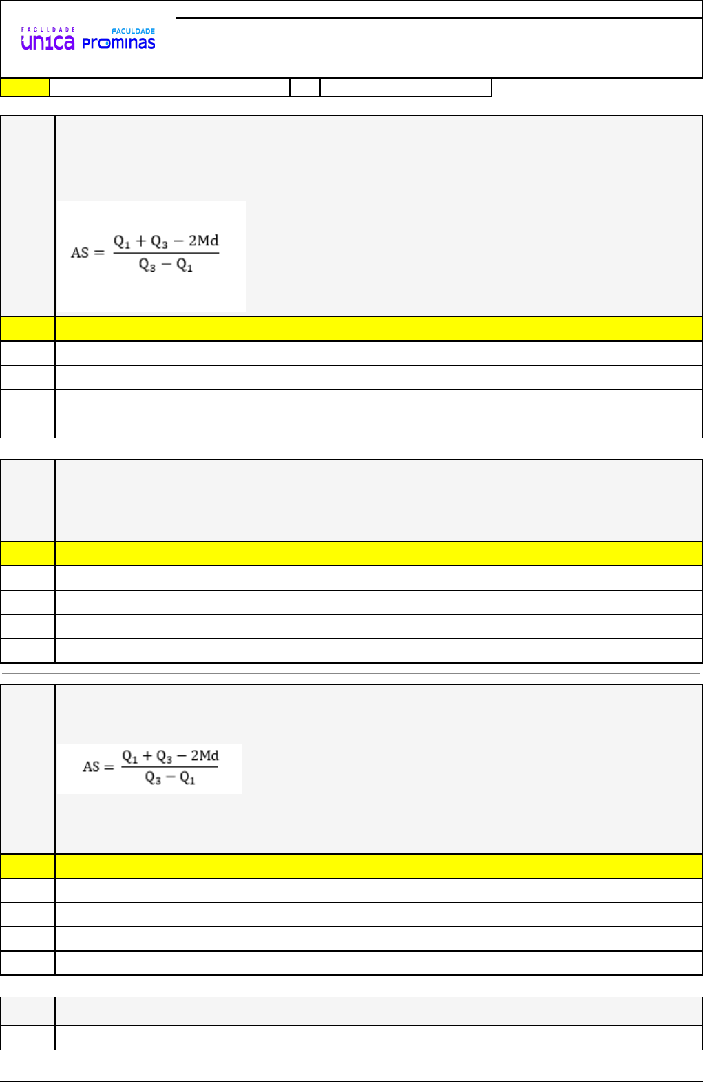 <p>18/08/2024 22:39:46 1/2</p><p>REVISÃO DE SIMULADO</p><p>Nome:</p><p>RODOLFO PITTELKOW DA COSTA</p><p>Disciplina:</p><p>Estatística e Probabilidade</p><p>Respostas corretas são marcadas em amarelo X Respostas marcardas por você.</p><p>Questão</p><p>001 Calcule o coeficiente de Bowley para um conjunto de dados que apresenta os seguintes</p><p>valores: Q1 = 10; Q3 = 18 e X = 15.</p><p>Coeficiente de Bowley</p><p>X A) A = - 0,25</p><p>B) A = 1,75</p><p>C) A = - 1,25</p><p>D) A = 2,15</p><p>E) A = 0,55</p><p>Questão</p><p>002 Suponha que os dados abaixo sejam referentes às idades de cinco pessoas.</p><p>18 19 18 25 30</p><p>Com base nestes dados, calcule o Coeficiente de Pearson e assinale a alternativa</p><p>correta.</p><p>X A) O valor do Coeficiente de Pearson é 0,75.</p><p>B) A distribuição é simétrica.</p><p>C) Não é possível calcular o Coeficiente de Pearson.</p><p>D) O valor do Coeficiente de Pearson é 1,45.</p><p>E) A distribuição apresenta assimetria negativa.</p><p>Questão</p><p>003 Considerando o conjunto de dados abaixo, calcule a assimetria através do Coeficiente</p><p>de Bowley e assinale a alternativa correta.</p><p>Coeficiente de Bowley</p><p>15 17 19 20 22</p><p>25 27 29 30 32</p><p>38 39 41 43 45</p><p>X A) A = 0,05</p><p>B) A = 0,22</p><p>C) A = -1,55</p><p>D) A = 1,25</p><p>E) A = 0</p><p>Questão</p><p>004 Assinale alternativa correta no que se refere à simetria.</p><p>A) A principal medida de assimetria é chamada de Coeficiente de Variação.</p><p>18/08/2024 22:39:46 2/2</p><p>B) Uma distribuição assimétrica é aquela em que a média, a moda e a mediana são iguais.</p><p>C) Quando uma distribuição for simétrica, o Coeficiente de Pearson será maior que zero.</p><p>D) Quando o Coeficiente de Pearson é maior que zero, dizemos que a distribuição é</p><p>assimétrica à esquerda.</p><p>X E) Quando uma distribuição não apresenta simetria, dizemos que ela é assimétrica.</p><p>Questão</p><p>005 Suponha que uma determinada loja varejista localizada em um aeroporto irá sortear um</p><p>produto como estratégia de marketing. Suponha ainda que, entre os participantes do</p><p>sorteio entejam presentes 6 brasileiros, 7 argentinos, 3 paraguaios e 4 bolivianos.</p><p>Dessa forma, qual a probabilidade de um brasileiro ganhar o prêmio?</p><p>A) 60%</p><p>B) 80%</p><p>C) 20%</p><p>D) 50%</p><p>X E) 30%</p><p>Questão</p><p>006 Calcule o Coeficiente de Pearson do seguinte conjunto de dados:</p><p>02 05 05 08</p><p>A) A = 0,71</p><p>B) A = - 0,51</p><p>C) A = 0,75</p><p>X D) A = 0,0</p><p>E) A = -1,55</p><p>Questão</p><p>007 Considerando o conjunto de dados abaixo, calcule a assimetria através do Coeficiente</p><p>de Bowley e assinale a alternativa correta.</p><p>12 15 17 20 22</p><p>23 24 27 33 33</p><p>35 38 39 40 42</p><p>X A) A = 0,22</p><p>B) A = 0</p><p>C) A = -1,55</p><p>D) A = 1,25</p><p>E) A = 0,75</p><p>Questão</p><p>008 Suponha que cinco pessoas tenham sido entrevistadas para preencher a uma vaga de</p><p>emprego e o conjunto abaixo represente a idade de cada candidato.</p><p>18 21 21 22 25</p><p>Calcule a curtose referente a esta distribuição e assinale a alternativa correta.</p><p>A) – 0,25</p><p>B) – 2,47</p><p>C) 0,25</p><p>X D) 1,48</p><p>E) – 1,48</p>