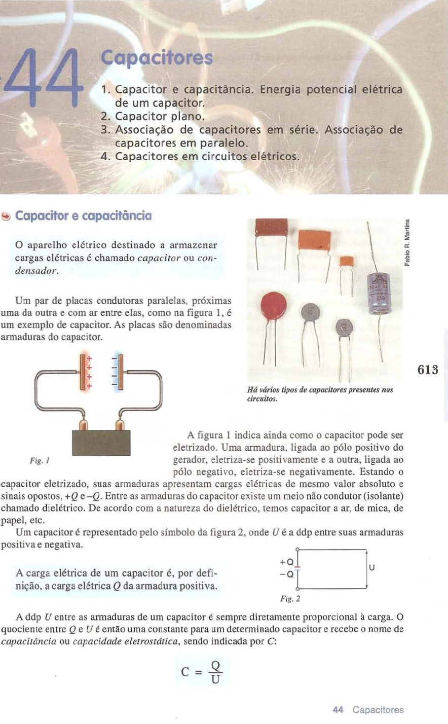 <p>C pacitores ·44 1. Capacitor e capacitância. Energia potencial elétrica</p><p>de um capacitor.</p><p>2. Capacitor plano.</p><p>3. Associação de capacitores em sér ie. Associação de</p><p>capacitores em paralelo.</p><p>4. Capacitores em circuitos elétricos.</p><p>s Capacitar e capacitãncia</p><p>O aparelho elétrico destinado a armazenar</p><p>cargas elétricas é chamado capacitor ou con</p><p>densador.</p><p>Um par de placas condutoras paralelas, próximas</p><p>uma da outra e com ar entre elas, como na figura 1, é</p><p>um exemplo de capacitor. As placas são denominadas</p><p>armaduras do capacitor.</p><p>+</p><p>v===~ll + +</p><p>+</p><p>(</p><p>\</p><p>Há vários tipos de capacitares presentes nos</p><p>circuiJos.</p><p>Fig. 1</p><p>A figura I indica ainda como o capacitor pode ser</p><p>eletrizado. Uma armadura, ligada ao pólo positivo do</p><p>gerador, eletriza-se positivamente e a outra, ligada ao</p><p>pólo negativo, eletriza-se negativamente. Estando o</p><p><:apacitor eletrizado, suas armaduras apresentam cargas elétricas de mesmo valor absoluto e</p><p>sinais opostos, +Q e -Q. Entre as armaduras do capacitor existe um meio não condutor (isolante)</p><p>chamado dielétrico. De acordo com a natureza do dielétrico, temos capacitor a ar, de mica, de</p><p>papel, etc.</p><p>Um capacitor é representado pelo símbolo da figura 2, onde Ué a ddp entre suas armaduras</p><p>positiva e negativa.</p><p>A carga elétrica de um capacitor é, por defi</p><p>nição, a carga elétrica Q da armadura positiva.</p><p>Fig. 2</p><p>A ddp U entre as armaduras de um capacitor é sempre diretamente proporcional à carga. O</p><p>quociente entre Q e Ué então uma constante para um determinado capacitor e recebe o nome de</p><p>capacitância ou capacidade eletrostática, sendo indicada por C:</p><p>c=-ºu</p><p>44 Capacitares</p><p>613</p><p>A unidade de capacitância no SI é o farad (símbolo F), onde 1 farad = 1 coulomb . O farad</p><p>l volt</p><p>é uma unidade tão grande que, para finalidades práticas, é geralmente substituído pelo microfarad</p><p>(J.LF) ou o picofarad (pF), cujos valores são:</p><p>e 1 pF = 10-12 F</p><p>A capacitância de um capacitor depende unicamente de sua forma geométrica e do</p><p>meio existente entre as armaduras.</p><p>Na figura 3, temos um capacitar eletrizado ou carregado; se as duas armaduras são subi</p><p>tamente ligadas por um fio condutor, ocorre um movimento de eléu·ons da armadura negativa</p><p>para a positiva, descarregando o capacitar.</p><p>Quando o capacitar está carregado, se ele receber</p><p>mais cargas, sua ddp é aumentada proporcionalmente.</p><p>A carga que pode ser armazenada pelo capacitar é limi</p><p>tada somente pela ruptura do dielétrico entre as ar</p><p>maduras. A carga tornando-se excessiva, também a ddp</p><p>será muito alta e saltará uma faísca entre as armaduras,</p><p>rompendo o dielétrico e descarregando o capacitar. A</p><p>construção dos capacitares depende da capacitância</p><p>desejada e da ddp que deve ser aplicada, sem ruptura</p><p>do dielétrico.</p><p>614 Energia potencial elétrica de um capacitor</p><p>Fig. 3</p><p>O gerador elétrico, ao carregar um capacitor, fornece-lhe energia potencial elétrica que fica</p><p>armazenada nele.</p><p>Como a carga elétrica do capacitar é diretamente proporcional à sua ddp, o gráfico da carga em</p><p>função da ddp é uma reta passando pela origem. Quando a carga é Q, a ddp é U (Fig. 4).</p><p>A energia potencial elétrica armazenada pelo capacitar é numericamente igual à área A,</p><p>destacada na figura 4.</p><p>Então:</p><p>e, como Q = CU, segue-se</p><p>Aplicação</p><p>w</p><p>w</p><p>QU</p><p>2</p><p>carga</p><p>Q --- --------------</p><p>o</p><p>Fig. 4</p><p>®</p><p>u ddp</p><p>A 1 Um capacitor, ligado aos terminais de uma bateria de 24 V, apresenta a carga elétrica 3,0 · 10~ C.</p><p>Determine sua capacitância.</p><p>A2 Um capacitor tem capacitância 2,0 · 10-s F. Liga-se o capacitor aos terminais de uma bateria de</p><p>12 V. Qual é a carga elétrica que o capacitor armazena?</p><p>A3. Três capacitores, A, 8 e C, possuem capacitâncias C1, C2 e C3, respectivamente, tais que C1 > ~ > ~</p><p>Submetendo-os à mesma ddp U, qual deles armazena maior carga elétrica?</p><p>VIII Eletrodinâmica</p><p>A~ Dois capacitares, A e 8, são eletrizados com cargas elétricas 2Q e Q quando submetidos a tensões</p><p>elétricas 2U e 3U, respectivamente. Qual deles armazena mais energia potencial elétrica?</p><p>A c Um capacitar de capacitância 1,0 ~F. inicialmente neutro, é ligado a uma fonte de ddp constante</p><p>até se carregar completamente. Em seguida, verifica-se que, descarregando-o através de um</p><p>resisto r, o calor desenvolvido equivale a O, 125 J. Calcule a ddp da fonte.</p><p>Verificação</p><p>V1 . A figura dá a variação da carga Q entre as armaduras de um capacitar em função da ddp U.</p><p>Determine a capacitância do capacitar.</p><p>o 10 U (V)</p><p>V2. Um capacitar tem capacitãncia 3,0 nF (nano: o= I o-9). Liga-se o capacito r aos terminais de uma</p><p>bateria de 6,0 V.</p><p>a) Qual a carga elétrica que o capacitar armazena?</p><p>b) Alterando-se a ddp aplicada ao capacitor para 12 V, altera-se a sua capacitãncia? E a carga</p><p>elétrica que ele armazena?</p><p>V3. Um capacitor tem capacitância 5,0 ~F. Qual a ddp que deve ser aplicada ao capacitar para que</p><p>ele armazene uma carga elétrica de 2,0 · 104 C?</p><p>V4. Um capacitor de capacitância 30 IJ.F sob ddp de 5,0 · 103 V é desligado da fonte e, a seguü, 615</p><p>totalmente descarregado através de um resistor. Calcule a energia dissipada na descarga do</p><p>capacitar.</p><p>VS. Qual a ddp que deve ser aplicada a um capacitor, de capacitância 2,0 IJ.F, a fim de que armazene</p><p>energia potencial elétrica de 2.5 · 10 ' J?</p><p>R1 (EPUSP) Em um condensador a vácuo, de capacidade 10"3 IJ.F, ligado a um gerador de tensão</p><