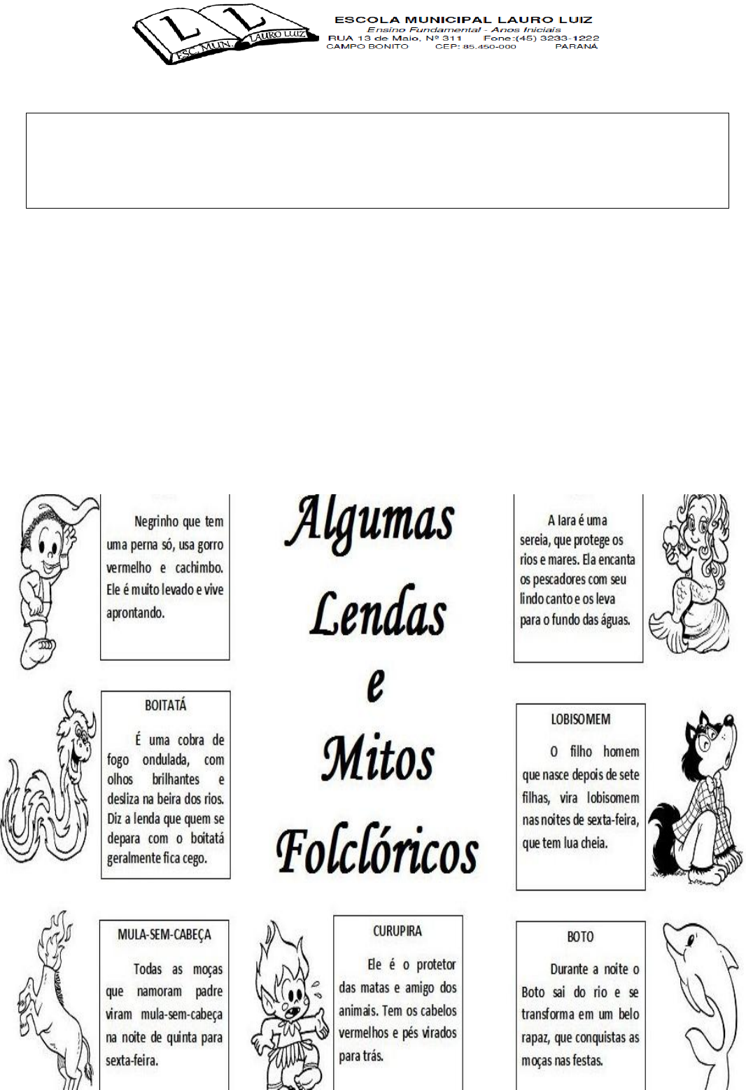 <p>TURMA 3° ANO - ATIVIDADES REMOTAS DE30/08 A 03/09/21 16ª SEMANA.</p><p>ALUNO (A):_____________________________________________________________________</p><p>PROFESSORA:_________________________________________________________________</p><p>DISCIPLINA: PORTUGUÊS</p><p>LENDAS BRASILEIRAS</p><p>O QUE É FOLCLORE? É O CONJUNTO DE TRADIÇÕES E MANIFESTAÇÕES POPULARES</p><p>CONSTITUIDOS POR LENDAS, MITOS, PROVERBIOS,DANÇAS E COSTUMES,QUE SÃO</p><p>PASSADAS DE GERAÇÃO EM GERAÇÃO.</p><p>O FOLCLORE SIMBOLIZA A CULTURA POPULAR E APRESENTA GRANDE IMPORTÂNCIA NA</p><p>IDENTIDADE DE UM POVO, DE UMA NAÇÃO.PARA NÃO SE PERDER A TRADIÇÃO</p><p>FOLCLÓRICA, É IMPORTANTE QUE AS MANIFESTAÇÕES CULTURAIS SEJAM TRANSMITIDAS</p><p>ATRAVÉS DAS GERAÇÕES. DIA 22 DE AGOSTO COMEMORA-SE O FLOCLORE.</p><p>VEJA O RESUMO DE ALGUMAS LENDAS:</p><p>COLORIR O DESENHO DO SACI-PERERÊ.</p><p>TURMA 3° ANO - ATIVIDADES REMOTAS DE30/08 A 03/09/2021 16ª SEMANA.</p><p>ALUNO (A):_____________________________________________________________________</p><p>PROFESSORA:_________________________________________________________________</p><p>DISCIPLINA: MATAMÁTICA</p><p>CARO ALUNO FAÇA A LEITURA COM ATENÇÃO.</p><p>MEDIDAS DE TEMPO</p><p>- UM ANO TEM 365 DIAS E 6 HORAS, ELE SE DIVIDE EM 12 MESES; JANEIRO, FEVEREIRO,</p><p>MARÇO, ABRIL, MAIO, JUNHO, JULHO, AGOSTO, SETEMBRO, OUTUBRO, NOVEMBRO,</p><p>DEZEMBRO.</p><p>- O ANO PODE SER DIVIDIDO EM BIMESTRE, SEMESTRE E TRIMESTRE.</p><p>- CADA MÊS TE 30 E 31 DIAS, SOMENTE O MÊS DE FEVEREIRO TEM 28 DIAS, MAS A CADA 4</p><p>ANOS ELE TEM 29 DIAS, QUE CHAMAMOS DE ANO BIXESTO.</p><p>-OS MESES SE DIVIDEM EM 4 SEMANAS, CADA SEMANA TEM 7 DIAS; DOMINGO, SEGUNDA-</p><p>FEIRA, TERÇA-FEIRA, QUARTA-FEIRA, QUINTA- FEIRA, SEXTA-FEIRA E SÁBADO.</p><p>-O DIA TEM 24 HORAS, UMA HORA TEM 60 MINUTOS, UM MINUTO TEM 60 SEGUNDOS.</p><p>-UMA QUINZENA TEM 15 DIAS. – UM SÉCULO TEM100 ANOS.</p><p>-UMA DÉCADA TEM 10 ANOS. _ UM MILÊNIO TEM 1000ANOS.</p><p>1) LEIA O TEXTO ACIMA E RESPONDA:</p><p>A) UM DIA TEM ......................... HORAS.</p><p>B) UM MINUTO TEM .........................SEGUNDOS.</p><p>C) UMA HORA TEM ...........................MINUTOS.</p><p>D) UMA QUINZENA TEM............................DIAS.</p><p>E) UMA SEMANA REPRESENTA.............................DIAS.</p><p>F) UM MILÊNIO TEM .............................ANOS.</p><p>G) UMA DÉCADA TEM............................ANOS.</p><p>H) UM SÉCULO TEM...............................ANOS.</p><p>I) UM ANO TEM .........................DIAS E ........................HORAS.</p><p>J) O ANO BIXESTO É.......................................</p><p>K) 1º MÊS DO ANO............................................</p><p>L) ÚLTIMO MÊS DO ANO..................................</p><p>M) ANO EM QUE ESTAMOS..............................</p><p>N) DIA..................MÊS...................................E ANO......................DO SEU ANIVERSÁRIO.</p><p>QUE HORAS SÃO?</p><p>OBSERVAÇÃO: CONFECCIONAR O RELÓGIO QUE FOI EM ANEXO.</p><p>RECORTAR E PRENDER OS PONTEIROS NA POSIÇÃO CORRETA:HORAS E MINUTOS.</p><p>TURMA 3° ANO - ATIVIDADES REMOTAS DE30/08 A 03/09/2021 16ª SEMANA.</p><p>ALUNO (A):_____________________________________________________________________</p><p>PROFESSORA:_________________________________________________________________</p><p>DISCIPLINA: HISTÓRIA</p><p>SALÁRIO MÍNIMO</p><p>A CONSTITUIÇÃO DE 1934, FOI A PRIMEIRA A TRATAR DE DIREITO DO TRABALHO NO</p><p>BRASIL, ASSEGURANDO A LIBERDADE SINDICAL, SALÁRIO MÍNIMO, JORNADA DE</p><p>TRABALHO DE OITO HORAS, REPOUSO SEMANAL, FÉRIAS ANUAIS REMUNERADAS,</p><p>PROTEÇÃO DO TRABALHO FEMENIMO E INFANTIL, E ISONOMIA SALÁRIAL.EM 1940, O</p><p>ENTÃO PRESIDENTE GETÚLIO VARGAS CRIOU O SALÁRIO MÍNIMO.</p><p>O SALÁRIO MÍNIMO ASSEGURA O PAGAMENTO DO VALOR MÍNIMO A TODOS OS</p><p>TRABALHADORES.</p><p>ELE É FIXADO POR LEI FEDERAL, EM CARÁTER NACIONAL E DEVE GARANTIR AS</p><p>NECESSIDADES VITAIS DO TRABALHADOR E DE SUA FAMÍLIA, COM MORADIA,</p><p>ALIMENTAÇÃO, EDUCAÇÃO, SAÚDE, VESTUÁRIO, HIGIENE, TRANSPORTE, LAZER E</p><p>PREVIDÊNCIA SOCIAL.</p><p>O SEU VALOR É REAJUSTADO PERIODICAMENTE PELO GOVERNO FEDERAL, PARA</p><p>PRESERVAR O SEU PODER AQUISITIVO.</p><p>RESPONDA:</p><p>A) O QUE É O SALÁRIO MÍNIMO?</p><p>___________________________________________________________________________</p><p>___________________________________________________________________________</p><p>B) PERGUNTE AOS SEUS PAIS QUAL É O VALOR DO SALÁRIO MÍNIMO?</p><p>___________________________________________________________________________</p><p>C) NOS DIAS ATUAIS UM PAI DE FAMÍLIA CONSEGUE MANTER TODAS AS DESPESAS</p><p>NECESSÁRIAS DA FAMÍLIA. POR QUÊ?</p><p>___________________________________________________________________________</p><p>___________________________________________________________________________</p><p>___________________________________________________________________________</p><p>D) QUAIS AS PRINCIPAIS DESPESAS DA SUA FAMÍLIA?</p><p>___________________________________________________________________________</p><p>___________________________________________________________________________</p><p>E) COM AJUDA DE UM RESPONSÁVEL, FAÇA UM CÁLCULO DAS DESPESAS DE SUA</p><p>CASA EM RELAÇÃO A:</p><p>LUZ:........................................................................</p><p>ÁGUA......................................................................</p><p>INTERNET..............................................................</p><p>ALIMENTAÇÃO......................................................</p><p>FARMÁCIA.............................................................</p><p>VESTUÁRIO...........................................................</p><p>ALUGUEL SE VOCÊ PAGA...................................</p><p>QUAL É O GASTO TOTAL? ...................................</p><p>TURMA 3° ANO - ATIVIDADES REMOTAS DE .30/08 A 03/09/2021 16ª SEMANA.</p><p>ALU