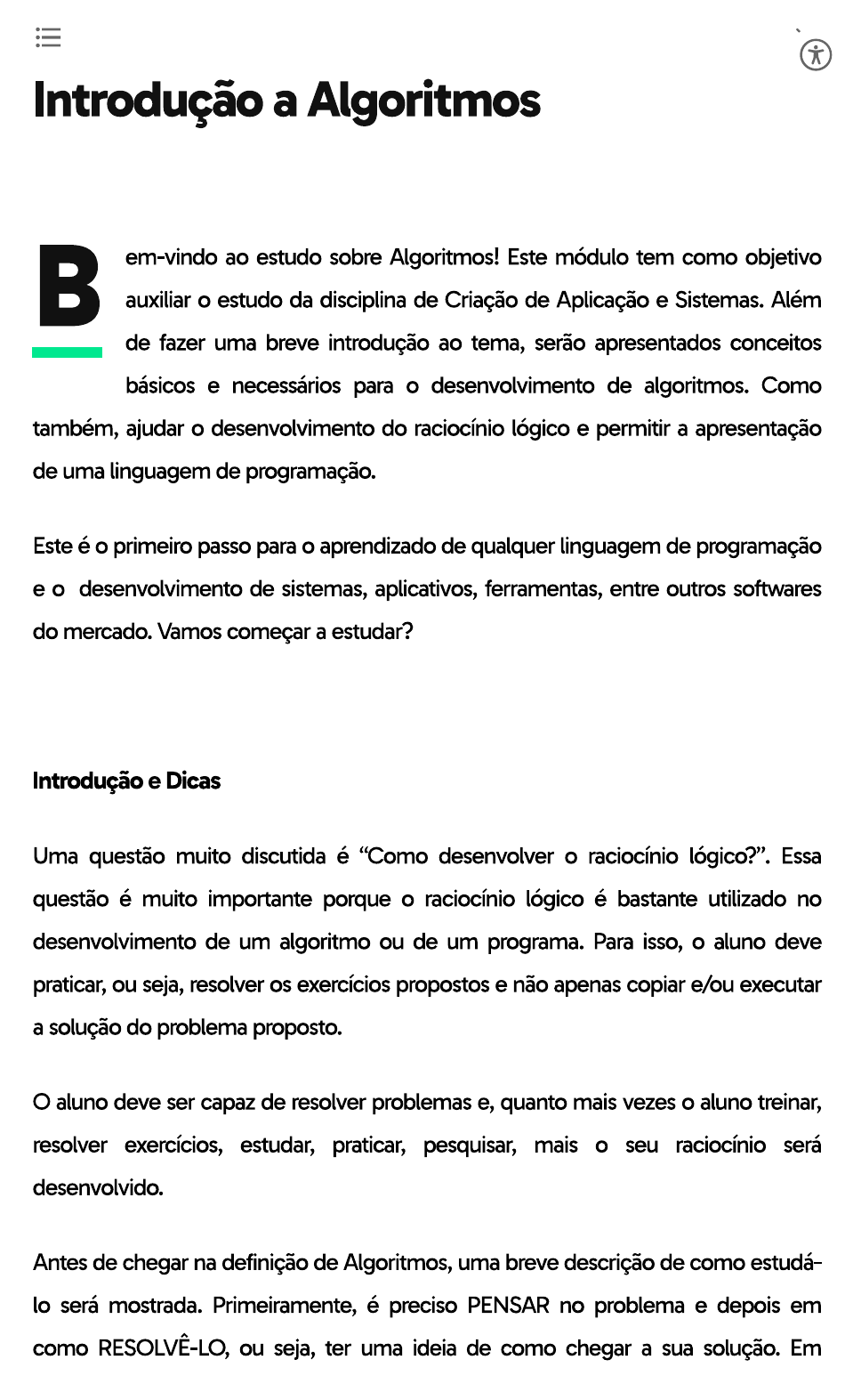 <p>Introdução a Algoritmos B em-vindo ao estudo sobre Algoritmos! Este módulo tem como objetivo auxiliar estudo da disciplina de Criação de Aplicação e Sistemas. Além de fazer uma breve introdução ao tema, serão apresentados conceitos básicos e necessários para desenvolvimento de algoritmos. Como também, ajudar o desenvolvimento do raciocínio lógico e permitir a apresentação de uma linguagem de programação. Este é o primeiro passo para o aprendizado de qualquer linguagem de programação e desenvolvimento de sistemas, aplicativos, ferramentas, entre outros softwares do mercado. Vamos começar a estudar? Introdução e Dicas Uma questão muito discutida é "Como desenvolver o raciocínio lógico?". Essa questão é muito importante porque raciocínio lógico é bastante utilizado no desenvolvimento de um algoritmo ou de um programa. Para isso, o aluno deve praticar, ou seja, resolver os exercícios propostos e não apenas copiar e/ou executar a solução do problema proposto. aluno deve ser capaz de resolver problemas e, quanto mais vezes aluno treinar, resolver exercícios, estudar, praticar, pesquisar, mais o seu raciocínio será desenvolvido. Antes de chegar na definição de Algoritmos, uma breve descrição de como estudá- lo será mostrada. Primeiramente, é preciso PENSAR no problema e depois em como RESOLVÊ-LO, ou seja, ter uma ideia de como chegar a sua solução. Em</p><p>seguida, transformar essa ideia em algoritmo conhecendo os passos para resolver problema em questão. Abaixo são descritos os passos para desenvolver um algoritmo: 1. Conhecer as regras (o que pode o que não pode); 2. Entender problema proposto (isso deve ficar claro na mente, é preciso conhecer bem cada detalhe do problema); 3. Indicar que deve ser feito e em que ordem (ter uma sequência e uma ordem lógica); 4. Executar a sequência de passos e verificar se estes passos realmente resolvem problema proposto (ou seja, verificar se chegou ao objetivo final); A maioria dos alunos faz apenas passo 1, porém o maior desafio está nos outros passos. Sendo assim, não basta somente conhecer as regras, é muito importante entender problema, indicar e ordenar os passos para resolvê-lo, executar essa sequência e verificar se a solução resolve problema proposto e resultado desejado. Uma sequência de ações para resolver problema de atravessar a rua foi descrita no exemplo abaixo. Um exemplo de problema: Atravessar uma rua. Regras para atravessar a rua: Passar de uma calçada para outra sem ser atropelado Sequência de ações para resolver problema:</p><p>1. Olhar para a esquerda; 2. Olhar para a direita; 3. Se estiver vindo algum carro - espere; 4. Repita os passos 1 e 2; 5. Senão estiver vindo carro - atravesse. Observação: Não existe apenas uma maneira de atravessar a rua. Então, é possível ter uma solução válida e diferente para mesmo problema. Para saber se a solução proposta está correta, basta executar ou simular os passos, e verificar se atingiu objetivo, ou seja, se resolveu o problema. Algoritmos Segundo Puga e Rissetti (2016), algoritmo é uma sequência de instruções que resolve determinado problema. Uma receita de bolo, por exemplo, pode ser considerada um algoritmo. Veja o detalhamento desse caso a seguir. Problema: Vender um bolo. Ingredientes: ovo, farinha, leite, chocolate e manteiga. Passos: coloque o e a farinha e bata até a mistura ficar homogênea. Em seguida, adicione os demais ingredientes, bata por 3 min. Despeje conteúdo numa assadeira. Aqueça forno a 180 graus por 5 min. Coloque a assadeira no forno por 40 min. Resultado: Bolo pronto para a venda.</p><p>Alguns outros conceitos que auxiliam entendimento sobre algoritmos: Lógica Segundo Puga e Rissetti (2016) "Lógica é "...uma linguagem racional". Outra definição segundo dicionário Michaelis, "lógica é a análise das formas e leis do pensamento... a maneira pela qual um pensamento ou uma ideia são organizados e apresentados". Para resolver um problema e transformar a solução em um algoritmo é preciso fazer uso da lógica, que está presente em diversas áreas da computação. Acompanhe a seguir um exemplo. Exemplo: Passos para fazer bolo. Lógica de Programação: Raciocínio para criação de um algoritmo. Quando surge a ideia para resolver o problema (PUGA e RISSETTI, 2016). Exemplo: Quero fazer um bolo. Algoritmo: quando essa ideia é transformada em uma sequência de passos para resolver um determinado problema (PUGA e RISSETTI, 2016). Exemplo: Receita. Programa: transformação de um Algoritmo em uma linguagem de programação específica, isto é, um algoritmo que possa ser executado em um computador (PUGA e RISSETTI, 2016). Exemplo: Quando os passos da receita são executados utilizando a batedeira, que pode ser considerada computador nesta analogia. Formas de Representação de Algoritmos</p><p>Linguagem Natural A primeira opção é utilizar a linguagem natural (Por exemplo atravessar a rua ou fazer um bolo, como discutido anteriormente). Esta forma tem uma grande desvantagem, pode ser interpretada de forma errada, distinta ou dúbia (MANZANO e OLIVEIRA, 2012). Fluxograma Uma representação gráfica de algoritmos, com formas geométricas diferentes para mostrar as ações do algoritmo. Tem como objetivo ser prático e facilitar o entendimento da ideia (MANZANO e OLIVEIRA, 2012). Diagrama de Chapin A ideia era substituir o fluxograma, pois representa uma visão hierárquica e estruturada da lógica de programação (MANZANO e OLIVEIRA, 2012). Pseudocódigo Pseudocódigo, também conhecido como português estruturado ou portugol. Este é o ponto intermediário entre o entendimento humano e uma linguagem de programação. É o modelo (ou representação) mais próximo de uma linguagem de programação (MANZANO e OLIVEIRA, 2012). Através dessa forma de representação é que serão apresentados os algoritmos nesta disciplina. Portanto, será possível executar os algoritmos atr