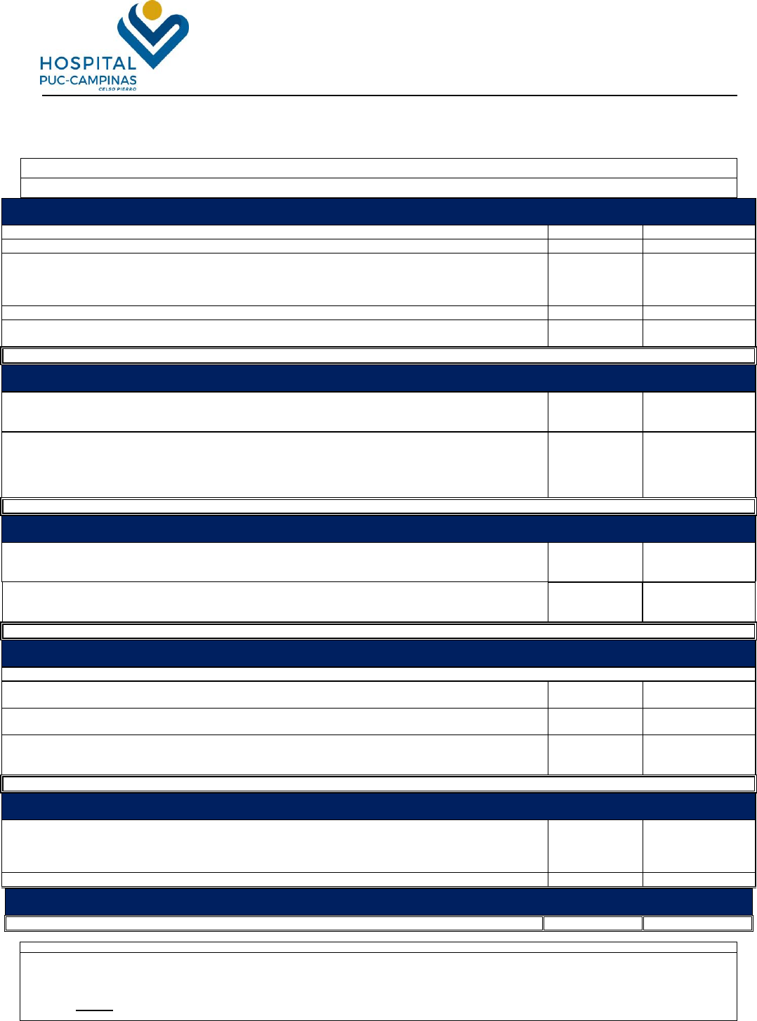 <p>Página 21 de 24</p><p>SOCIEDADE CAMPINEIRA DE EDUCAÇÃO E INSTRUÇÃO</p><p>HOSPITAL PUC-CAMPINAS “CELSO PIERRO”</p><p>ANEXO I</p><p>Concurso de Residência Médica – 2ª Fase</p><p>CURSO DE GRADUAÇÃO</p><p>Pontuação: 20 pontos</p><p>1. Internato: hospital próprio (4 pontos) Máximo 4</p><p>2. Conclusão do Curso (subtrair 2 pontos por ano perdido)</p><p>3. Histórico escolar (correlacionar nota com área de interesse no internato)</p><p>Nota de 5 a 6 – 2 pontos</p><p>Nota de 7 a 8 – 4 pontos</p><p>Nota de 9 a 10 – 8 pontos</p><p>Máximo 08</p><p>4. Sanções disciplinares (menos 5 pontos por sanção)</p><p>5. Monitoria Remunerada (4 pontos por monitoria)</p><p>Monitoria Não Remunerada (2 pontos por Monitoria)</p><p>Máximo 08</p><p>Subtotal: máximo de 20 pontos.</p><p>ATIVIDADES CIENTÍFICAS E PUBLICAÇÕES</p><p>Pontuação: 20 pontos.</p><p>1. Artigos Científicos publicados em periódicos sem fator de impacto = 1 ponto por publicação.</p><p>2. Periódicos indexados com fator de impacto menor ou igual a 0,5 = 2 pontos por publicação.</p><p>3. Periódicos indexados com fator de impacto maior que 1,0 = 10 pontos.</p><p>Máximo 10</p><p>Comunicação em Congressos: temas livres; pôsteres:</p><p>- Congressos internacionais = Tema Livre: 4 pontos por comunicação; Pôster 2;</p><p>- Congressos nacionais = Tema Livre: 2 pontos por comunicação; Pôster 1;</p><p>- Congressos regionais = Tema Livre: 1 ponto por comunicação; Pôster 0,5;</p><p>- Congressos acadêmicos (oficiais da Instituição) = Tema Livre: 0,5 pontos por comunicação; Pôster 0,5;</p><p>Máximo 10</p><p>Subtotal: máximo de 20 pontos.</p><p>ATIVIDADES DE PESQUISA</p><p>Pontuação: 30 pontos.</p><p>INICIAÇÃO CIENTÍFICA</p><p>1. Participação como membro efetivo em pesquisas com bolsa de iniciação científica – 16 pontos</p><p>2. Participação como membro efetivo em pesquisas sem bolsa de iniciação científica – 4 pontos</p><p>Máximo 20</p><p>ATIVIDADE DE EXTENSÃO</p><p>1. Para os bolsistas de extensão em área afim – 8 pontos</p><p>2. Para os alunos voluntários de extensão em área afim – 2 pontos</p><p>Máximo 10</p><p>Subtotal: máximo de 30 pontos</p><p>ATIVIDADES DE VOLUNTARIADO E/OU ÓRGÃOS COLEGIADOS:</p><p>Pontuação: 15 pontos.</p><p>1. Centro acadêmico, representante discente em órgãos colegiados vinculados a Faculdade /</p><p>Universidade, (0,5 ponto por Atividade Comprovada) - máximo 5 pontos.</p><p>Máximo 5</p><p>2. Organização de congressos, cursos, ligas – vinculadas a Faculdade / Universidade. (1 ponto por</p><p>Atividade Comprovada) - máximo de 5 pontos.</p><p>Máximo 5</p><p>3.Atividades de voluntariado: Mutirão de atendimento, atividades de enfrentamento COVID 19, atividades</p><p>sociais de saúde (Medicina Sem Fronteiras e similares): faz-se necessário certificado comprovando o</p><p>voluntariado. (1 ponto por atividade comprovada).</p><p>Máximo 5</p><p>Subtotal: máximo de 15 pontos</p><p>PROFICIÊNCIA EM IDIOMAS:</p><p>Pontuação: 15 pontos.</p><p>Proficiência comprovada em língua Inglesa:</p><p>1.Língua Inglesa:</p><p>Cambridge, FCA, TOEIC, CPE IELTS e DLE com certificação maior ou igual a B2 – 15 pontos</p><p>TOEFL maior ou igual a 460 pontos – 15 pontos</p><p>Máximo 15</p><p>Subtotal: máximo de 15 pontos</p><p>Composição da Nota Final:</p><p>NOTA FINAL</p><p>Nota da 1ª fase:</p><p>Prova MÚLTIPLA ESCOLHA x 70 = A</p><p>Prova DISSERTATIVA x 20 = B</p><p>Nota da 2ª fase:</p><p>AVALIAÇÃO CURRICULAR: x 10 = C</p><p>Nota Final = A + B + C</p><p>100</p><p>Assinatura + carimbo Assinatura + carimbo Assinatura + carimbo</p><p>NOME DO CANDIDATO:</p><p>ESPECIALIDADE:</p><p>AVALIAÇÃO CURRICULAR</p><p>Pontuação: 100 pontos.</p><p>Total Geral: (máximo de 100 pontos)</p>