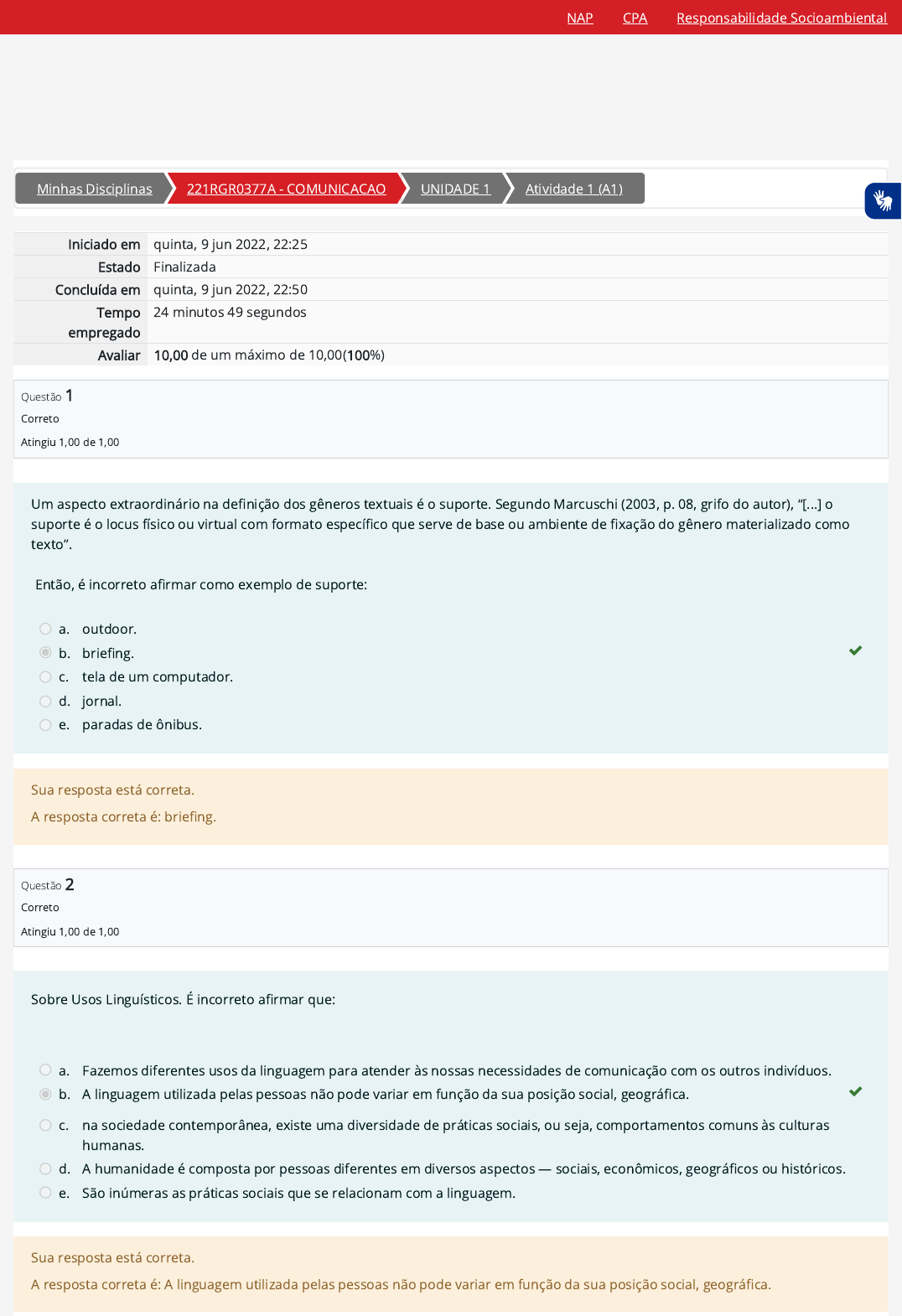 <p>Minhas Disciplinas 221RGR0377A - COMUNICACAO UNIDADE 1 Atividade 1 (A1)</p><p>Iniciado em quinta, 9 jun 2022, 22:25</p><p>Estado Finalizada</p><p>Concluída em quinta, 9 jun 2022, 22:50</p><p>Tempo</p><p>empregado</p><p>24 minutos 49 segundos</p><p>Avaliar 10,00 de um máximo de 10,00(100%)</p><p>Questão 1</p><p>Correto</p><p>Atingiu 1,00 de 1,00</p><p>Questão 2</p><p>Correto</p><p>Atingiu 1,00 de 1,00</p><p>Um aspecto extraordinário na de�nição dos gêneros textuais é o suporte. Segundo Marcuschi (2003, p. 08, grifo do autor), “[...] o</p><p>suporte é o locus físico ou virtual com formato especí�co que serve de base ou ambiente de �xação do gênero materializado como</p><p>texto”.</p><p>Então, é incorreto a�rmar como exemplo de suporte:</p><p>a. outdoor.</p><p>b. brie�ng. </p><p>c. tela de um computador.</p><p>d. jornal.</p><p>e. paradas de ônibus.</p><p>Sua resposta está correta.</p><p>A resposta correta é: brie�ng.</p><p>Sobre Usos Linguísticos. É incorreto a�rmar que:</p><p>a. Fazemos diferentes usos da linguagem para atender às nossas necessidades de comunicação com os outros indivíduos.</p><p>b. A linguagem utilizada pelas pessoas não pode variar em função da sua posição social, geográ�ca. </p><p>c. na sociedade contemporânea, existe uma diversidade de práticas sociais, ou seja, comportamentos comuns às culturas</p><p>humanas.</p><p>d. A humanidade é composta por pessoas diferentes em diversos aspectos — sociais, econômicos, geográ�cos ou históricos.</p><p>e. São inúmeras as práticas sociais que se relacionam com a linguagem.</p><p>Sua resposta está correta.</p><p>A resposta correta é: A linguagem utilizada pelas pessoas não pode variar em função da sua posição social, geográ�ca.</p><p>NAP CPA Responsabilidade Socioambiental</p><p>https://ambienteacademico.com.br/my/</p><p>https://ambienteacademico.com.br/course/view.php?id=12244</p><p>https://ambienteacademico.com.br/course/view.php?id=12244§ion=2</p><p>https://ambienteacademico.com.br/mod/quiz/view.php?id=381424</p><p>https://codely-fmu-content.s3.amazonaws.com/Moodle/NAP/inicial/nap/fmu/index.html</p><p>https://codely-fmu-content.s3.amazonaws.com/Moodle/CPA/landing_CPA/index.html</p><p>https://portal.fmu.br/sustentabilidade</p><p>Questão 3</p><p>Correto</p><p>Atingiu 1,00 de 1,00</p><p>Questão 4</p><p>Correto</p><p>Atingiu 1,00 de 1,00</p><p>A intertextualidade entre gêneros textuais ocorre quando um gênero assume a forma de outro, em função de um propósito</p><p>comunicativo. A hibridização, _______________, pode ser bastante perceptível em anúncios, tirinhas e charges.</p><p>a. padronização</p><p>b. formalidade</p><p>c. interlocutor</p><p>d. modalidade</p><p>e. intergenericidade </p><p>Sua resposta está correta.</p><p>A resposta correta é: intergenericidade</p><p>Con�rma-se no Dicionário de Português Dicio que: norma é um “[...] princípio que serve de regra, de lei”. Assim, ao se falar em norma</p><p>na língua, pensa-se quase que imediatamente na gramática normativa, que busca explicitar como a língua deve ser. Portanto, a</p><p>escolha da variedade considerada padrão leva em consideração, também, a escrita de textos literários consagrados nacionalmente,</p><p>geralmente obedientes à escrita gramaticalmente aceita como “correta”.</p><p>Sinalize a alternativa correta:</p><p>a. Quando uma norma ou regra da variedade padrão da língua é obedecida, costuma-se dizer que há um erro.</p><p>b. Com o frequente uso dessas expressões, elas acabam sendo ignoradas ao vocabulário da população.</p><p>c. Esse não é o caso de palavras como “marketing” e “status”, que são comumente utilizadas pelos falantes da língua portuguesa</p><p>no Brasil, e tem a necessidade de uma tradução.</p><p>d. A norma possui um caráter estático, enquanto que a fala — materialização da língua pelos usuários — é dinâmica, o que</p><p>permite sua evolução a partir, por exemplo, do contato com outras línguas, das quais surge o que se chama de</p><p>empréstimos linguísticos.</p><p></p><p>e. Muitas vezes, a ausência de aplicação de uma regra gramatical com certamente prejudica a comunicação.</p><p>Sua resposta está correta.</p><p>A resposta correta é: A norma possui um caráter estático, enquanto que a fala — materialização da língua pelos usuários — é</p><p>dinâmica, o que permite sua evolução a partir, por exemplo, do contato com outras línguas, das quais surge o que se chama de</p><p>empréstimos linguísticos.</p><p>NAP CPA Responsabilidade Socioambiental</p><p>https://codely-fmu-content.s3.amazonaws.com/Moodle/NAP/inicial/nap/fmu/index.html</p><p>https://codely-fmu-content.s3.amazonaws.com/Moodle/CPA/landing_CPA/index.html</p><p>https://portal.fmu.br/sustentabilidade</p><p>Questão 5</p><p>Correto</p><p>Atingiu 1,00 de 1,00</p><p>Questão 6</p><p>Correto</p><p>Atingiu 1,00 de 1,00</p><p>A�rmar-se sobre a linguagem mista:</p><p>a. Que se desponta ao preservar ou subverter o sentido do texto original.</p><p>b. Se manifesta com acréscimos, supressões ou substituições</p><p>c. Ocorre quando não há a citação expressa da fonte ou de um trecho do texto-fonte.</p><p>d. Que se manifesta tanto por sinais verbais quanto por sinais não verbais. São exemplos dessa linguagem as histórias em</p><p>quadrinhos, que reúnem, além das palavras, imagens.</p><p></p><p>e. Ocorre quando a apropriação do texto-fonte sofre modi�cações.</p><p>Sua resposta está correta.</p><p>A resposta correta é: Que se manifesta tanto por sinais verbais quanto por sinais não verbais. São exemplos dessa linguagem as</p><p>histórias em quadrinhos, que reúnem, além das palavras, imagens.</p><p>Toda a atividade comunicativa humana ocorre por meio dos gêneros textuais:</p><p>a. Que são indiferentes usos da linguagem para atender às nossas necessidades de comunicação com os outros indivíduos.</p><p>b. Que são 