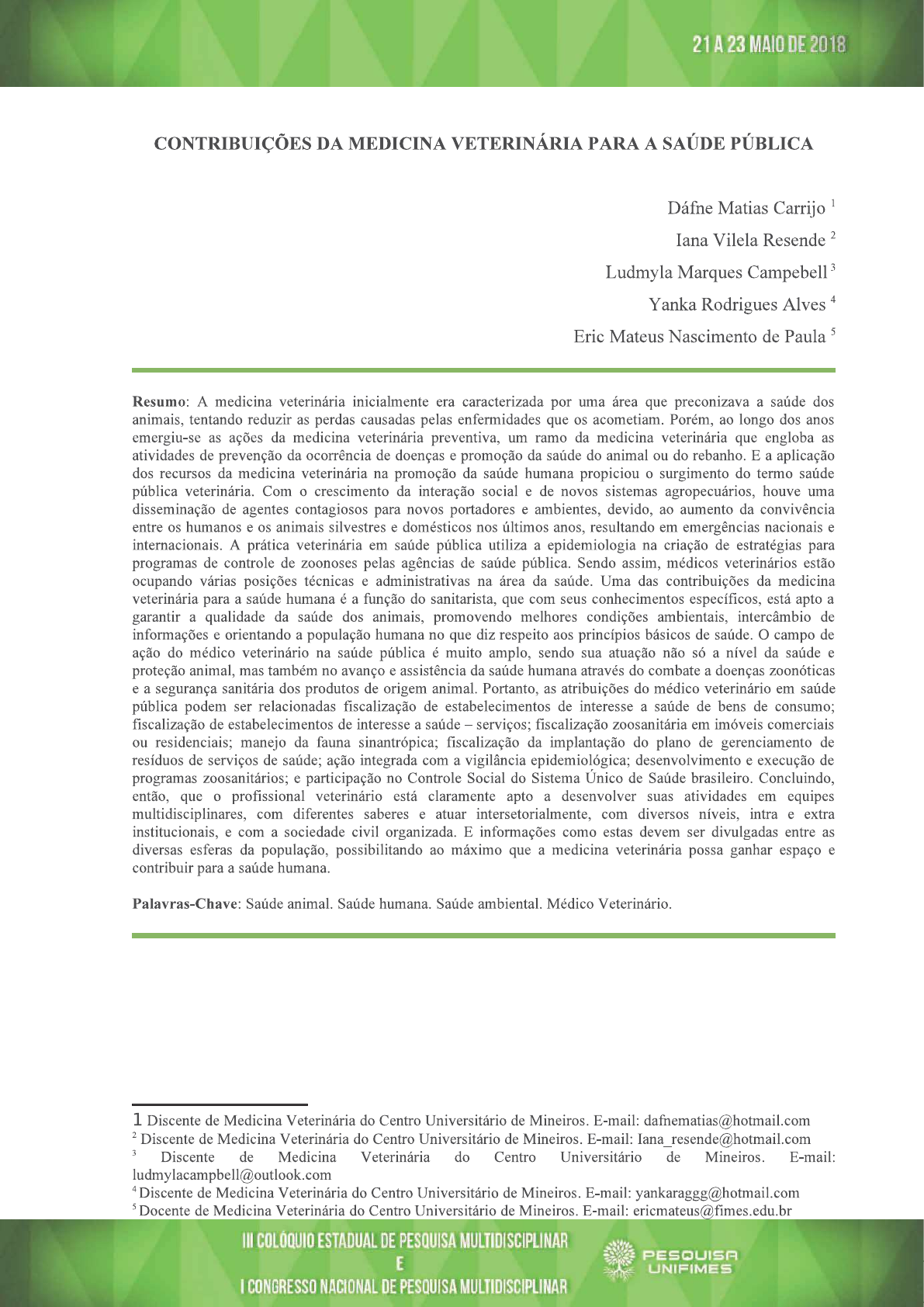 <p>CONTRIBUIÇÕES DA MEDICINA VETERINÁRIA PARA A SAÚDE PÚBLICA Dáfne Matias Carrijo Iana Vilela Resende Ludmyla Marques Campebell Yanka Rodrigues Alves Eric Mateus Nascimento de Paula 5 Resumo: A medicina veterinária inicialmente era caracterizada por uma área que preconizava a saúde dos animais, tentando reduzir as perdas causadas pelas enfermidades que os acometiam. Porém, ao longo dos anos emergiu-se as ações da medicina veterinária preventiva, um ramo da medicina veterinária que engloba as atividades de prevenção da ocorrência de doenças e promoção da saúde do animal ou do rebanho. E a aplicação dos recursos da medicina veterinária na promoção da saúde humana propiciou o surgimento do termo saúde pública veterinária. Com o crescimento da interação social e de novos sistemas agropecuários, houve uma disseminação de agentes contagiosos para novos portadores e ambientes, devido, ao aumento da convivência entre os humanos e os animais silvestres e domésticos nos últimos anos. resultando em emergências nacionais e internacionais. A prática veterinária em saúde pública utiliza a epidemiologia na criação de estratégias para programas de controle de zoonoses pelas agências de saúde pública. Sendo assim, médicos veterinários estão ocupando várias posições técnicas e administrativas na área da saúde. Uma das contribuições da medicina veterinária para a saúde humana é a função do sanitarista, que com seus conhecimentos específicos, está apto a garantir a qualidade da saúde dos animais, promovendo melhores condições ambientais, intercâmbio de informações e orientando a população humana no que diz respeito aos princípios básicos de saúde. O campo de ação do médico veterinário na saúde pública é muito amplo, sendo sua atuação não só a nível da saúde e proteção animal, mas também no avanço e assistência da saúde humana através do combate a doenças zoonóticas e a segurança sanitária dos produtos de origem animal. Portanto, as atribuições do médico veterinário em saúde pública podem ser relacionadas fiscalização de estabelecimentos de interesse a saúde de bens de consumo; fiscalização de estabelecimentos de interesse a saúde serviços; fiscalização zoosanitária em imóveis comerciais ou residenciais; manejo da fauna sinantrópica; fiscalização da implantação do plano de gerenciamento de resíduos de serviços de saúde; ação integrada com a vigilância epidemiológica; desenvolvimento e execução de programas zoosanitários; e participação no Controle Social do Sistema Único de Saúde brasileiro. Concluindo, então, que o profissional veterinário está claramente apto a desenvolver suas atividades em equipes multidisciplinares, com diferentes saberes e atuar intersetorialmente, com diversos níveis, intra e extra institucionais, e com a sociedade civil organizada. E informações como estas devem ser divulgadas entre as diversas esferas da possibilitando ao máximo que a medicina veterinária possa ganhar espaço e contribuir para a saúde humana. Palavras-Chave: Saúde animal. Saúde humana. Saúde ambiental. Médico 1 Discente de Medicina Veterinária do Centro Universitário de Mineiros. E-mail: dafnematias@hotmail.com 2 Discente de Medicina Veterinária do Centro Universitário de Mineiros. E-mail: 3 Discente de Medicina Veterinária do Centro Universitário de Mineiros. E-mail: ludmylacampbell@outlook.com Discente de Medicina Veterinária do Centro Universitário de Mineiros. E-mail: yankaraggg@hotmail.com 5 Docente de Medicina Veterinária do Centro Universitário de Mineiros. E-mail ericmateus@fimes.edu.br III ESTADUAL DE PESQUISA MULTIDISCIPLINAR E PESQUISA UNIFIMES</p>