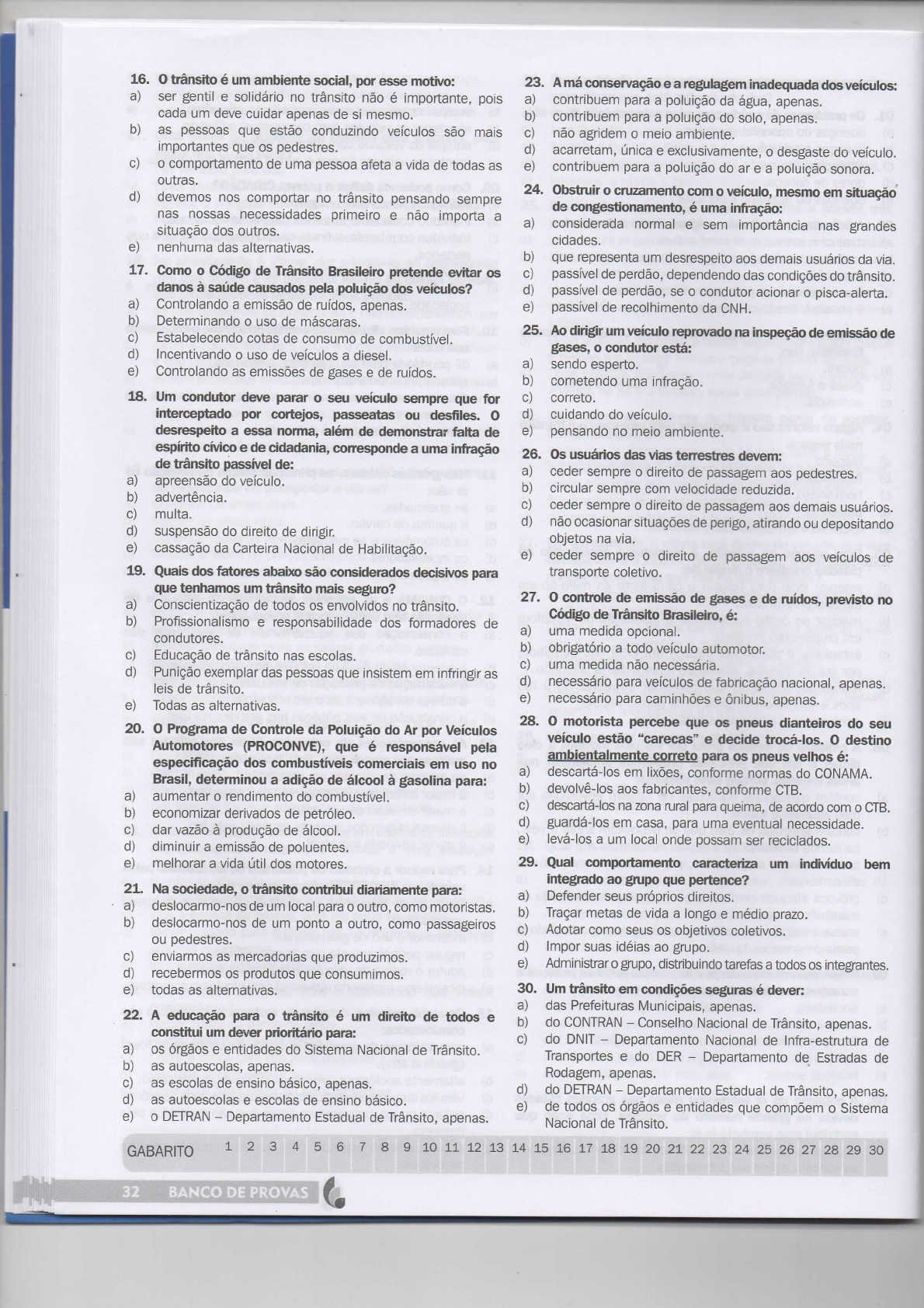 <p>16. o trânsito é um ambiente social, por esse motivo: 23. A má conservação e a regulagem inadequada dos veículos: a) ser gentil e solidário no trânsito não é importante, pois a) contribuem para a poluição da água, apenas. cada um deve cuidar apenas de si mesmo. b) contribuem para a poluição do solo, apenas. b) as pessoas que estão conduzindo veículos são mais c) não agridem o meio ambiente. importantes que os pedestres. d) acarretam, única e exclusivamente, o desgaste do veículo. c) o comportamento de uma pessoa afeta a vida de todas as e) contribuem para a poluição do ar e a poluição sonora. 24. Obstruir o cruzamento com o veículo, mesmo em situação d) devemos nos comportar no trânsito pensando sempre de congestionamento, é uma infração: nas nossas necessidades primeiro e não importa a a) considerada normal e sem importância nas grandes situação dos outros. cidades. e) nenhuma das alternativas. b) que representa um desrespeito aos demais usuários da via. 17. Como o Código de Trânsito Brasileiro pretende evitar os c) passível de perdão, dependendo das condições do trânsito. danos à saúde causados pela poluição dos veículos? d) passível de perdão, se o condutor acionar o pisca-alerta. a) Controlando a emissão de ruídos, apenas. e) passível de recolhimento da CNH. b) Determinando o uso de máscaras. 25. Ao dirigir um veículo reprovado na inspeção de emissão de c) Estabelecendo cotas de consumo de combustível. gases, o condutor está: d) Incentivando o uso de veículos a diesel. a) sendo esperto. e) Controlando as emissões de gases e de ruídos. b) cometendo uma infração. 18. Um condutor deve parar o seu veículo sempre que for c) correto. interceptado por cortejos, passeatas ou desfiles. o d) cuidando do veículo. desrespeito a essa norma, além de demonstrar falta de e) pensando no meio ambiente. espírito cívico e de cidadania, corresponde a uma infração 26. Os usuários das vias terrestres devem: de trânsito passível de: a) ceder sempre o direito de passagem aos pedestres. a) apreensão do veículo. b) circular sempre com velocidade reduzida. b) advertência. c) ceder sempre o direito de passagem aos demais usuários. c) multa. d) não ocasionar situações de perigo, atirando ou depositando d) suspensão do direito de dirigir. objetos na via. e) cassação da Carteira Nacional de Habilitação. e) ceder sempre o direito de passagem aos veículos de 19. Quais dos fatores abaixo são considerados decisivos para transporte coletivo. que tenhamos um trânsito mais seguro? 27. o controle de emissão de gases e de ruídos, previsto no a) Conscientização de todos os envolvidos no trânsito. Código de Trânsito Brasileiro, é: b) Profissionalismo e responsabilidade dos formadores de a) uma medida opcional. condutores. b) obrigatório a todo veículo automotor. c) Educação de trânsito nas escolas. c) uma medida não necessária. d) Punição exemplar das pessoas que insistem em infringir as d) necessário para veículos de fabricação nacional, leis de e) necessário para caminhões e ônibus, apenas. e) Todas as alternativas. 28. o motorista percebe que os pneus dianteiros do seu 20. o Programa de Controle da Poluição do Ar por Veículos veículo estão "carecas" e decide trocá-los. o destino Automotores (PROCONVE), que é responsável pela ambientalmente correto para os pneus velhos é: especificação dos combustíveis comerciais em uso no a) descartá-los em lixões, conforme normas do Brasil, determinou a adição de álcool à gasolina para: b) devolvê-los aos fabricantes, conforme CTB. a) aumentar o rendimento do c) descartá-los na zona rural para queima, de acordo com o CTB. b) economizar derivados de petróleo. d) guardá-los em casa, para uma eventual necessidade. c) dar vazão à produção de álcool. e) levá-los a um local onde possam ser reciclados. d) diminuir a emissão de poluentes. e) melhorar a vida útil dos motores. 29. Qual comportamento caracteriza um indivíduo bem integrado ao grupo que pertence? 21. Na sociedade, o trânsito contribui diariamente para: a) Defender seus próprios direitos. a) deslocarmo-nos de um local para o outro, como motoristas. b) Traçar metas de vida a longo e médio prazo. b) deslocarmo-nos de um ponto a outro, como passageiros c) Adotar como seus os objetivos coletivos. ou pedestres. d) Impor suas idéias ao grupo. c) enviarmos as mercadorias que produzimos. e) Administrar o grupo, distribuindo tarefas a todos os integrantes. d) recebermos os produtos que consumimos. e) todas as alternativas. 30. Um trânsito em condições seguras é dever: a) das Prefeituras Municipais, apenas. 22. A educação para o trânsito é um direito de todos e b) do CONTRAN Conselho Nacional de Trânsito, apenas. constitui um dever prioritário para: do DNIT Departamento Nacional de Infra-estrutura de a) os órgãos e entidades do Sistema Nacional de Trânsito. Transportes e do DER Departamento de Estradas de b) as autoescolas, apenas. Rodagem, apenas. c) as escolas de ensino básico, apenas. d) do DETRAN Departamento Estadual de Trânsito, apenas. d) as autoescolas e escolas de ensino básico. e) de todos os órgãos e entidades que compõem o Sistema e) o DETRAN Departamento Estadual de Trânsito, apenas. Nacional de Trânsito. GABARITO 1 2 3 4 5 6 7 8 9 10 11 12 13 14 15 16 17 18 19 20 21 22 23 24 25 26 27 28 29 30 32 BANCO DE PROVAS</p>