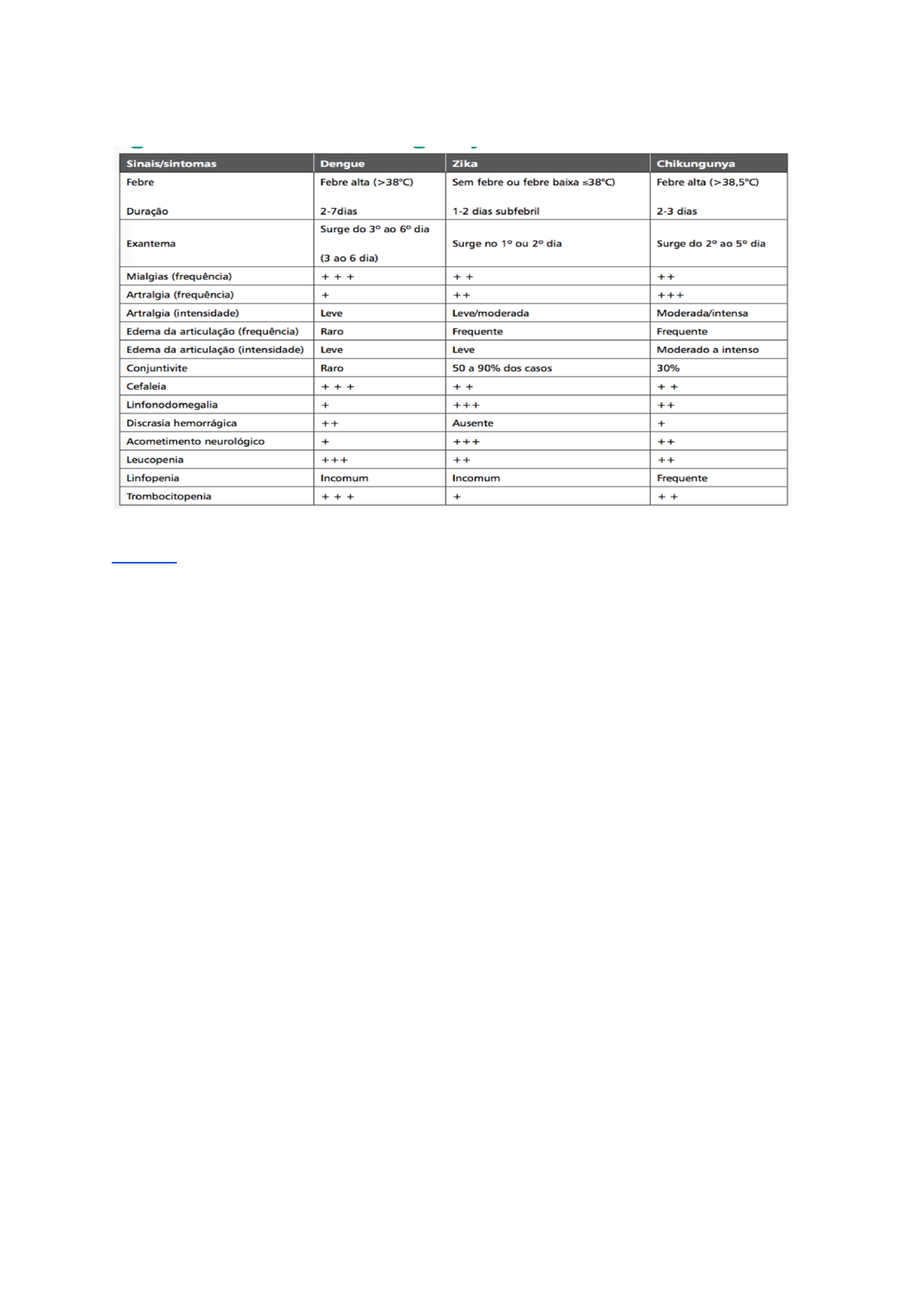 <p>Arboviroses</p><p>Dengue</p><p>● Dengue: arbovirose mais frequente no Brasil. Tem seus picos principalmente</p><p>nos meses de março a maio.</p><p>● Complexo anticorpo e antígeno NS1 e reação cruzada: lesão das células</p><p>endoteliais por reação cruzada e ativação da cascata do complemento →</p><p>● Exames laboratoriais: pode ocorrer plaquetopenia, elevação das</p><p>transaminases.</p><p>● Clínica: geralmente duas fases → fase febril e fase crítica.</p><p>○ Fase febril: primeiros dias. Sintomas gerais (astenia, febre alta (>38°c),</p><p>cefaléia, mialgia, náuseas, anorexia, dor retro-orbitária, vômitos e</p><p>diarreia.</p><p>○ Fase crítica: a partir do 3° ao 7° dia.</p><p>■ Importante: a febre na dengue diminui gradativamente, e</p><p>geralmente dura cerca de 7 dias. Quando a febre para muito</p><p>rapidamente, é um sinal de alarme.</p><p>■ Sinais de alarme: dor abdominal intensa e contínua, vômitos</p><p>persistentes, acúmulo de líquidos (ascite, derrame pleural com</p><p>MVF diminuído ou abolido, derrame pericárdico), hipotensão</p><p>postural e/ou lipotímia, hepatomegalia, sangramento de</p><p>mucosa.</p><p>● A presença desses sintomas a partir do 3° dia é</p><p>importante ficar atento.</p><p>■ Sinais de choque: pulso rápido e fraco, enchimento capilar</p><p>lento, hipotensão arterial, PA convergente (PAS-PAD <</p><p>20mmHg), oligúria.</p><p>● Importante! Perguntar ao paciente quais medicamentos ele toma e/ou tomou</p><p>para os sintomas: ficar atento aos anti-inflamatórios → podem piorar a</p><p>disfunção plaquetária.</p><p>● Exames laboratoriais:</p><p>○ Pesquisa de antígeno NS1: deve ser feita até o 5° dia.</p><p>○ Pesquisa de anticorpos IgM e IgG: pode ser feita a partir do 6° dia.</p><p>● Grupos de classificação:</p><p>○ A: paciente que apresenta síndrome febril, com epidemiologia positiva,</p><p>febre por menos de 7 dias + 2 ou mais sintomas típicos (artralgia,</p><p>cefaléia, dor retro orbitária, náusea, vômito, petéquias, leucopenia).</p><p>Paciente não pertence a um grupo especial: gestante, risco social ou</p><p>comorbidades.</p><p>○ B: relato de febre entre 2 e 7 dias associado a 2 ou mais sintomas</p><p>típicos + sangramento espontâneo de pele ou induzido (prova do laço</p><p>positiva) ou grupo especial (gestante, risco social ou comorbidades).</p><p>○ C: relato de febre entre 2 e 7 dias associado a 2 ou mais sintomas</p><p>típicos + sinais de alarme.</p><p>○ D: relato de febre entre 2 e 7 dias associado a 2 ou mais sintomas</p><p>típicos + sinais de gravidade.</p><p>Contar a quantidade de petéquias dentro do quadrado. Se 20 em adultos e 10 em</p><p>crianças → prova do laço positiva.</p><p>● Exame físico:</p><p>○ A avaliação do tempo de enchimento capilar é mandatória em todos os</p><p>casos atendidos como suspeitos de dengue.</p><p>○ Ectoscopia: avaliar o estado de hidratação. Destacar a importância de</p><p>pesquisar edema e manifestações hemorrágicas na pele, mucosas e</p><p>esclera.</p><p>○ PA: dúvida → para avaliação de hipotensão postural que o MS</p><p>recomenda a aferição da PA em 2 posições? No caso deitado e</p><p>sentado?</p><p>■ Quais seriam os achados no exame físico de um derrame</p><p>pericárdico?</p><p>○ ACV: Verificar PA arterial em duas posições, pulso, enchimento capilar,</p><p>frequência respiratória, temperatura e peso. Verificar sinais de derrame</p><p>pericárdico</p><p>■ Pinçamento da PA → a diferença entre a pressão arterial</p><p>sistólica e a diastólica será menor ou igual a 20mmHg,</p><p>caracterizando a pressão arterial convergente. Na dengue</p><p>acontece antes de uma queda substancial na PA</p><p>○ AR: pesquisar sinais de desconforto respiratório e derrame pleural.</p><p>Chikungunya</p><p>● Definição de um caso suspeito: paciente com febre aguda alta (>38,5°) com</p><p>intensa artralgia, que tenha estado em áreas epidemiológicas nas últimas 2</p><p>semanas.</p><p>● 3 fases: geralmente é apenas aguda.</p><p>○ Aguda: 5 a 14 dias.</p><p>○ Pós aguda: curso de até 3 meses.</p><p>○ Crônica: manutenção de sintomas por mais de 3 meses.</p><p>● Fase febril: febre alta de início súbito (>38,5°) que dura no máximo 14 dias;</p><p>poliartralgia intensa, simétrica, bilateral, em grandes e pequenas articulações</p><p>(braços, dedos, mãos, tornozelo, joelho); rigidez articular matinal; exantema</p><p>maculopapular (diferença do da dengue: ele vem junto com a febre, na</p><p>dengue o exantema vem com defervescência da febre, geralmente lá para o</p><p>6° dia), em crianças pode acontecer bolhas.</p><p>● Fase pós aguda: desaparecimento da febre. Pode haver melhora da artralgia,</p><p>persistência ou agravamento desta.</p><p>○ Pode evoluir com síndrome do túnel do carpo.</p><p>○ O edema pode permanecer.</p><p>○ Recorrência do prurido generalizado.</p><p>○ Exantema maculopapular além de lesões púrpuras.</p><p>● Fase crônica: poliartralgia ou oliartralgia de intensidade variável, geralmente</p><p>simétrica, que predomina em mãos, punhos, tornozelos e joelhos, em</p><p>associação com rigidez matinal e edema articular.</p><p>○ Critérios de classificação de doença articular inflamatória crônica</p><p>(DAIC) pós Chikungunya: mais que 4 articulações com artrite +</p><p>duração dos sintomas por mais de 6 semanas + ausência de</p><p>diagnóstico alternativo.</p><p>■ Importante! Eliminar outros diagnósticos diferenciais, como</p><p>artrite reumatoide, espondiloartrite, gota, doenças autoimunes,</p><p>disfunções da tireoide, hepatite viral crônica e sarcoidose.</p><p>● Manifestações clínicas:</p><p>○ Edema → na pele e nas articulações.</p><p>○ Púrpuras.</p><p>○ Formas mais graves:</p><p>■ Sistema nervoso: meningoencefalite, encefalopatia, convulsões,</p><p>guillain-barré, síndrome cerebelar, paresias, p
