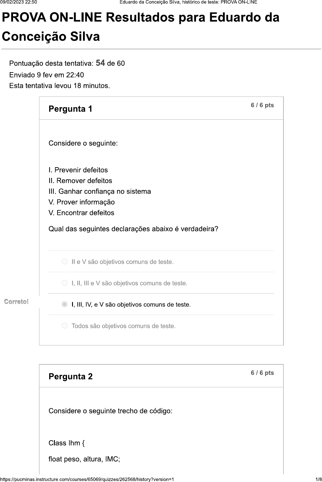 <p>09/02/2023 22:50 Eduardo da Conceição Silva, histórico de teste: PROVA ON-LINE PROVA ON-LINE Resultados para Eduardo da Conceição Silva Pontuação desta tentativa: 54 de 60 Enviado 9 fev em 22:40 Esta tentativa levou 18 minutos. 6 / 6 pts Pergunta 1 Considere o seguinte: I. Prevenir defeitos II. Remover defeitos III. Ganhar confiança no sistema V. Prover informação V. Encontrar defeitos Qual das seguintes declarações abaixo é verdadeira? e V são objetivos comuns de teste. I, II, III e V são objetivos comuns de teste. Correto! I, III, IV, e V são objetivos comuns de teste. Todos são objetivos comuns de teste. 6 / 6 pts Pergunta 2 Considere o seguinte trecho de código: Class Ihm { float peso, altura, IMC; https://pucminas.instructure.com/courses/65069/quizzes/262568/history?version= 1/8</p><p>09/02/2023 22:50 Eduardo da Conceição Silva, histórico de teste: PROVA ON-LINE leiaPeso(); leiaAltura(); IMC=peso*altura; If do peso"); } else { If ( (IMC>20)&&(IMC<=25)) else }//fim else } //fim class Qual é o número mínimo de casos de teste necessários para se testar o procedimento acima utilizando o critério de cobertura de desvios? 1 Correto! 3 4 2 6/6 pts Pergunta 3 Complete o texto abaixo: A diferença dos testes executados por uma equipe independente de testes e por usuários está nos objetivos dos testes de cada um. Enquanto os testadores buscam , os usuários buscam https://pucminas.instructure.com/courses/65069/quizzes/262568/history?version=1 2/8</p><p>09/02/2023 22:50 Eduardo da Conceição Silva, histórico de teste: PROVA ON-LINE Correto! Defeitos; inconformidades com as regras de negócio. Fazer bons planos testes; executar o plano de testes feito pelos testadores. Inconformidades com as regras de negócio; defeitos. Os melhores dados; os melhores processos. 6 / 6 pts Pergunta 4 Seja o seguinte cenário. Uma aplicação prevê uma interface de entrada de dados de sócios de um clube de funcionários de uma empresa. A aplicação precisa registrar dados cadastrais destes sócios e entre eles a idade dos mesmos. O campo idade, segundo a especificação de requisitos do sistema, deve aceitar valores entre 18 e 100 anos. Um Analista de testes planejou casos de testes para testar o cadastro de sócios com idades iguais a 17, 18, 100 e 101 anos. De acordo com o cenário apresentado, pode-se afirmar que: Analista de Testes adotou somente a técnica de Partição de Equivalência. A atitude do Analista de Testes mostra que o Princípio de que Testes exaustivos não são possíveis é falso. O Analista de Testes está equivocado uma vez que necessariamente todos os valores entre 18 e 100 inclusive deve ser testados no cadastro de sócios. Correto! O Analista de Testes adotou a técnica de Análise do Valor Limite. 3/8</p><p>09/02/2023 22:50 Eduardo da Conceição Silva, histórico de teste: PROVA ON-LINE Pergunta 5 pts No que se refere a testes de software, é correto afirmar que: teste de operação é a fase onde é testada a ergonomia da interface de uso do software Um teste bem sucedido é um teste que não encontra nenhum erro no software. Correto! teste de caixa branca, baseia-se em testar as estruturas do código fonte como, por exemplo, comandos condicionais e de repetição. O teste de caixa preta, baseia-se em analisar os arquivos de log do sistema procurando por mensagens de funcionamento inconsistente. Pergunta 6 pts Sejam as seguintes atividades relacionadas a teste de sistema: A) Verificar o tempo para emissão de uma B) Atingir o limite da capacidade de processamento de transações simultâneas. C) Para cada usuário, testar o nível de acesso dos mesmos às funções do sistema. D) Simular a queda da energia elétrica em um sistema, interrompendo o funcionamento do banco de dados. https://pucminas.instructure.com/courses/65069/quizzes/262568/history?version= 4/8</p><p>09/02/2023 22:50 Eduardo da Conceição Silva, histórico de teste: PROVA ON-LINE Sejam os seguintes tipos de teste de sistema: 1-Teste de segurança 2-Teste de recuperação 3-Teste de desempenho 4-Teste de stress Assinale a alternativa que contém a correspondência CORRETA: A-3, B-2, C-1, D-4 Correto! A-3, B-4, C-1, D-2 A-4, B-3, C-1, D-2 A-2, B-4, C-1, D-3 0/6 pts Pergunta 7 Um programa servidor recebe posições geográficas enviadas por dispositivos móveis e as grava em um banco de dados. Simula-se uma queda brusca do servidor durante a gravação de posições e mede-se o tempo para que ele retorne. Que tipo de teste de sistema é Teste de segurança. Teste de stress. esposta correta Teste de recuperação. respondeu Teste de desempenho. 5/8</p><p>09/02/2023 22:50 Eduardo da Conceição Silva, histórico de teste: PROVA ON-LINE 6/6 pts Pergunta 8 Observe as afirmações a seguir e escolha a alternativa correta. - Os casos de testes precisam ser revistos sempre e novos casos de testes precisam ser escritos para encontrar novos defeitos ou testar outras partes do sistema. PORQUE - de acordo com o Princípio do Paradoxo do pesticida, se os testes são repetidos muitas vezes, os mesmos testes não encontrarão mais defeitos. A asserção é uma proposição verdadeira, e a asserção é uma proposição A asserção é uma proposição falsa, e a asserção é uma proposição verdadeira. Correto! As asserções e são proposições verdadeiras, e a segunda é uma justificativa correta da primeira. As asserções e são proposições verdadeiras, mas a segunda não é uma justificativa correta da primeira. 6/6 pts Pergunta 9 Sobre os testes de software, é incorreto afirmar: 6/8</p><p>09/02/2023 22:50 Eduardo da Conceição Silva, histórico de teste: PROVA ON-LINE Correto! Os testes de aceitação verificam se todos os testes de unidade são executados sem erro. Os testes de integração procuram por falhas oriundas da integração interna dos componentes do sistema. Os testes de estresse permitem testar o limite de um sistema submetendo-o a situações extremas. Nos testes de unid