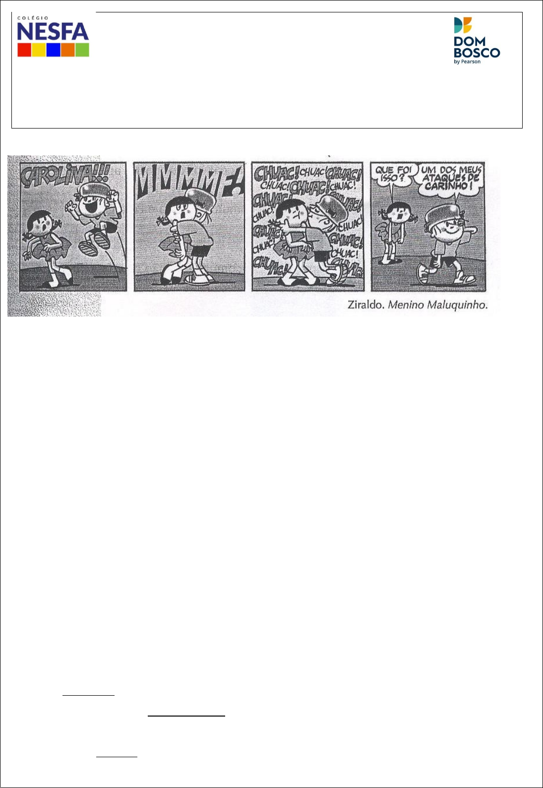 <p>Colégio NESFA</p><p>ATIVIDADE DE PORTUGUÊS- ADJETIVOS/LOCUÇÕES ADJETIVAS – 2ª ETAPA</p><p>Segmento: Ensino Fundamental II Série: 6º ano Professor(a): Juliana Gaburro</p><p>Esta atividade tem como objetivo o desenvolvimento das seguintes habilidades: Identificar o adjetivo em diferentes gêneros textuais. Elaborar o conceito de adjetivo. Saber que o adjetivo flexiona em gênero e número de acordo com o substantivo a que se refere. Empregar adequadamente o adjetivo. Conhecer o contexto de uso do adjetivo pátrio.</p><p>1 - Leia a tirinha e depois responda ao que se pede.</p><p>a) Na tirinha, há uma frase em que aparece uma locução adjetiva. Qual é essa frase? _________ ______________________________________________________________________________</p><p>b) Destaque a locução adjetiva e transforme-a em um adjetivo. ___________________________ ______________________________________________________________________________</p><p>2- Circule os adjetivos e, depois, ligue-os aos substantivos a que se referem:</p><p>a) O galo velhaco logrou a raposa.</p><p>b) A raposa esperta tentou enganar o galo.</p><p>c) Amigo, venho contar uma grande novidade.</p><p>d) Um velho galo percebeu a aproximação da raposa.</p><p>3- Sublinhe as locuções adjetivas e, depois ligue-as aos substantivos a que se referem:</p><p>a) É difícil conseguir carne de boi.</p><p>b) A alegria do pai é a felicidade do filho.</p><p>c) A voz do povo é a voz de Deus.</p><p>d) Amor de mãe não se acaba nunca.</p><p>4- Substitua as locuções adjetivas em destaque pelos adjetivos correspondentes:</p><p>a) A vida do campo está livre da poluição. ____________________________________________</p><p>b) A luz do sol faz crescer as plantas. ________________________________________________</p><p>c) Uma viagem por mar deve ser maravilhosa. ________________________________________</p><p>d) A criançada adora as festas de junho. _____________________________________________</p><p>e) As linhas de ferro são importantes para o desenvolvimento. ____________________________</p><p>5- Circule os adjetivos nas frases abaixo:</p><p>a) A terra era bem jovem e tudo estava por ser feito.</p><p>b) A brilhante zebra branca era por demais vaidosa.</p><p>c) Como sou bonita.</p><p>d) Zombava cruelmente do pobre babuíno.</p><p>e) O babuíno possui o traseiro rosado até os dias de hoje.</p><p>6- Assinale a frase em que:</p><p>a) A palavra “doces” é um adjetivo.</p><p>( ) As mangas doces eram colhidas pelas crianças.</p><p>( ) Naquela fazenda as crianças comeram muitos doces.</p><p>b) A palavra “velho” é adjetivo.</p><p>( ) Um velho apareceu na rua.</p><p>( ) Um homem velho apareceu na rua.</p><p>c) A palavra “estranho”é adjetivo.</p><p>( ) As crianças chegaram em um lugar estranho.</p><p>( ) Um estranho pediu-nos algumas informações</p><p>7. Leia e complete com o adjetivo adequado.</p><p>Substantivo</p><p>Locução adjetiva</p><p>Adjetivo</p><p>Carinha</p><p>de anjo</p><p>Carinha angelical</p><p>Ave</p><p>da noite</p><p>Casa</p><p>do campo</p><p>Criança</p><p>com febre</p><p>Música</p><p>do povo</p><p>Doenças</p><p>do coração</p><p>Planta</p><p>da água</p><p>Tratamento</p><p>do cabelo</p><p>Curso</p><p>da tarde</p><p>Porto</p><p>do rio</p><p>esmalte</p><p>sem cor</p><p>image1.png</p><p>image2.jpeg</p><p>image3.emf</p>