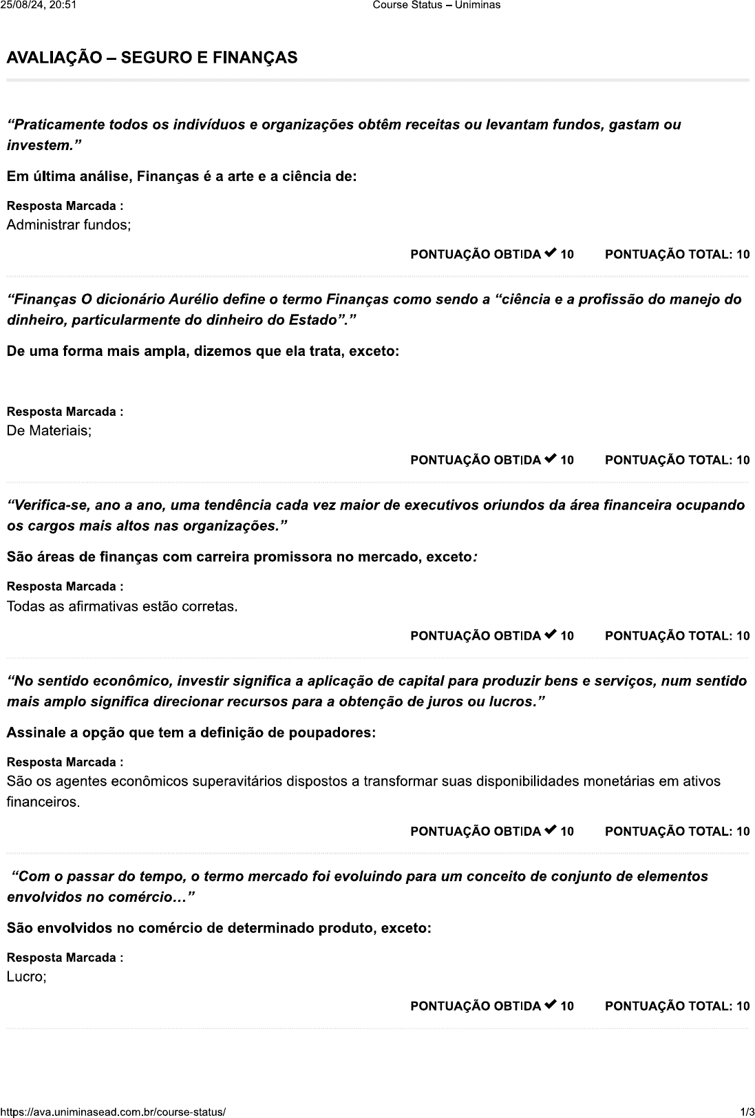<p>25/08/24, 20:51 Course Status - Uniminas AVALIAÇÃO - SEGURO E FINANÇAS "Praticamente todos os indivíduos e organizações obtêm receitas ou levantam fundos, gastam ou investem." Em última análise, Finanças é a arte e a ciência de: Resposta Marcada : Administrar fundos; PONTUAÇÃO OBTIDA 10 PONTUAÇÃO TOTAL: 10 "Finanças o dicionário Aurélio define o termo Finanças como sendo a "ciência e a profissão do manejo do dinheiro, particularmente do dinheiro do Estado"." De uma forma mais ampla, dizemos que ela trata, exceto: Resposta Marcada : De Materiais; PONTUAÇÃO OBTIDA 10 PONTUAÇÃO TOTAL: 10 "Verifica-se, ano a ano, uma tendência cada vez maior de executivos oriundos da área financeira ocupando os cargos mais altos nas organizações." São áreas de finanças com carreira promissora no mercado, exceto: Resposta Marcada : Todas as afirmativas estão corretas. PONTUAÇÃO OBTIDA 10 PONTUAÇÃO TOTAL: 10 "No sentido econômico, investir significa a aplicação de capital para produzir bens e serviços, num sentido mais amplo significa direcionar recursos para a obtenção de juros ou lucros." Assinale a opção que tem a definição de poupadores: Resposta Marcada : São os agentes econômicos superavitários dispostos a transformar suas disponibilidades monetárias em ativos financeiros. PONTUAÇÃO OBTIDA 10 PONTUAÇÃO TOTAL: 10 "Com o passar do tempo, o termo mercado foi evoluindo para um conceito de conjunto de elementos envolvidos no comércio..." São envolvidos no comércio de determinado produto, exceto: Resposta Marcada : Lucro; PONTUAÇÃO OBTIDA 10 PONTUAÇÃO TOTAL: 10 https://ava.uniminasead.com.br/course-status/ 1/3</p><p>25/08/24, 20:51 Course Status - Uniminas "As funções dos órgãos de regulação e fiscalização integrantes do subsistema normativo estão descritas a seguir. São componentes efetivos do CMN, exceto: Resposta Marcada : Ministro da Economia; PONTUAÇÃO OBTIDA 10 PONTUAÇÃO TOTAL: 10 "Finanças Empresariais requer do profissional financeiro conhecimento para decisões vitais no âmbito empresarial." Tais como, exceto: Resposta Marcada : Poupança; PONTUAÇÃO OBTIDA 10 PONTUAÇÃO TOTAL: 10 "Para alcançar os objetivos da política econômica global, são utilizadas quatro políticas." São as políticas utilizadas, exceto: Resposta Marcada : Do Banco do Brasil; PONTUAÇÃO OBTIDA 10 PONTUAÇÃO TOTAL: 10 "É o conjunto de medidas tomadas pelo governo de um país com o objetivo de atuar e influir sobre os mecanismos de produção, distribuição e consumo de bens e serviços." Em síntese, a política econômica global do Governo consiste em, exceto: Resposta Marcada : Todas as afirmativas estão corretas. PONTUAÇÃO OBTIDA 10 PONTUAÇÃO TOTAL: 10 "Como qualquer mercado, o Financeiro, também tem suas figuras básicas." São eles, exceto: Resposta Marcada : Banco; PONTUAÇÃO OBTIDA 10 PONTUAÇÃO TOTAL: 10 https://ava.uniminasead.com.br/course-status/ 2/3</p><p>25/08/24, 20:51 Course Status - Uniminas Total / 100 https://ava.uniminasead.com.br/course-status/ 3/3</p>
