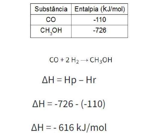 <p>Profa. Nelcilene Almeida</p><p>Componente: Química</p><p>Turmas: 2ª serie 3, 4 e 5.</p><p>Orientações: Faça o cabeçalho, em seguida copie o assunto no caderno para ser trabalhado na próxima aula.</p><p>Calculo da Variação de Entalpia</p><p>O cálculo da variação da entalpia (ΔH) é um procedimento matemático que utiliza as entalpias de cada um dos participantes de uma reação química para determinar a quantidade de energia que foi absorvida ou liberada por um processo químico qualquer.</p><p>Considere a equação abaixo:</p><p>A + B → C + D</p><p>Para realizar o cálculo da variação da entalpia dessa reação, é necessário conhecer as entalpias de cada um dos participantes (reagentes e produtos):</p><p>HA = Entalpia da substância A</p><p>HB = Entalpia da substância B</p><p>HC = Entalpia da substância C</p><p>HD = Entalpia da substância D</p><p>Tendo conhecimento sobre a entalpia de cada um dos participantes da reação, basta utilizar os valores na expressão matemática de subtração que representa a variação da entalpia, que é:</p><p>ΔH = Hp – Hr</p><p>Exemplo 1: O metanol é um líquido, inflamável e perigoso, que apresenta efeito tóxico no sistema nervoso, calcule a variação da entalpia do processo produção do fenol.</p><p>image1.png</p><p>image2.png</p><p>image3.png</p>
