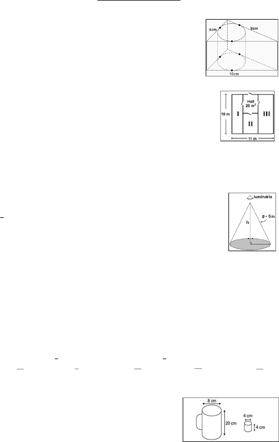 <p>1</p><p>AULA 19: Geometria Espacial I</p><p>1. (ENEM) Uma metalúrgica recebeu uma encomenda para fabricar, em grande quantidade, uma peca com o</p><p>formato de um prisma reto com base triangular, cujas dimensões da base são</p><p>6 cm, 8 cm e 10 cm e cuja altura e 10 cm. Tal peça deve ser vazada de tal</p><p>maneira que a perfuração na forma de um cilindro circular reto seja tangente as</p><p>suas faces laterais, conforme mostra a figura.</p><p>O raio da perfuração da peca e igual a:</p><p>a) 1cm b) 2cm c) 3cm d) 4cm e) 5cm</p><p>2. (ENEM) Em uma empresa, existe um galpão que precisa ser dividido em três depósitos e um hall de</p><p>entrada de 20m2, conforme a figura. Os depósitos I, II e III serão construídos para o</p><p>armazenamento de, respectivamente, 90, 60 e 120 fardos de igual volume, e suas</p><p>áreas devem ser proporcionais a essas capacidades. A largura do depósito III dever</p><p>ser, em metros, igual a:</p><p>a) 1 b) 2 c) 3 d) 4 e) 5</p><p>3. (ENEM) Uma fábrica produz barras de chocolates no formato de paralelepípedos e de cubos, com o</p><p>mesmo volume. As arestas da barra de chocolate no formato de paralelepípedo medem 3cm de largura,</p><p>18cm de comprimento e 4cm de espessura. Analisando as características das figuras geométricas descritas,</p><p>a medida das arestas dos chocolates que têm o formato de cubo é igual a:</p><p>a) 5 cm b) 6 cm c) 12 cm d) 24 cm e) 25 cm</p><p>4. (ENEM) Um arquiteto está fazendo um projeto de iluminação de ambiente e necessita</p><p>saber a altura que deverá instalar a luminária ilustrada na figura. Sabendo-se que a</p><p>luminária deverá iluminar uma área circular de 28,26m2, considerando = 3,14, a altura</p><p>h será igual a:</p><p>a) 3 m b) 4 m c) 5 m d) 9 m e) 16 m</p><p>5. (ENEM) Uma empresa de refrigerantes, que funciona sem interrupções, produz um volume constante de</p><p>1800000cm3 de líquido por dia. A máquina de encher garrafas apresentou um defeito durante 24 horas. O</p><p>inspetor de produção percebeu que o líquido chegou apenas à altura de 12cm dos 20cm previstos em cada</p><p>garrafa. A parte inferior da garrafa em que foi depositado o líquido tem forma cilíndrica com raio da base de</p><p>3cm. Por questões de higiene, o líquido já engarrafado não será reutilizado. Utilizando = 3, no período em</p><p>que a máquina apresentou defeito, aproximadamente quantas garrafas foram utilizadas?</p><p>a) 555 b) 5555 c) 1333 d) 13333 e) 133333</p><p>6. (ENEM) Certa marca de suco é vendida no mercado em embalagens tradicionais de forma cilíndrica.</p><p>Relançando a marca, o fabricante pôs à venda embalagens menores, reduzindo a embalagem tradicional à</p><p>terça parte de sua capacidade. Por questões operacionais, a fábrica que fornece as embalagens manteve a</p><p>mesma forma, porém reduziu à metade o valor do raio da base da embalagem tradicional na construção da</p><p>nova embalagem. Para atender à solicitação de redução da capacidade, após a redução no raio, foi</p><p>necessário determinar a altura da nova embalagem. Que expressão relaciona a medida da altura da nova</p><p>embalagem de suco (a) com a altura da embalagem tradicional (h)?</p><p>a)</p><p>12</p><p>h</p><p>a = b)</p><p>6</p><p>h</p><p>a = c)</p><p>3</p><p>h2</p><p>a = d)</p><p>3</p><p>h4</p><p>a = e)</p><p>3</p><p>h2</p><p>a =</p><p>7. (ENEM) Dona Maria, diarista na casa da família Teixeira, precisa fazer café para servir as vinte pessoas</p><p>que se encontram numa reunião na sala. Para fazer o café, Dona Maria dispõe de uma leiteira cilíndrica e</p><p>copinhos plásticos, também cilíndricos. Com o objetivo de não desperdiçar café, a diarista deseja colocar a</p><p>quantidade mínima de água na leiteira para encher os vinte copinhos</p><p>pela metade. Para que isso ocorra, Dona Maria deverá:</p><p>2</p><p>a) Encher a leiteira até a metade, pois ela tem um volume 20 vezes maior que o volume do copo.</p><p>b) Encher a leiteira toda de água, pois ela tem um volume 20 vezes maior que o volume do copo.</p><p>c) Encher a leiteira toda de água, pois ela tem um volume 10 vezes maior que o volume do copo.</p><p>d) Encher duas leiteiras de água, pois ela tem um volume 10 vezes maior que o volume do copo.</p><p>e) Encher cinco leiteiras de água, pois ela tem um volume 10 vezes maior que o volume do copo.</p><p>8. (ENEM) Devido aos fortes ventos, uma empresa exploradora de petróleo resolveu reforçar a segurança de</p><p>suas plataformas marítimas, colocando cabos de aço para melhor</p><p>afixar a torre central. Considere que os cabos ficarão perfeitamente</p><p>esticados e terão uma extremidade no ponto médio das arestas</p><p>laterais da torre central (pirâmide quadrangular regular) e a outra no</p><p>vértice da base da plataforma (que é um quadrado de lados paralelos</p><p>aos lados da base da torre central e centro coincidente com o centro</p><p>da base da pirâmide), como sugere a ilustração. Se a altura e a</p><p>aresta da base da torre central medem, respectivamente, 24 m e</p><p>m26 e o lado da base da plataforma mede m219 , então a</p><p>medida, em metros, de cada cabo será igual a:</p><p>a) 288 b) 313 c) 328 d) 400 e) 505</p><p>9. (ENEM) Para construir uma manilha de esgoto, um cilindro com 2m de diâmetro e 4m de altura (de</p><p>espessura desprezível), foi envolvido homogeneamente por uma camada de concreto, contendo 20cm de</p><p>espessura. Supondo que cada metro cúbico de concreto custe R$10,00 e tomando 3,1 como valor</p><p>aproximado de , então o preço dessa manilha e igual a:</p><p>a) R$ 230,40 b) R$ 124,00 c) R$104,16 d) R$ 54,56 e) R$ 49,60</p><p>10. (ENEM) Em muitas regiões do Estado do Amazonas, o volume de madeira de uma árvore cortada é</p><p>avaliado de acordo com uma prática dessas regiões:</p><p>I. Dá-se uma volta completa em torno do tronco comum barbante.</p><p>II. O barbante é dobrado duas vezes pela ponta e, em seguida, seu</p><p>comp