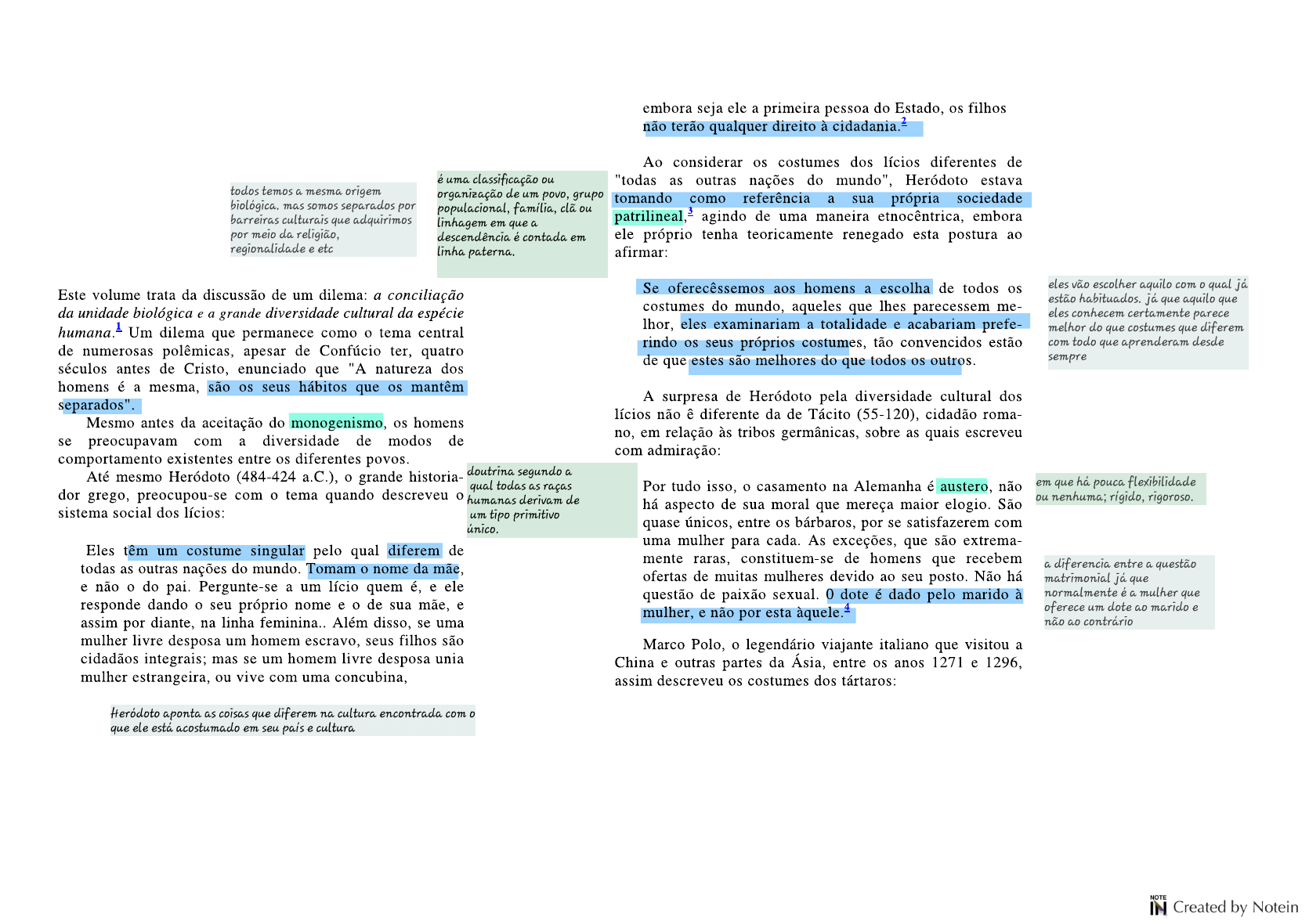 <p>embora seja ele a primeira pessoa do Estado, os filhos não terão qualquer direito à Ao considerar os costumes dos lícios diferentes de é uma classificação ou "todas as outras nações do mundo", Heródoto estava todos temos a mesma origem organização de um povo, grupo biológica. mas somos separados por tomando como referência a sua própria sociedade populacional, ou barreiras culturais que adquirimos linhagem em que a patrilineal, agindo de uma maneira etnocêntrica, embora por meio da religião, descendência é contada em ele próprio tenha teoricamente renegado esta postura ao regionalidade e etc linha paterna. afirmar: Se oferecêssemos aos homens a escolha de todos os eles vão escolher aquilo com qual já Este volume trata da discussão de um dilema: a conciliação estão habituados. já que aquilo que da unidade biológica e a grande diversidade cultural da espécie costumes do mundo, aqueles que lhes parecessem me- eles conhecem certamente parece Um dilema que permanece como o tema central lhor, eles examinariam a totalidade e acabariam prefe- melhor do que costumes que diferem rindo os seus próprios costumes, tão convencidos estão com todo que aprenderam desde de numerosas polêmicas, apesar de Confúcio ter, quatro de que estes são melhores do que todos os outros. sempre séculos antes de Cristo, enunciado que "A natureza dos homens é a mesma, são os seus hábitos que os mantêm A surpresa de Heródoto pela diversidade cultural dos lícios não ê diferente da de Tácito (55-120), cidadão roma- Mesmo antes da aceitação do monogenismo, os homens no, em relação às tribos germânicas, sobre as quais escreveu se preocupavam com a diversidade de modos de com admiração: comportamento existentes entre os diferentes povos. Até mesmo Heródoto (484-424 a.C.), o grande historia- doutrina segundo a qual todas as Por tudo isso, o casamento na Alemanha é austero, não em que há pouca flexibilidade dor grego, preocupou-se com o tema quando descreveu o humanas derivam de ou nenhuma; rigoroso. há aspecto de sua moral que mereça maior elogio. São sistema social dos lícios: um tipo primitivo único. quase únicos, entre os bárbaros, por se satisfazerem com uma mulher para cada. As que são extrema- Eles têm um costume singular pelo qual diferem de mente raras. constituem-se de homens que recebem todas as outras nações do mundo. Tomam o nome da mãe, a diferencia entre a questão ofertas de muitas mulheres devido ao seu posto. Não há matrimonial já que e não o do pai. Pergunte-se a um lício quem é, e ele questão de paixão sexual. 0 dote é dado pelo marido à normalmente é a mulher que responde dando o seu próprio nome e o de sua mãe, e mulher, e não por esta oferece um dote ao marido e assim por diante, na linha feminina.. Além disso, se uma não ao contrário mulher livre desposa um homem escravo, seus filhos são Marco Polo, o legendário viajante italiano que visitou a cidadãos integrais; mas se um homem livre desposa unia China e outras partes da Ásia, entre os anos 1271 e 1296, mulher estrangeira, ou vive com uma concubina, assim descreveu os costumes dos tártaros: Heródoto aponta as coisas que diferem na cultura encontrada com que ele está acostumado em seu pais e cultura IN Created by Notein</p><p>ele foca na discrição da aparência das moradias, no jeito que eles vivência entre si e sobre seu caráter Têm casas circulares, de madeira e cobertas de feltro, Montaigne (1533-1572) procurou não se espantar em é considerado estranho e que levam consigo onde vão, em carroças de quatro demasia com os costumes dos Tupinambá, de quem teve barbaro quando se diferenciam rodas... asseguro-lhes que as mulheres compram, ven- notícias e chegou mesmo a ter contato com três deles em da cultura e religião daquele que dem e fazem tudo o que é necessário para seus maridos e suas casas. Os homens não se têm de preocupar com Ruão, afirmando não ver nada de bárbaro ou selvagem no narra a situação coisa alguma, exceto a caça, a guerra e a falcoaria... Não que diziam a respeito deles, porque têm a que se coma a carne de cavalos e e se tome o leite de égua... Coisa alguma no inundo os na verdade, cada qual considera bárbaro o que não se faria tocar na mulher do outro: têm extrema consciência pratica em sua terra. de que isto é um erro e unia desgraça é um conceito que se Imbuído de um pioneiro sentido de relativismo cultural, opõe à categorização de culturas como "superiores" ou "inferiores" O padre José de Anchieta (1534-1597), ao contrário de Montaigne assim comentou a antropofagia dos Tupinambá: Heródoto, se surpreendeu com os costumes patrilineares dos canibalismo índios Tupinambá e escreveu aos seus superiores: Não me parece excessivo julgar bárbaros tais atos de crueldade, mas que o fato de condenar tais defeitos não ele mostra exemplos de hábitos O terem respeito às filhas cios irmãos é porque lhes nos leve à cegueira acerca dos nossos. Estimo que é mais culturais que se diferenciam chamam filhas e nessa conta as têm, e assim neque bárbaro comer um homem vivo do que o comer depois de levantando a questão de qual fornicarie as conhecem, porque têm para si que o morto; e é pior esquartejar um homem entre suplícios e deles é considerado mãos parentesco verdadeiro vem pela parte dos pais, que são tormentos e o queimar aos poucos, ou entregá-lo a cães e barbaro agentes; e que as mães não são mais que uns sacos, em porcos, a pretexto de devoção e fé, como não somente o respeito dos pais, em que se criam as crianças, e por esta lemos mas vimos ocorrer entre vizinhos nossos causa os filhos dos pais, posto que sejam havidos de escravas e contrárias cativas, são sempre livres e tão estimados como os outros; e os filhos das fêmeas, se são E terminou, ironicamente, após descrever diversos cos- desde começo é possível notar filhos de cativos, os têm por escravos e os vendem, e às t