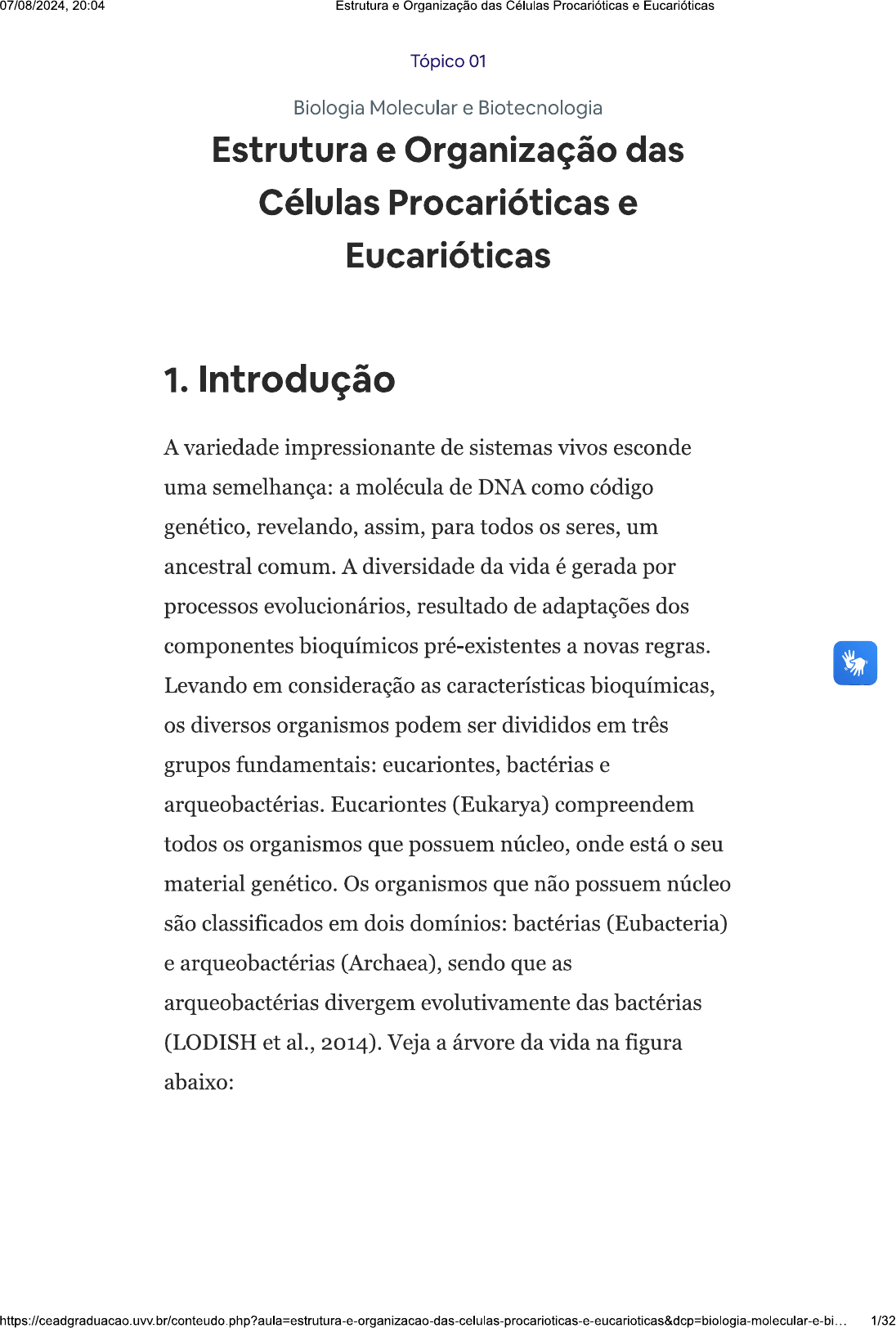 <p>20:04 Estrutura e Organização das Células Procarióticas e Eucarióticas Tópico 01 Biologia Molecular e Biotecnologia Estrutura e Organização das Células Procarióticas e Eucarióticas 1. Introdução A variedade impressionante de sistemas vivos esconde uma semelhança: a molécula de DNA como código genético, revelando, assim, para todos os seres, um ancestral comum. A diversidade da vida é gerada por processos evolucionários, resultado de adaptações dos componentes bioquímicos pré-existentes a novas regras. Levando em consideração as características bioquímicas, os diversos organismos podem ser divididos em três grupos fundamentais: eucariontes, bactérias e arqueobactérias. Eucariontes (Eukarya) compreendem todos os organismos que possuem núcleo, onde está o seu material genético. Os organismos que não possuem núcleo são classificados em dois domínios: bactérias (Eubacteria) e arqueobactérias (Archaea), sendo que as arqueobactérias divergem evolutivamente das bactérias (LODISH et al., 2014). Veja a árvore da vida na figura abaixo: 1/32</p><p>07/08/2024, 20:04 Estrutura e Organização das Células Procarióticas e Eucarióticas Domains Kingdoms of Organisms Domains Bacteria Archaea Eukarya Kingdoms Protists Fungi Plants Animals Diversidade de espécies. Ainda que haja semelhança entre bactérias e arqueias, os organismos procarióticos são um grupo bem diversificado do ponto de vista de suas constituições genéticas em relação aos organismos eucarióticos. Vamos ver como os procariotos estão organizados! 2. A Célula em Procariotos e seu Genoma Como as bactérias, as arqueobactérias são procariontes, sem um núcleo e sem organelas, com material genético disposto no citoplasma, sem separação dos outros componentes da célula por uma membrana. O local onde o material genético se concentra é chamado de nucleoide. No entanto, arqueobactérias se diferenciam das bactérias bioquimicamente. Elas são capazes de sobreviver em condições extremas, sendo consideradas extremófilos; são encontradas em ambientes como em altas profundidades</p><p>07/08/2024, 20:04 Estrutura e Organização das Células Procarióticas e Eucarióticas oceânicas, salmouras e em fontes de águas quentes. A parede celular das arqueobactérias é formada por um pseudopeptídeoglicano, são constituídas de polissacarídeos, glicoproteínas ou proteínas. Archaea não segue a via da glicólise ou ciclo de Krebs para obtenção de energia. Elas são autotróficas quimiossintetizantes. Algumas arqueas são capazes de usar compostos orgânicos para obter energia, mas a maioria é capaz de utilizar compostos inorgânicos, como a obtenção de energia do gás metano (metanogênicas). Arqueobactérias se reproduzem por fissão binária, fragmentação ou brotamento. Pyrolobus fumarii, Sulfolobus acidocaldarius, Pyrococcus furiosus, Methanobacterium formicum são exemplos de arqueobactérias. As bactérias possuem parede celular, localizada do lado de fora da membrana; a parede celular possui ligações éster da membrana lipídica com ácidos graxos. O domínio Bactéria possui uma enorme variedade de procariotos com uma grande variedade de morfologia (formas) e fisiologia (modo de obtenção de nutrientes e metabolismo) (LODISH et al., 2014). As bactérias algumas vezes possuem, revestindo a membrana plasmática, uma cápsula, um envoltório mucilaginoso que está relacionado à capacidade de causarem doenças. Veja na imagem de abaixo como a célula procariótica está organizada. 3/32</p><p>07/08/2024, 20:04 Estrutura e Organização das Células Procarióticas e Eucarióticas Célula bacteriana As bactérias podem se dividir assexuadamente (formando outra célula por fissão - divisão em duas). Elas não apresentam reprodução sexuada, mas recombinam seu material genético através de três processos: transformação, transdução ou conjugação. Veja na imagem abaixo como os processos de troca de material genético acontecem entre as bactérias: Na transformação, elas podem absorver fragmentos de DNA que se encontram dispersos no ambiente. Após incorporarem esse DNA exógeno, diz-se que elas estão transformadas. Na transdução bacteriana o material genético é trocado entre bactérias com a participação de um bacteriófago (vírus de bactéria). Já na conjugação, ocorre a passagem de DNA de uma célula doadora para uma receptora. Para isso, é necessária uma estrutura 4/32</p><p>07/08/2024, 20:04 Estrutura e Organização das Células Procarióticas e Eucarióticas conhecida como pili, que permite o contato entre as células bacterianas. A bactéria doadora possui um plasmídio conjugativo, que possui genes que codificam para o pili F Uma fita desse plasmídeo passa através do pili para a célula receptora. As fitas simples dos plasmídeos serão os moldes para que seja formada uma fita dupla em cada uma das células. Recombinação bacteriana. Esse processo é importante porque através dele muitas bactérias acabam por se tornar resistentes a antibióticos, uma vez que a resistência está codificada no plasmídeo. Os plasmídeos possuem todas as sequências necessárias para sua autoduplicação, sem interferência do DNA nuclear (LODISH et al., 2014). 5/32</p><p>07/08/2024, 20:04 Estrutura e Organização das Células Procarióticas e Eucarióticas A clonagem molecular amplamente utilizada na ciência, medicina, agricultura e indústria usa o plasmídeo bacteriano para colocar um gene, pedaço do DNA de outro organismo, dentro da bactéria para estudar seus efeitos. Essa técnica é conhecida como DNA recombinante. Genes de qualquer fonte podem ser quebrados em pedaços em um processo de manipulação artificial de DNA para obtenção de moléculas de interesses industriais. No entanto, os processos de transformação, transdução ou conjugação não geram outra célula, por isso não são considerados como reprodução, mas há uma troca de mater