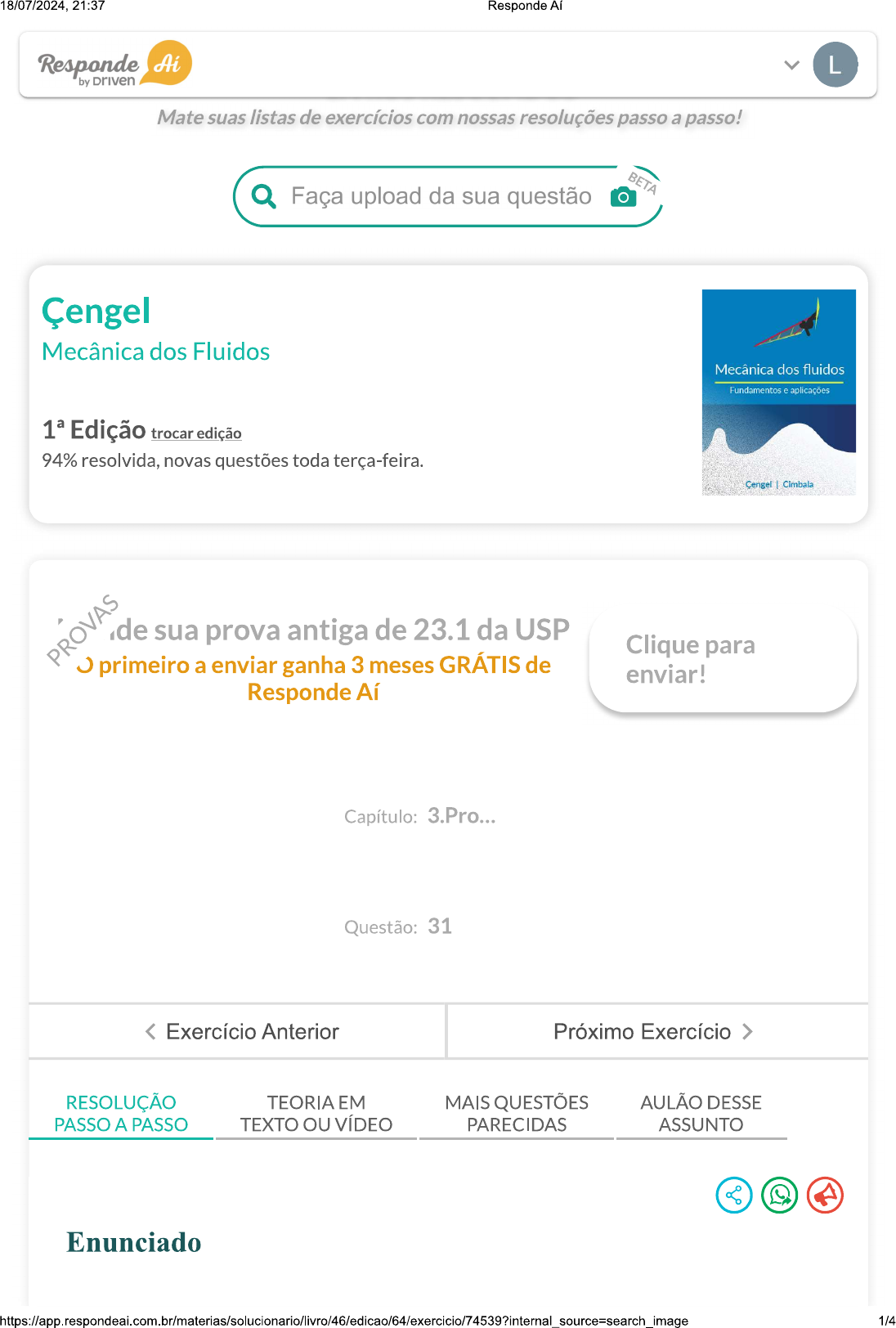 <p>18/07/2024, 21:37 Responde Aí Responde Ai L by Mate suas listas de exercícios com nossas resoluções passo a passo! BETA Faça upload da sua questão Çengel Mecânica dos Fluidos Mecânica dos fluidos Fundamentos e aplicações Edição trocar edição 94% resolvida, novas questões toda terça-feira. Cengel Cimbala de sua prova antiga de 23.1 da USP Clique para primeiro a enviar ganha 3 meses GRÁTIS de enviar! Responde Aí Capítulo: 3.Pro... Questão: 31 < Exercício Anterior Próximo Exercício > RESOLUÇÃO TEORIA EM MAIS QUESTÕES AULÃO DESSE PASSO A PASSO TEXTO VÍDEO PARECIDAS ASSUNTO Enunciado 1/4</p><p>18/07/2024. 21:37 Responde Aí Responde Ai L by Determine a airerença de pressao entre as auas a agua do mar no local como p = 1035 A coluna de ar pode ser ignorada na análise? Ar Água 40 cm doce 70 cm Água do mar 60 cm 10 cm Mercúrio Passo 1 Eu juro pra você que esse exercício só assusta de início, mas a ideia é a usarmos a nossa velha e ótima Vamos começar da água doce e seguir a tubulação até a água salgada, beleza? A gente vai somando as pressões hidrostática conforme vamos DESCENDO na tubulação e subtraindo quando SUBIRMOS na tubulação, isso é MUITO IMPORTANTE!!! Passo 2 P1 + - PHgghHg Parghar + Pmarghmar = P2 Rearranjando nossa equação: - + PHgghHg + Parghar - Pmarghmar - - Vamos precisar adicionar um fator de conversão de unidades aqui para que tenhamos nossa resposta final em kPa, pois nossa unidade final na equação acima será 2/4</p><p>18/07/2024, 21:37 Responde Aí Responde Ai L by - - (0,001) P1 - P2 = (9,81[(13600)(0,1) - (1000)(0,6) - (1035)(0,4)](0,001) Note que eu retirei a densidade do meio dessa conta toda a contribuição do ar, veja o porquê: = 0,0082 kPa Olha como essa pressão é tão pequena quando comparada a contribuição dos outros fluidos que ela poderá ser desprezada, sacou!? Resposta A diferença de pressão são 3,4 kPa E aí, esse passo a passo te ajudou? 00 Passou longe! Meh! Demais! Ficou com alguma dúvida? 3/4</p><p>18/07/2024, 21:37 Responde Aí Responde Ai L by Driven This site is protected by reCAPTCHA and the GooglePrivacy Policy and Terms of Service apply. POLÍTICAS DE PRIVACIDADE TERMOS DE USO PLANOS PROCON RJ 4/4</p>