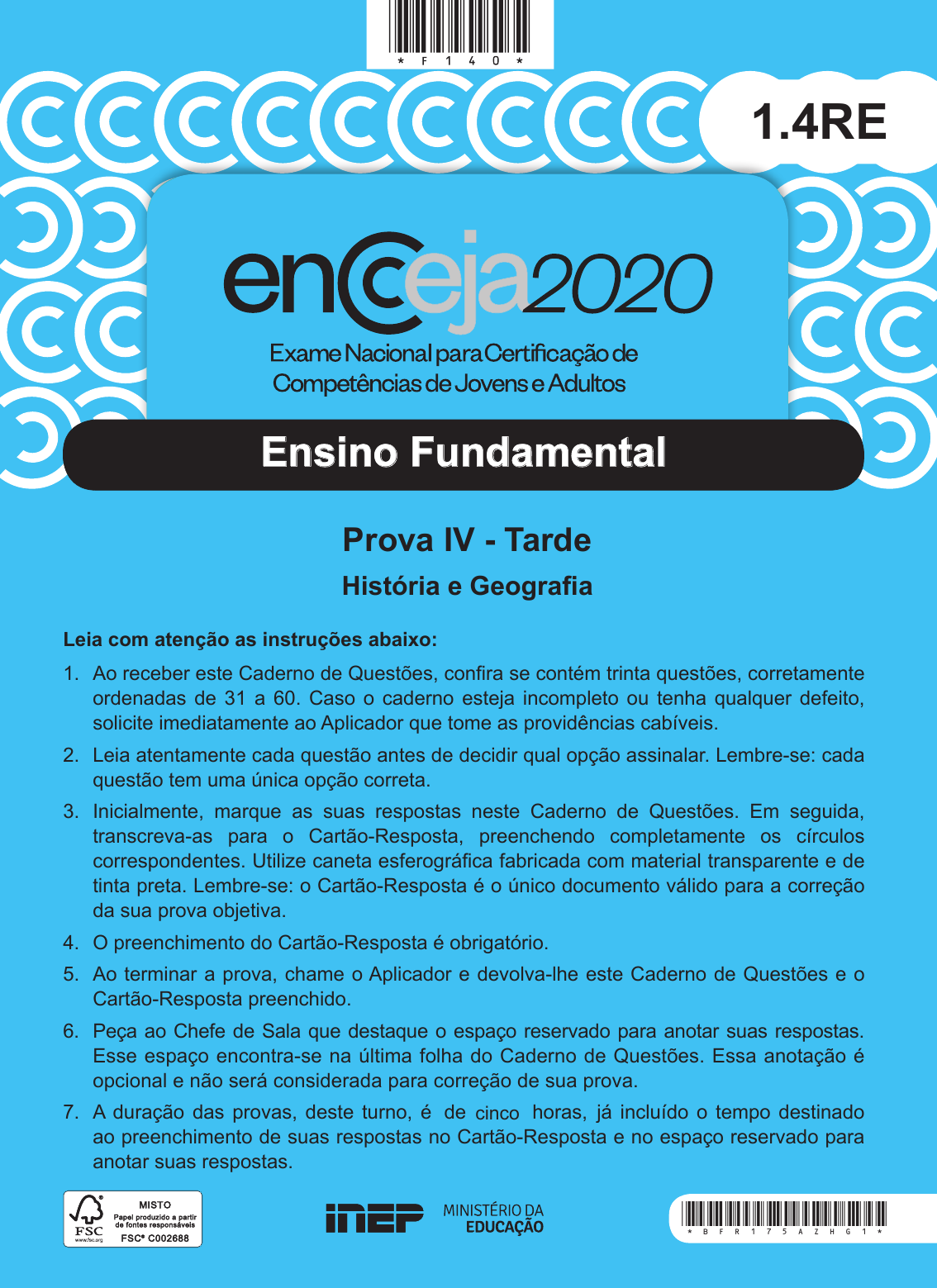 <p>1</p><p>Prova IV - Tarde</p><p>História e Geografia</p><p>Leia com atenção as instruções abaixo:</p><p>1. Ao receber este Caderno de Questões, confira se contém trinta questões, corretamente</p><p>ordenadas de 31 a 60. Caso o caderno esteja incompleto ou tenha qualquer defeito,</p><p>solicite imediatamente ao Aplicador que tome as providências cabíveis.</p><p>2. Leia atentamente cada questão antes de decidir qual opção assinalar. Lembre-se: cada</p><p>questão tem uma única opção correta.</p><p>3. Inicialmente, marque as suas respostas neste Caderno de Questões. Em seguida,</p><p>transcreva-as para o Cartão-Resposta, preenchendo completamente os círculos</p><p>correspondentes. Utilize caneta esferográfica fabricada com material transparente e de</p><p>tinta preta. Lembre-se: o Cartão-Resposta é o único documento válido para a correção</p><p>da sua prova objetiva.</p><p>4. O preenchimento do Cartão-Resposta é obrigatório.</p><p>5. Ao terminar a prova, chame o Aplicador e devolva-lhe este Caderno de Questões e o</p><p>Cartão-Resposta preenchido.</p><p>6. Peça ao Chefe de Sala que destaque o espaço reservado para anotar suas respostas.</p><p>Esse espaço encontra-se na última folha do Caderno de Questões. Essa anotação é</p><p>opcional e não será considerada para correção de sua prova.</p><p>7. A duração das provas, deste turno, é de horas, já incluído o tempo destinado</p><p>ao preenchimento de suas respostas no Cartão-Resposta e no espaço reservado para</p><p>anotar suas respostas.</p><p>Ensino Fundamental</p><p>1.4RE</p><p>*BFR175AZHG1*</p><p>cinco</p><p>História e Geografia - ENCCEJA 20202</p><p>QUESTÃO 31</p><p>N</p><p>0 500 km</p><p>©HT/NAMT 2018 Fonte: Antaq. 2016.</p><p>Trechos navegáveis</p><p>THÉRY, H.; MELLO, N. A. Atlas do Brasil: disparidades e dinâmicas do território. São Paulo: Edusp, 2018 (adaptado).</p><p>De acordo com o mapa, a maior quantidade de trechos navegáveis do Brasil encontra-se na Região</p><p>A Norte.</p><p>B Sudeste.</p><p>C Nordeste.</p><p>D Centro-Oeste.</p><p>*BFR175AZHG2*</p><p>História e Geografia - ENCCEJA 2020 3</p><p>QUESTÃO 32</p><p>Vista parcial do Palacete Matarazzo, na Avenida Paulista, em janeiro de 1996, em fase de demolição.</p><p>Disponível em: http://g1.globo.com. Acesso em: 7 set. 2019 (adaptado).</p><p>A demolição ilustrada na imagem indica uma desvalorização do patrimônio cultural motivada pela</p><p>A ampliação do transporte coletivo.</p><p>B diminuição do fluxo populacional.</p><p>C manutenção da paisagem urbana.</p><p>D expansão da especulação imobiliária.</p><p>*BFR175AZHG3*</p><p>História e Geografia - ENCCEJA 20204</p><p>QUESTÃO 33</p><p>Nos anos 1930, Stalin tentava uma aliança</p><p>com as potências ocidentais, como forma</p><p>de proteger a União Soviética da Alemanha</p><p>nazista. Sem sucesso, o líder comunista</p><p>inverteu a lógica e, com o mesmo objetivo,</p><p>aproximou-se de Hitler, o que culminou no</p><p>pacto de não agressão entre os dois países.</p><p>PILAGALLO, O. Revista História Viva,</p><p>n. 29, mar. 2006 (adaptado).</p><p>Uma semelhança política entre essas duas</p><p>potências estava baseada n a(o )</p><p>A liberdade de expressão.</p><p>B liberalismo econômico.</p><p>C personalismo das lideranças.</p><p>D representatividade do parlamento.</p><p>QUESTÃO 34</p><p>TEXTO I</p><p>Para os que chegavam, o mundo em que</p><p>entravam era a arena dos seus ganhos, em ouro</p><p>e glórias. Para os índios que ali estavam, nus na</p><p>praia, o mundo era um luxo de se viver. Este foi</p><p>o efeito do encontro fatal que ali se dava.</p><p>RIBEIRO, D. O povo brasileiro: a formação e o sentido do</p><p>Brasil. São Paulo: Cia. das Letras, 1995 (adaptado).</p><p>TEXTO II</p><p>As práticas, os costumes, os hábitos, os</p><p>valores e os conhecimentos tradicionais foram</p><p>sendo aos poucos substituídos no imaginário</p><p>coletivo por costumes, valores e conhecimentos</p><p>dos brancos, na medida em que o novo ideal</p><p>de vida dos índios passa a ser o modo de vida</p><p>dos brancos.</p><p>LUCIANO, G. S. O índio brasileiro: o que você precisa saber</p><p>sobre os povos indígenas no Brasil de hoje. Brasília:</p><p>MEC/Secad; Laced/Museu Nacional, 2006 (adaptado).</p><p>Os textos relatam os efeitos do processo de</p><p>ocupação territorial brasileira, cujo reflexo foi o(a)</p><p>A enfraquecimento da cultura nativa.</p><p>B manutenção da agricultura sustentável.</p><p>C valorização das populações tradicionais.</p><p>D fortalecimento das organizações econômicas.</p><p>*BFR175AZHG4*</p><p>História e Geografia - ENCCEJA 2020 5</p><p>QUESTÃO 35</p><p>Minha fé</p><p>Eu tenho um santo</p><p>Padroeiro, poderoso</p><p>Que é meu Pai Ogum</p><p>Eu tenho</p><p>Tenho outro santo</p><p>Que me ampara na descida</p><p>Que é meu Pai Xangô</p><p>Caô</p><p>E quem me ajuda</p><p>No meu caminhar nessa vida</p><p>Pra ir na corrida do ouro</p><p>É Oxum, é Oxum</p><p>ZECA PAGODINHO. Zeca Pagodinho ao vivo.</p><p>São Paulo: Universal Music, 1999 (fragmento).</p><p>Qual característica das religiões afro-brasileiras</p><p>está exemplificada na letra da canção?</p><p>A Uso de amuletos da sorte.</p><p>B Oferenda de alimentos sagrados.</p><p>C Crença na existência de deuses.</p><p>D Celebração com animais sacrificados.</p><p>QUESTÃO 36</p><p>Economia canavieira</p><p>CALIXTO, B. Moagem da cana na Fazenda Cachoeira.</p><p>Disponível em: www.zun.com.br. Acesso em: 7 ago. 2013.</p><p>O objetivo da Coroa Portuguesa ao incentivar</p><p>o tipo de atividade retratada na imagem foi</p><p>A promover a rotação de culturas nas capitanias.</p><p>B manter o abastecimento do consumo interno.</p><p>C estimular a ocupação territorial do interior.</p><p>D explorar o potencial lucrativo da colônia.</p><p>*BFR175AZHG5*</p><p>História e Geografia - ENCCEJA 20206</p><p>QUESTÃO 37</p><p>Minha Itália, Alemanha</p><p>Minha Espanh