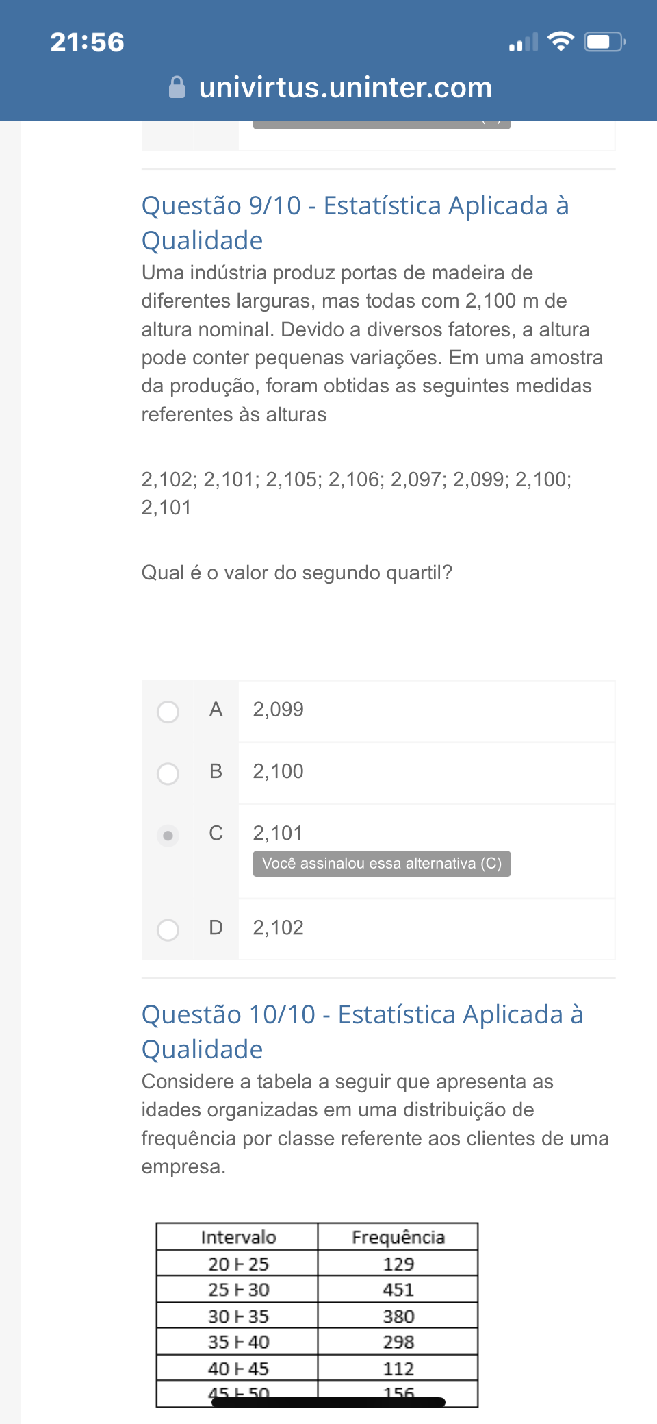 <p>21:56 univirtus.uninter.com Questão 9/10 - Estatística Aplicada à Qualidade Uma indústria produz portas de madeira de diferentes larguras, mas todas com 2,100 m de altura nominal. Devido a diversos fatores, a altura pode conter pequenas variações. Em uma amostra da produção, foram obtidas as seguintes medidas referentes às alturas 2,102; 2,101; 2,105; 2,106; 2,097; 2,099; 2,100; 2,101 Qual é o valor do segundo quartil? A 2,099 B 2,100 C 2,101 Você assinalou essa alternativa (C) D 2,102 Questão 10/10 - Estatística Aplicada à Qualidade Considere a tabela a seguir que apresenta as idades organizadas em uma distribuição de frequência por classe referente aos clientes de uma empresa. Intervalo Frequência 20 H 25 129 25 H 30 451 30 H 35 380 35 H 40 298 40 H 45 112 45 L 50 156</p>
