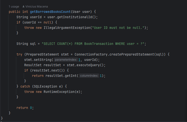 <p>1 usage Vinicius Macena public int getBorrowedBooksCount(User user) { String userId = if (userId == { throw new ID must not be null."); } String sql = "SELECT COUNT(*) FROM BookTransaction WHERE user try (PreparedStatement stmt = { stmt. setString parameterIndex: 1, ResultSet resultSet = if (resultSet.next()) { return resultSet.getInt( columnIndex: 1) } } catch (SQLException e) { throw new RuntimeException(e) ; return</p>