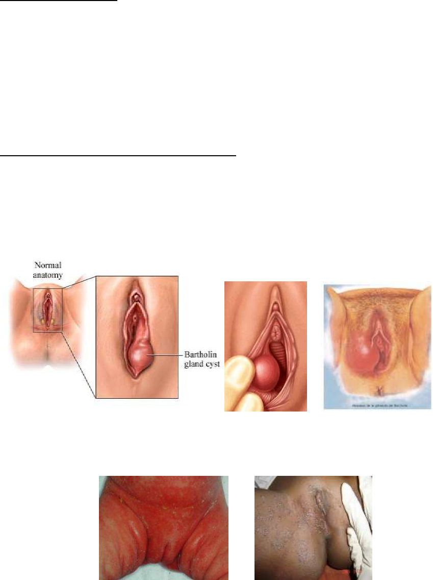 <p>Textos de Apoio Módulo 8</p><p>Curso de Enfermagem de SMI</p><p>DOENÇAS GINECOLÓGICAS MAIS FREQÜENTES</p><p>A. AFECÇÕES VULVO VAGINAIS</p><p>AS VULVOVAGINITES: se revestem de importância por determinarem quadro clínico</p><p>desconfortável, por serem transmitidas sexualmente e por facilitarem a infecção pelo</p><p>vírus da HIV/SIDA. Estas apresentam uma elevada taxa de recorrência, constituindo</p><p>problema para a mulher infelizmente a maioria das afetadas são as mulheres mais</p><p>pobres, que não têm acesso a os serviços de saúde.</p><p>Podem ser causadas por:</p><p> Bactérias (vaginose bacteriana)</p><p> Fungos (vulvovaginite fúngica),</p><p> Protozoários (vulvovaginite por trichomonas)</p><p> Associações de microrganismos (vulvovaginites mistas).</p><p>TUMORES BENIGNOS DA VULVA E VAGINA:</p><p>1. BARTHOLINITE; As glândulas de Bortolin estão localizadas em cada lado da</p><p>abertura vaginal, secretam fluido que ajuda a lubrificar a vagina. Às vezes as</p><p>aberturas destas glândulas ficam obstruídas, fazendo com que o líquido volte para</p><p>dentro da glândula. O resultado é relativamente indolor chamado de cisto de</p><p>Bortolin. Às vezes, o líquido dentro do cisto pode ser infectado, resultando em pus</p><p>rodeado por tecido inflamado (abscesso).</p><p>2. DISTROFIAS BULBARES: São nomeadas Transtornos Epiteliais mais não são</p><p>neoplásicos caracterizam se por ser brancas, por produzir comichão e por</p><p>evolucionar em forma crônica. Forman parte das dermatite vulvares.</p><p>3. CONDILOMAS ACUMINADOS: ou verrugas genitais, verrugas venéreas,</p><p>verrugas-figo. É apenas a manifestação mais óbvia das infecções por HPV na</p><p>Textos de Apoio Módulo 8</p><p>Curso de Enfermagem de SMI</p><p>região ano genital, são conhecidas há muito tempo, mas até recentemente eram</p><p>consideradas triviais e a transmissão sexual era até questionada por alguns.</p><p>4. FIBROMA DE VULVA: São tumores de origem mesodérmica. Inicia-se por</p><p>pequeno nódulo, arredondado ou ovóide, às vezes ligeiramente lobulado, de</p><p>consistência firme, que desliza sob o tegumento cutâneo que reveste. É o tumor</p><p>mais comum dentre os tumores benignos da vulva.</p><p>5. ULCERAS VULVO – VAGINAIS: As úlceras o lesões nos genitais femininos pelo</p><p>geral, são causadas por infecções de transmissão sexual (ITS). As ITS que podem</p><p>causar estas úlceras são:</p><p> Cancroide</p><p> Herpes genital</p><p> Granuloma inguinal</p><p> Molusco contagioso</p><p> Sífilis</p><p> Verrugas venéreas</p><p>As úlceras genitais podem ser dolorosas, coceira, produzir uma descarga ou</p><p>não causam nenhum sintoma. Causa lesões genitais ou feridas podem ter um</p><p>efeito negativo na auto-imagem, o que faz que muitas pessoas não procuram</p><p>Textos de Apoio Módulo 8</p><p>Curso de Enfermagem de SMI</p><p>atendimento médico apropriado. Todas as feridas genitais devem ser avaliadas</p><p>por um profissional de saúde. Muitas vezes, acontece o prurido, micção</p><p>dolorosa ou relações sexuais dolorosas são apresentados com lesões genitais.</p><p>6. DESGARROS E LACERAÇÕES DA VULVA E VAGINA: Quando o tecido da</p><p>vulva ou a vagina são abrangidos por una ma técnica de atenção do parto ou</p><p>manobras abortivas se produz esta entidade</p><p>7. POLIPOS: São tumores ou lesões muito comuns e benignos, é considerado mais</p><p>como alterações reativas e inflamação. Consistem na proliferação da mucosa</p><p>endocervical e desenvolvimento de um centro ou eixo formado por tecido</p><p>conjuntivo, incluindo as estruturas vasculares, geralmente, mais desenvolvidos do</p><p>que os do colo do útero, crescem formando um prolapso que pode sair através do</p><p>orifício cervical externo. As alterações inflamatórias são comuns, tais como</p><p>ulcerações e metaplasia escamosa do epitélio de superfície. Muito raramente se</p><p>senta sobre o epitélio uma lesão intra-epitelial ou carcinoma.</p><p>TUMORES MALIGNOS DA VULVA E VAGINA</p><p>SARCOMAS: ou Cancro da vulva, o</p><p>mais agressivo de todos é o “Sarcoma</p><p>Botroide da vagina” é um tipo raro de</p><p>cancro que ocorre principalmente na</p><p>infância e especialmente na primeira</p><p>infância entre os cinco primeiros anhos</p><p>de vida da menina. Pode aparecer uma</p><p>massa como um cacho de uvas, que</p><p>pode ser edematosa de cor cinzento ou</p><p>vermelho, que sai da vagina, pode não</p><p>apresentar desconforto. Depois,</p><p>aparecer pequenas hemorragias,</p><p>corrimento purulento, retenção urinária</p><p>de causa desconhecida.</p><p>Textos de Apoio Módulo 8</p><p>Curso de Enfermagem de SMI</p><p>B. AFECÇÕES DO COLO UTERINO</p><p>Podem ser feridas, erosão ou ectrópio no colo do útero que podem ter origem</p><p>congênita, hormonal ou serem provocadas por infecções.</p><p>BENIGNAS:</p><p>1. Cervicite: é uma irritação do colo do útero provocada por uma variedade de</p><p>organismos diferentes. As causas comuns são pelo geral doença de transmissão</p><p>sexual como a gonorreia, herpes, clamídia e infecções bacterianas. Podem existir</p><p>também cervicites crônicas comuns nas mulheres depois do parto. É associada</p><p>também freqüentemente com a gravidez e o uso de contraceptivos orais. Em</p><p>poucas ocasiões, a cervicite é causada por sensibilidades a determinados</p><p>produtos químicos, como os espermicidas, os preservativos de látex e mais</p><p>comumente por os tampões vaginais</p><p>2. Pólipo: São crescimentos pequenos e frágeis em forma de dedo que se originam</p><p>na superfície do colo uterino o do canal intracervical, os quais estão a pendurar e</p><p>sair a través do orifício cervical. A causa dos e pólipos no colo do útero ainda não</p><p>está completamente compreendida, podem ser associados com inflamação</p><p>crônica, uma resposta anormal aos níveis de estrogênio ou um bloqueio 