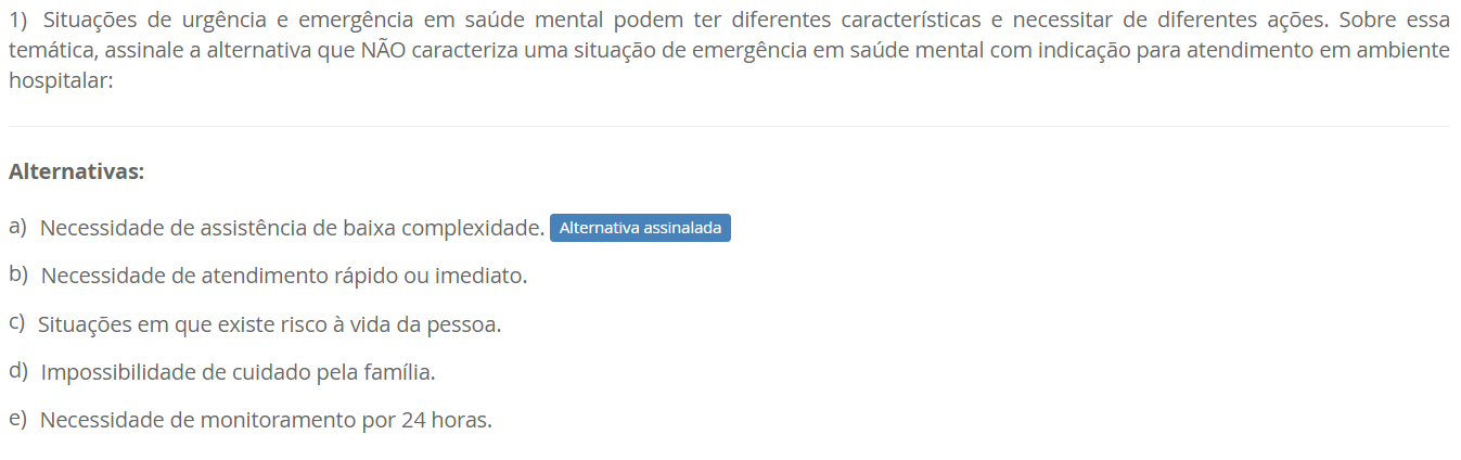 <p>1) Situações de urgência e emergência em saúde mental podem ter diferentes características e necessitar de diferentes ações. Sobre essa temática, assinale a alternativa que NÃO caracteriza uma situação de emergência em saúde mental com indicação para atendimento em ambiente hospitalar: Alternativas: a) Necessidade de assistência de baixa complexidade. Alternativa assinalada b) Necessidade de atendimento rápido ou imediato. c) Situações em que existe risco à vida da pessoa. d) Impossibilidade de cuidado pela família. e) Necessidade de monitoramento por 24 horas.</p>