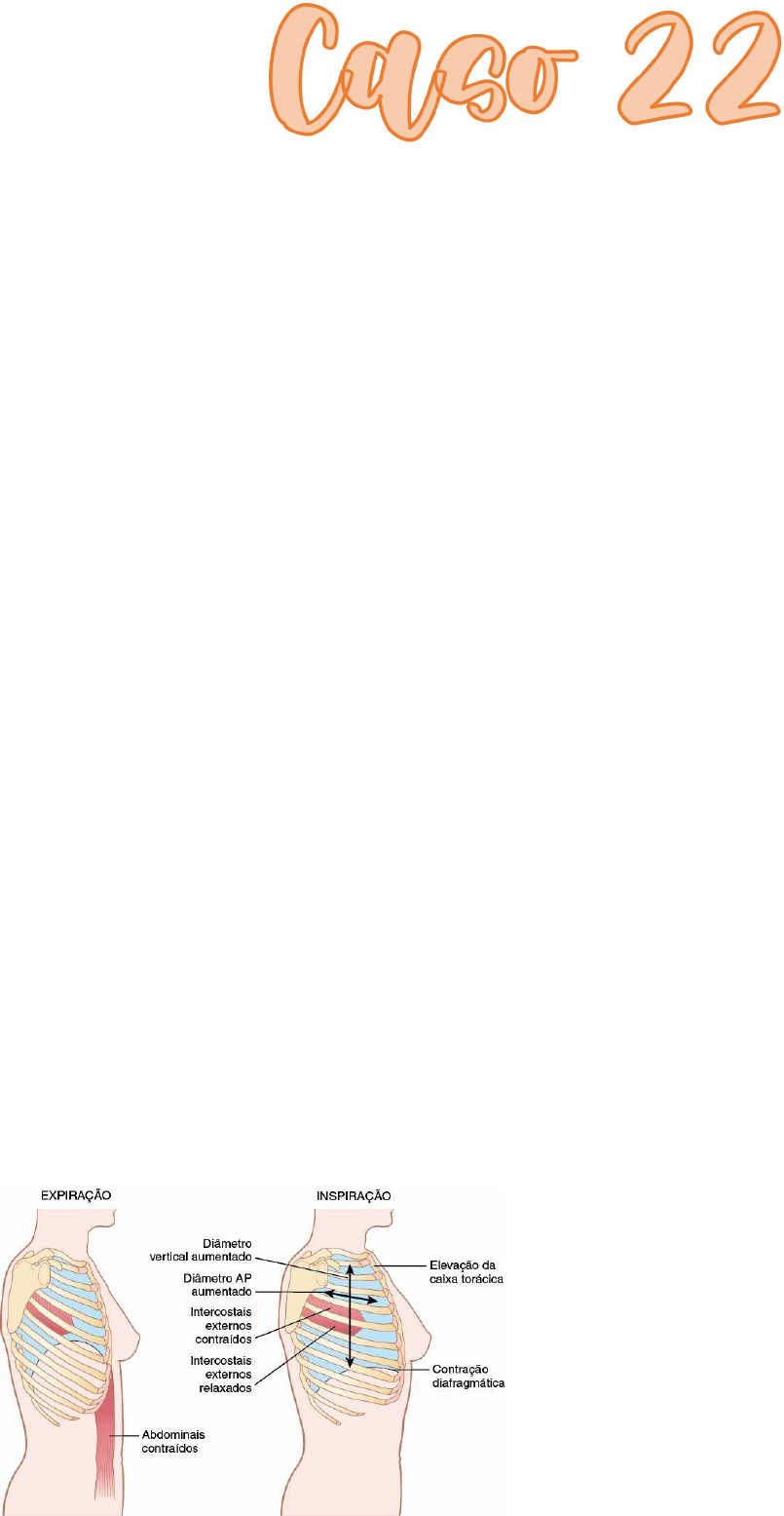 <p>1- ELUCIDAR A FISIOLOGIA MECÂNICA</p><p>DA RESPIRAÇÃO.</p><p>♥ As funções principais da respiração são prover</p><p>oxigênio aos tecidos e remover o dióxido de</p><p>carbono e pode ser dividida em quatro</p><p>componentes principais:</p><p>(1) ventilação pulmonar, que significa o influxo e o</p><p>efluxo de ar entre a atmosfera e os alvéolos</p><p>pulmonares;</p><p>(2) difusão de oxigênio (O2) e dióxido de carbono</p><p>(CO2) entre os alvéolos e o sangue;</p><p>(3) transporte de oxigênio e dióxido de carbono no</p><p>sangue e nos líquidos corporais e suas trocas com as</p><p>células de todos os tecidos do corpo;</p><p>(4) Regulação da ventilação e outros aspectos da</p><p>respiração.</p><p>MÚSCULOS QUE PRODUZEM A EXPANSÃO E</p><p>A CONTRAÇÃO PULMONARES</p><p>♥ Os pulmões podem ser expandidos e contraídos</p><p>por duas maneiras:</p><p>(1) por movimentos de subida e descida do diafragma</p><p>para aumentar ou diminuir a cavidade torácica;</p><p>(2) por elevação e depressão das costelas para elevar</p><p>e reduzir o diâmetro anteroposterior da cavidade</p><p>torácica.</p><p>Contração e expansão da caixa torácica durante a expiração e a</p><p>inspiração, mostrando a contração diafragmática, a função dos</p><p>músculos intercostais e a elevação e a depressão da caixa</p><p>torácica. AP, anteroposterior.</p><p>♥ A respiração tranquila e normal é realizada quase</p><p>inteiramente pelos movimentos do diafragma.</p><p>♥ Durante a inspiração, a contração diafragmática</p><p>puxa as superfícies inferiores dos pulmões para</p><p>baixo.</p><p>♥ Na expiração, o diafragma simplesmente relaxa, e</p><p>a retração elástica dos pulmões, da parede</p><p>torácica e das estruturas abdominais comprime os</p><p>pulmões e expele o ar.</p><p>♥ Durante a respiração vigorosa, as forças elásticas</p><p>não são poderosas o suficiente para produzir a</p><p>rápida expiração necessária; força extra é obtida,</p><p>principalmente, pela contração da musculatura</p><p>abdominal, que empurra o conteúdo abdominal</p><p>para cima, contra a parte inferior do diafragma,</p><p>comprimindo, os pulmões.</p><p>♥ O segundo método para expansão dos pulmões é</p><p>elevar a caixa torácica.</p><p>♥ Ao ser elevada expandem-se os pulmões porque,</p><p>na posição de repouso natural, as costelas se</p><p>inclinam para baixo, possibilitando, dessa forma,</p><p>que o esterno recue em direção à coluna</p><p>vertebral.</p><p>♥ Quando a caixa torácica é elevada, as costelas se</p><p>projetam quase diretamente para frente, fazendo</p><p>com que o esterno também se mova</p><p>anteriormente para longe da coluna, aumentando</p><p>o diâmetro anteroposterior do tórax por cerca de</p><p>20% durante a inspiração máxima, em</p><p>comparação à expiração.</p><p>♥ Portanto, todos os músculos que elevam a caixa</p><p>torácica são classificados como músculos da</p><p>inspiração, e os que deprimem a caixa torácica</p><p>são classificados como músculos da expiração.</p><p>♥ Os músculos mais importantes que elevam a caixa</p><p>torácica, inspiração, são os intercostais externos,</p><p>mas outros que auxiliam são</p><p>(1) músculos esternocleidomastóideos, que elevam o</p><p>esterno;</p><p>(2) serráteis anteriores, que elevam muitas costelas;</p><p>(3) escalenos, que elevam as duas primeiras costelas.</p><p>♥ Os músculos que puxam a caixa torácica para</p><p>baixo, durante a expiração, são principalmente o (1)</p><p>reto abdominal, que exerce o efeito poderoso de</p><p>puxar para baixo as costelas inferiores, ao mesmo</p><p>tempo em que, em conjunto com outros</p><p>músculos abdominais, também comprime o</p><p>conteúdo abdominal para cima contra o diafragma;</p><p>e (2) os intercostais internos.</p><p>♥ Na figura mostrada, fica evidente o mecanismo</p><p>pelo qual os intercostais externos e internos agem</p><p>produzindo a inspiração e a expiração.</p><p>♥ Do lado esquerdo, as costelas durante a expiração</p><p>estão anguladas para baixo, e os intercostais</p><p>externos estão alongados anterior e inferiormente.</p><p>♥ Conforme eles se contraem, puxam as costelas</p><p>superiores para frente com relação às inferiores,</p><p>o que causa mecanismo de alavanca nas costelas,</p><p>para levantá-las, produzindo inspiração.</p><p>♥ Os intercostais internos funcionam exatamente de</p><p>modo oposto, atuando como músculos</p><p>expiratórios, porque se angulam entre as costelas,</p><p>na direção contrária, e produzem a alavanca</p><p>oposta.</p><p>PRESSÕES QUE CAUSAM O MOVIMENTO DO AR</p><p>PARA DENTRO E PARA FORA DOS PULMÕES</p><p>♥ Os pulmões são estruturas elásticas que colapsam,</p><p>como um balão, e expelem todo o ar pela</p><p>traqueia, toda vez que não existe força para</p><p>mantê-lo inflado.</p><p>♥ Também não existem conexões entre os</p><p>pulmões e as paredes da caixa torácica, exceto</p><p>onde ele está suspenso no hilo a partir do</p><p>mediastino, região situada no meio da caixa</p><p>torácica.</p><p>♥ O pulmão “flutua” na cavidade torácica, cercado</p><p>por fina camada de líquido pleural que lubrifica o</p><p>movimento dos pulmões dentro da cavidade.</p><p>♥ A sucção contínua do excesso de líquido para os</p><p>canais linfáticos mantém leve tração entre a</p><p>superfície visceral da pleura pulmonar e a</p><p>superfície parietal da pleura da cavidade torácica.</p><p>♥ Os pulmões são presos à parede torácica, como</p><p>se estivessem colados, e estão bem lubrificados,</p><p>podendo deslizar livremente quando o tórax se</p><p>expande e contrai.</p><p>PRESSÃO PLEURAL E SUAS VARIAÇÕES</p><p>DURANTE A RESPIRAÇÃO.</p><p>♥ Pressão pleural é a pressão do líquido no estreito</p><p>espaço entre a pleura visceral e a pleura parietal.</p><p>♥ Essa pressão é normalmente uma sucção ligeira,</p><p>o que 
