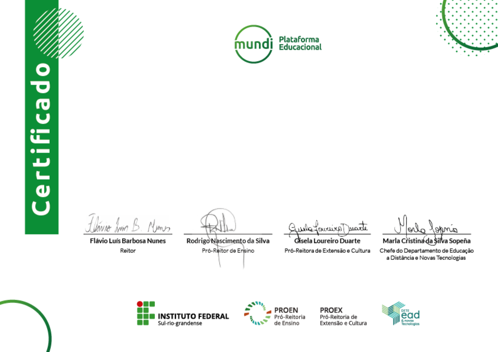 <p>O Departamento de Educação a Distância e Novas Tecnologias da Pró-reitoria de</p><p>Ensino do Instituto Federal de Educação, Ciência e Tecnologia Sul-rio-grandense</p><p>certifica que Gabriel Sciamarelli, nascido(a) em 23 de maio de 2002,</p><p>CPF 51534877843, concluiu o curso Editor de Texto, com carga horária de 40 horas.</p><p>Pelotas, 16 de agosto de 2024.</p><p>Nome: Gabriel Sciamarelli Documento: 51534877843 Data de Nascimento: 23 de maio de 2002</p><p>Curso: Editor de Texto Data Início: quinta, 27 jun 2024,</p><p>12:44</p><p>Data Término: 16 de agosto de 2024</p><p>66870124-9898-4be8-97cb-45690a00c840</p><p>Powered by TCPDF (www.tcpdf.org)</p><p>http://www.tcpdf.org</p>
