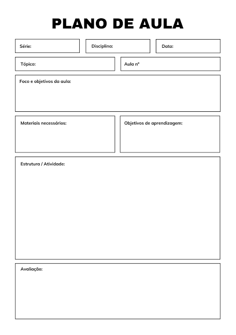 <p>PLANO DE AULA Série: Disciplina: Data: Aulo n° Foco e objetivos do Materiais Objetivos de aprendizagem: Estrutura / Atividade: Avaliação:</p>