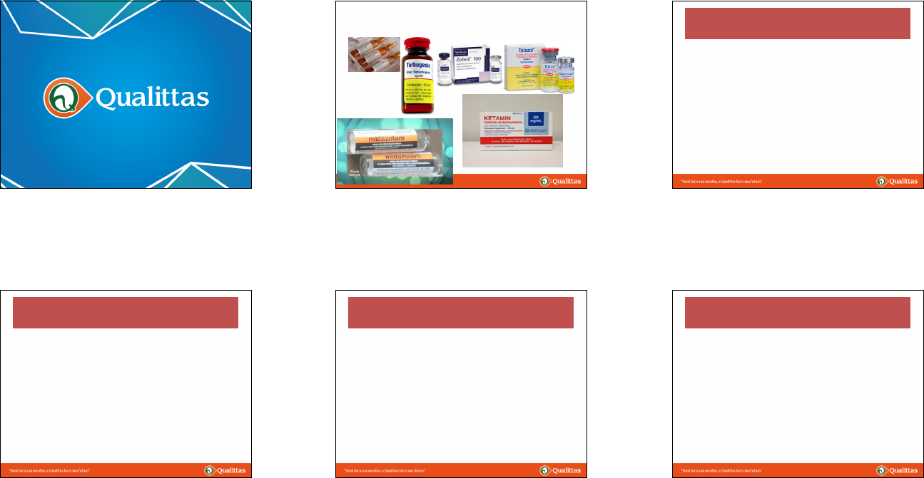 <p>ANESTESIA DISSOCIATIVA ANESTESIA DISSOCIATIVA</p><p>• Indicações:</p><p>1. Procedimentos até 40 minutos</p><p>2. Associar técnicas de bloqueio local</p><p>3. Evitar ruídos no ambiente durante a</p><p>anestesia</p><p>4. Somente para pacientes hígidos</p><p>5. Não utilizar em procedimentos muito</p><p>cruentos</p><p>ANESTESIA DISSOCIATIVA</p><p>CÃES</p><p>• Associados por via intramuscular</p><p>• Cetamina 10 mg/kg +</p><p>• Midazolam 0,3 mg/kg</p><p>• Xilazina 0,2 mg/kg</p><p>• Tramadol ou butorfanol ou morfina</p><p>• Avaliar a necessidade de complementar</p><p>analgesia com opióides, técnicas locais, infusão</p><p>contínua analgésica</p><p>• + cetamina 2 mg/kg EV quando necessário</p><p>ANESTESIA DISSOCIATIVA</p><p>CÃES</p><p>• MPA: dexmedetomidina 125 µg/m2 +</p><p>morfina 0,2 mg/kg + midazolan 0,3 mg/kg</p><p>• Após 20 minutos: cetamina 5 mg/kg por via</p><p>endovenosa</p><p>• Avaliar a necessidade de complementar analgesia</p><p>com opióides, técnicas locais, infusão contínua</p><p>analgésica</p><p>ANESTESIA DISSOCIATIVA</p><p>CÃES</p><p>• MPA: dexmedetomidina 125 µg/m2 +</p><p>morfina 0,2 mg/kg</p><p>• Após 20 minutos: tiletamina / zolazepam: 3 mg/kg</p><p>endovenoso</p><p>• Avaliar a necessidade de complementar analgesia</p><p>com opióides, técnicas locais, infusão contínua</p><p>analgésica</p><p>ANESTESIA DISSOCIATIVA</p><p>FELINOS</p><p>• Associados por via intramuscular</p><p>• Cetamina 10 mg/kg +</p><p>• Midazolam 0,2 mg/kg</p><p>• Xilazina 0,3 mg/kg</p><p>• Tramadol ou butorfanol ou morfina</p><p>• Avaliar a necessidade de complementar</p><p>analgesia com opióides, técnicas locais, infusão</p><p>contínua analgésica</p><p>• + cetamina 2 mg/kg EV quando necessário</p><p>ANESTESIA DISSOCIATIVA</p><p>FELINOS</p><p>• MPA: dexmedetomidina 10 µg/kg + morfina</p><p>0,2 mg/kg + midazolan 0,3 mg/kg</p><p>• Após 20 minutos: cetamina 5 mg/kg por via</p><p>endovenosa</p><p>• Avaliar a necessidade de complementar analgesia</p><p>com opióides, técnicas locais, infusão contínua</p><p>analgésica</p><p>ANESTESIA DISSOCIATIVA</p><p>FELINOS</p><p>• MPA: dexmedetomidina 10 µg/kg + morfina</p><p>0,2 mg/kg</p><p>• Após 20 minutos: tiletamina / zolazepam: 3 mg/kg</p><p>endovenoso</p><p>• Avaliar a necessidade de complementar analgesia</p><p>com opióides, técnicas locais, infusão contínua</p><p>analgésica</p><p>TTDEX</p><p>1 FRASCO DE TELAZOL</p><p>OU ZOLETIL 100</p><p>(Não usar o diluente)</p><p>2,5 ml de</p><p>dexmedetomidina</p><p>2,5 ml de butorfanol</p><p>+</p><p>TTDEX</p><p>• Sedação leve: 0,005 ml/kg</p><p>• Sedação moderada: 0,01 ml/kg</p><p>• Sedação profunda: 0,02 ml/kg</p><p>• Anestesia: 0,03 ml/kg</p><p>• Anestesia profunda: 0,04 ml/kg</p><p>TTDEX/10</p><p>Retirar 0,5 ml do</p><p>diluente de descartar</p><p>0,5 ml de TTDEX</p><p>+</p><p>TTDEX/10</p><p>• Sedação leve: 0,05 ml/kg</p><p>• Sedação moderada: 0,1 ml/kg</p><p>• Sedação profunda: 0,2 ml/kg</p><p>• Anestesia: 0,3 ml/kg</p><p>• Anestesia profunda: 0,4 ml/kg</p>