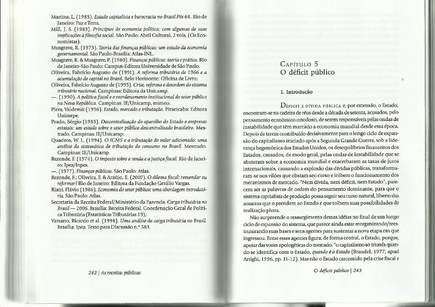 <p>Martins, L. (1985). Estado capitalista e burocracia no Brasil Pós 64. Rio de Janeiro: Paz e Terra. Mill, J. S. (1983). Princípios de economia política; com algumas de suas implicações à filosofia social. São Paulo: Abril Cultural, 2 vols. (Os Eco- nomistas). Musgrave, R. (1973). Teoria das finanças públicas: um estudo da economia governamental. São Paulo-Brasília: Atlas-INL. Musgrave, R. & Musgrave, P. (1980). Finanças públicas: teoria e prática. Rio de Janeiro-São Paulo: Campus-Editora Universidade de São Paulo. CAPÍTULO 5 Oliveira, Fabrício Augusto de (1991). A reforma tributária de 1966 e a O déficit público acumulação de capital no Brasil. Belo Horizonte: Oficina de Livro; 2 Oliveira, Fabrício Augusto de (1995). Crise, reforma e desordem do sistema tributário nacional. Campinas: Editora da Unicamp. 1. Introdução (1990). A política fiscal e reordenamento institucional do setor público na Nova República. Campinas: IE/Unicamp, mimeo. DÉFICIT E DÍVIDA PÚBLICA e, por extensão, o Estado, Pires, Valdemir (1996). Estado, mercado e tributação. Piracicaba: Editora na cadeira de réus desde a década de setenta, acusados, pelo Unimepe. Prado, Sérgio (1985). Descentralização do aparelho do Estado e empresas pensamento econômico ortodoxo, de serem responsáveis pelas ondas de estatais: um estudo sobre setor público descentralizado Mes- instabilidade que têm marcado a economia mundial desde essa época. trado. Campinas: IE/Unicamp. Depois de terem contribuído decisivamente para o longo ciclo de expan- Quadros, W. (1994). ICMS e a tributação do valor adicionado: uma são do capitalismo iniciado após a Segunda Grande Guerra, sob a lide- análise da sistemática de tributação do consumo no Brasil. Mestrado. rança hegemônica dos Estados Unidos, os desequilíbrios financeiros dos Campinas: IE/Unicamp. Estados, causados, de modo geral, pelas ondas de instabilidade que se Rezende, F. (1974). imposto sobre a renda e a justiça fiscal. Rio de Janei- abateram sobre a economia mundial e exacerbaram as taxas de juros ro: Ipea/Inpes. (1977). Finanças públicas. São Paulo: Atlas. internacionais, causando a explosão das dívidas públicas, transforma- Rezende, F.; Oliveira, F. & Araújo, E. dilema fiscal: remendar ou ram-se nos vilões que obstam seu curso e inibem o funcionamento dos reformar? Rio de Janeiro: Editora da Fundação Getúlio Vargas. mecanismos de mercado. "Nem dívida, nem déficit, nem Estado", pare- Riani, Flávio (1986). Economia do setor público; uma abordagem introdutó- cem ser as palavras de ordem do pensamento dominante, para que o ria. São Paulo: Atlas. sistema capitalista de produção possa seguir seu curso natural, liberto das Secretaria da Receita Federal/Ministério da Fazenda. Carga tributária no amarras que o prendem ao Estado e que tolhem suas possibilidades de Brasil 2006. Brasília: Receita Federal. Coordenação Geral de Políti- realização plena. ca Tributária (Estatísticas Tributárias 19); Não surpreende o ressurgimento dessas idéias no final de um longo Varsano, Ricardo et al. (1998). Uma análise da carga tributária no Brasil Brasília: Ipea. Texto para Discussão 583. ciclo de expansão do sistema, que parece ainda estar reorganizando/rees truturando suas bases e seus agentes para sustentar a nova etapa em que ingressou. Entre esses agentes figura, de forma central, o Estado, porque, apesar das vozes apologéticas do mercado, "o capitalismo só triunfa quan- do se identifica com o Estado, quando é o Estado (Braudel, 1977, apud Arrighi, 1996, pp. 11-12). Mas não o Estado carcomido pela crise fiscal e 242 As receitas públicas déficit público 243</p><p>financeira, endividado, a que este último ciclo de expansão do sistema conduziu, mas um Estado renovado em suas bases de financiamento, em 2. Os déficits públicos suas formas de intervenção e em seu quadro instrumental, adequados à nova realidade. Enfim, um Estado que cumpra a sua sina de fazer o capi- Quando a receita (R) arrecadada pelo governo com a cobrança de talismo triunfar e não a de se opor aos seus desígnios. É isso e somente tributos é igual ou superior aos gastos (G) que efetua para o desempenho isso - que essas idéias antiEstado, velhas em sua forma, preconizam. Por de suas funções, tem-se uma situação conhecida como de equilíbrio orça- que somente os ingênuos os que se guiam pela aparência do mercado mentário, ou de superávit fiscal, onde Segundo os economistas das acreditam que o capitalismo viva sem o Estado, quando este faz parte escolas clássica e neoclássica, tem-se, em ambos os casos, uma situação de sua constituição orgânica. considerada como indicadora de boa e sadia administração financeira. Déficit e dívida pública não são apenas instrumentos de política Isso porque, ao conseguir equilibrar suas contas, não ser necessário ao econômica e mecanismos de financiamento do Estado. São antes, na sua governo ter de recorrer ao financiamento de seus desequilíbrios, por meio origem, as bases que têm sustentado e garantido a lucratividade e re- da emissão de moeda, dando origem a períodos de instabilidade associa- produção, em escala ampliada, do sistema capitalista, principalmente dos à aceleração do processo inflacionário, ou por aumento do endivida- quando esse não consegue mais materializar, na órbita produtiva, seu mento, o que poderia comprometer a sua saúde financeira no futuro, objetivo de geração de lucros. Nesse caso, as expansões financeiras, que se obrigando-o a recorrer a emissões monetárias. alimentam precipuamente da dívida pública e das políticas monetárias, Contrariamente, quando R<G, tem-se uma situação de desequilíbrio substituem a órbita real da economia, asseguram os lucros capitalistas e orçamentário ou, o que quer dizer a mesma coisa, de déficit fiscal. Um prolongam essa etapa até que o capital conclua sua reorganização para resultado que, consider