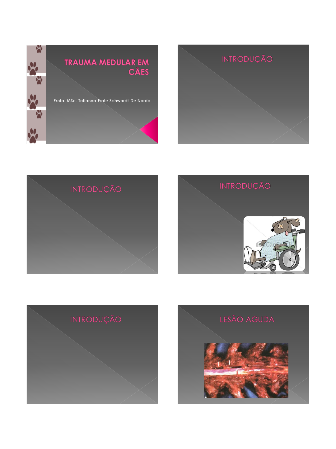 <p>28/06/2017</p><p>1</p><p> Distúrbio neurológico muito comum!</p><p> Muito grave!</p><p> Consequências desatrosas</p><p>› Função motora e sensorial</p><p> Causas endógenas e exógenas</p><p> Endógenas</p><p>› Protrusão ou extrusão do disco</p><p>intervertebral, fraturas patológicas</p><p> Exógenas</p><p>› Traumas automobilísticos, projéteis e quedas</p><p> Incapacidade permanente?</p><p> Desafio na medicina humana e na</p><p>veterinária</p><p> Lesão primária X secundária</p><p>28/06/2017</p><p>2</p><p> Destruição tecidual gradativa</p><p>› Produtos tóxicos da degradação de</p><p>hemácias</p><p>› Lesões vasculares</p><p>› Hipoperfusão</p><p>› Radicais livres</p><p>› Apoptose</p><p> NA DÚVIDA IMOBILIZE!!</p><p> Lesões só aparecem após a melhora do</p><p>quadro sistêmico</p><p> Localização baseada em NMs</p><p> Nocicepção é o fator mais importante</p><p>para o prognóstico</p><p> Palpação cuidadosa: desníveis</p><p> Diagnóstico</p><p>› Radiografias</p><p> Aproximadamente 25% não aparece no raio-x</p><p> SEMPRE RADIOGRAFAR A COLUNA INTEIRA!</p><p> 20% tem dois locais acometidos</p><p> 50% outras lesões (contusão pulmonar,</p><p>uroabdomen, hemoperitônio)</p><p> Sempre 2 projeções</p><p> Pode ter ocorrido contusão sem fratura</p><p> Tomografia computadorizada</p><p>› Melhor detalhe de ossos, fragmentos no</p><p>canal, processos articulares</p><p>› Presença de hemorragia</p><p> Ressonância Magnética</p><p>› Melhor detalhe tecidos moles</p><p>› Lesões extradurais</p><p> Protocolos</p><p>adotados da</p><p>medicina</p><p> EMERGÊNCIA!!</p><p> Tempo: fator crítico</p><p>na limitação da</p><p>degeneração e</p><p>necrose do tecido</p><p>neuronal!!</p><p>28/06/2017</p><p>3</p><p> ABC do trauma</p><p> Manter PA estável</p><p>› Evitar a hipoperfusão!</p><p>› Ressucitação hemodinâmica</p><p> Analgesia</p><p> Tratamento cirúrgico?</p><p>› Evidencias de instabilidade vertebral</p><p>› Evidências de compressão medular</p><p>› Ausência de dor profunda</p><p> Tratamento conservador?</p><p>› Presença de dor profunda</p><p>› Sem instabilidade</p><p> Glicocorticóides</p><p>› Uso controverso</p><p>› Succinato sódico de metilprednisolona</p><p> 30 mg/kg IV - 2 aplicações ( primeiras 8 horas</p><p>após trauma)</p><p> Analgesia (opióides)</p><p> Tratamento conservador</p><p> Paciente ainda se locomove</p><p> Repouso 4 a 6 semanas</p><p> Bandagem externa</p><p> Micção, defecação</p><p> Mudar decúbito a cada 3 horas</p><p>28/06/2017</p><p>4</p><p> Cama acolchoada, seca</p><p> Compressão vesical (diazepam ou</p><p>prazosina para relaxamento de</p><p>esfíncter)</p><p> Urinálise e urocultura (ATB)</p><p> Fisioterapia passiva e após, ativa</p><p> Tratamento cirúrgico</p><p>› Estabilização/alinhamento</p><p> Para maior conforto do animal, uso do</p><p>carrinho, e eliminar a dor</p><p> Possibilidade de recuperação X Expectativa</p><p>proprietário</p><p> Custo alto</p><p> Complicações da cirurgia</p><p> Migração de pino, sepse, piora do quadro</p><p> Desenvolvimento de eventos vasculares,</p><p>bioquímicos e inflamatórios danos</p><p>irreversíveis ao parênquima neuronal</p><p> Tratamento emergencial</p><p>› Risco de sequelas e incapacidade</p><p>permanente</p><p> Doenças não oriundas do SNC, porém</p><p>com sinais clínicos neurológicos</p><p>28/06/2017</p><p>5</p><p> Discos são estruturas de</p><p>conteúdo gelatinoso, que</p><p>conectam as vértebras e</p><p>absorvem impactos</p><p> Localizados em todos os corpos</p><p>vertebrais (exceto C1 e C2 –</p><p>atlas e axis e sacrais)</p><p> Extrusão do material discal – Hansen tipo</p><p>I – raças condrodistróficas</p><p> Protrusão do material discal – Hansen</p><p>tipo II – raças grandes ou não</p><p>condrodistróficas</p><p> Hérnia de disco: deslocamento de uma parte do</p><p>disco intervertebral</p><p> Causa comum de distúrbio neurológico em cães</p><p> Raras em felinos</p><p> Hansen tipo I – Aguda ???</p><p> Hansen tipo II - Crônica</p><p> Extrusão discal (Hansen I)</p><p>› Degeneração do núcleo pulposo que se</p><p>inicia entre 6 e 7 meses de vida</p><p>› Assintomático até que o núcleo pulposo é</p><p>extraído (> 2 anos)</p><p>› Raças condrodistróficas</p><p>› Localização mais comum: T 11 a L3</p><p>28/06/2017</p><p>6</p><p> Hansen Tipo I – Extrusão</p><p> Sinais clínicos</p><p>› Agudo?</p><p>› DOR, DOR, DOR!!</p><p>› Episódios intermitentes de dor</p><p>› Ataxia e paresia</p><p>› Paraplegia</p><p> Grau I: dor ao se locomover</p><p> Grau II: Paresia com propriocepção</p><p>diminuída</p><p> Grau III: Paresia sem locomoção</p><p> Grau IV: Paraplegia</p><p> Grau V: Distúrbios de micção, perda de</p><p>dor superficial</p><p> Grau VI: Perda de dor profunda</p><p> Diagnóstico</p><p>› TC – mielotomografia</p><p>› RM - Auxilia a descartar outras doenças</p><p> Médico ou conservador</p><p> Pacientes I, II, III......</p><p> Restrição de movimentos!! (de</p><p>verdade....) – no mínimo 3 semanas</p><p>› Caixa de transporte/ gaiola</p><p> Anti-inflamatórios</p><p>› Prednisona: 0,5 mg/kg sid - bid</p><p>› Carprofeno/meloxicam ?</p><p>› CONFINAMENTO E CORTICOESTERÓIDES</p><p>MELHORAM ATÉ 85-90% CÃES COM</p><p>PARESIA!!!!</p><p> Relaxamento muscular: metocarbamol</p><p>20-40 mg/kg BID</p><p> Diazepam: 0,5 mg/kg BID</p><p> Gabapentina 10 mg/kg BID-TID</p><p> Clor. Tramadol 2-8 mg/kg BID</p><p>28/06/2017</p><p>7</p><p> Cães paraplégicos</p><p>› Compressão vesical – mínimo 3x dia</p><p>› Sondagem? Cultura e antibiograma</p><p>› Cama bem acolchoada, limpa e seca</p><p>› Fisioterapia ativa e passiva</p><p>› USO DE CORTICOESTERÓIDES SEM</p><p>CONFINAMENTO É ABSOLUTAMENTE</p><p>CONTRA-INDICADO, DEVIDO A MELHORA</p><p>CLÍNICA DO ANIMAL!</p><p>› AINES E AIES NUNCA DEVEM SER</p><p>COMBINADOS</p><p> Cirúrgico</p><p>› Dor incontrolável</p>